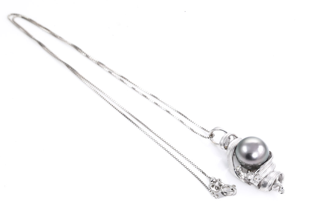 Pearl and Diamond pendant with Tahitian Pearl of 11.2mm and round Diamonds totalling 0.10cts. 18ct white gold with 44cm 18ct white gold adjustable chain. Weight: 8.4g. (Pre-owned)