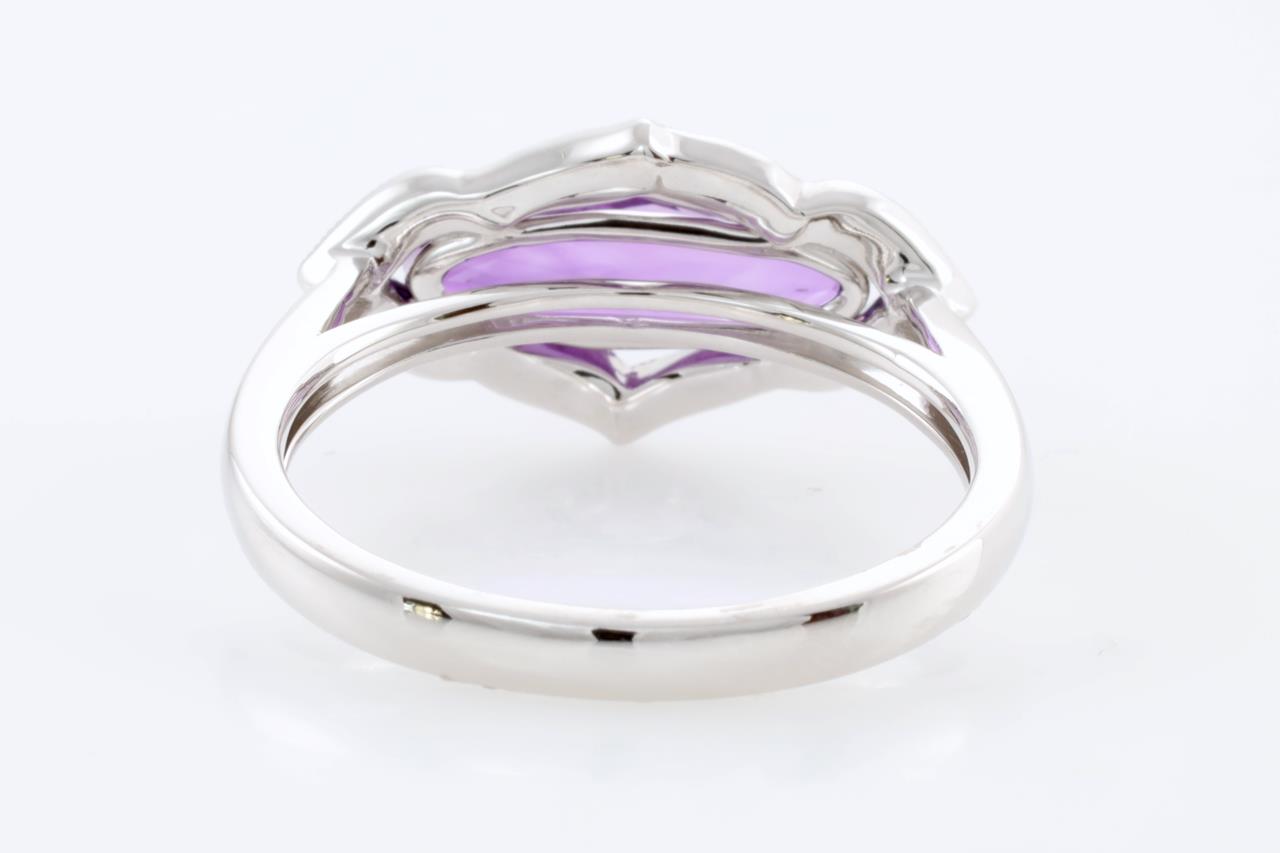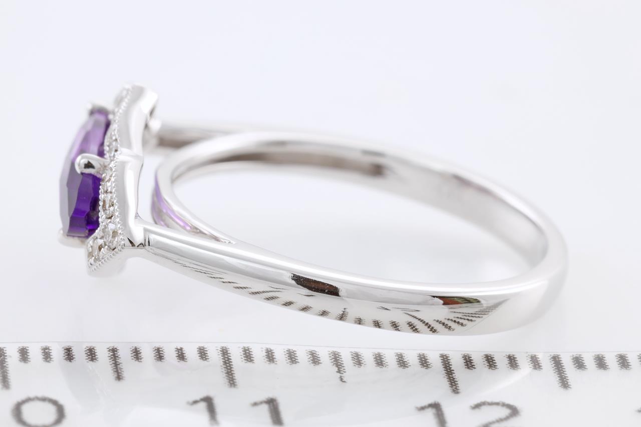 Amethyst and Diamond ring with oval checkerboard cut Amethyst of 1.13ct and Diamonds totalling 0.18cts. 14ct white gold. Ring size N1/2 - It is not recommended to resize this ring. Weight: 3.2g (New)