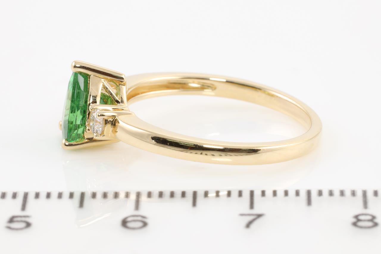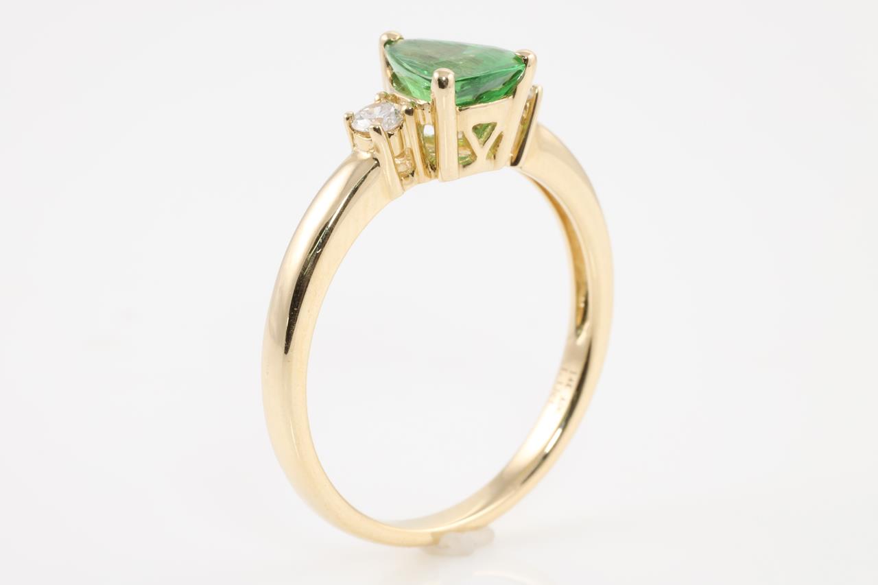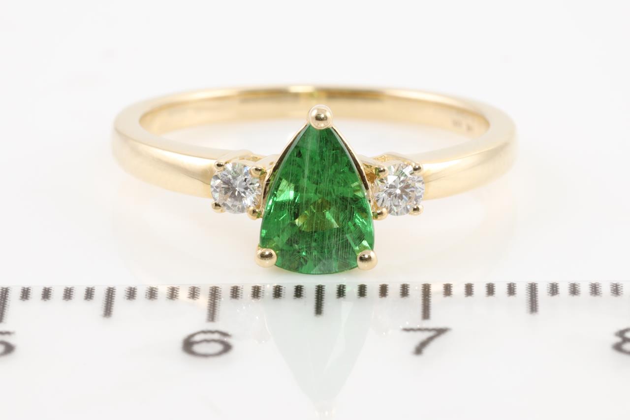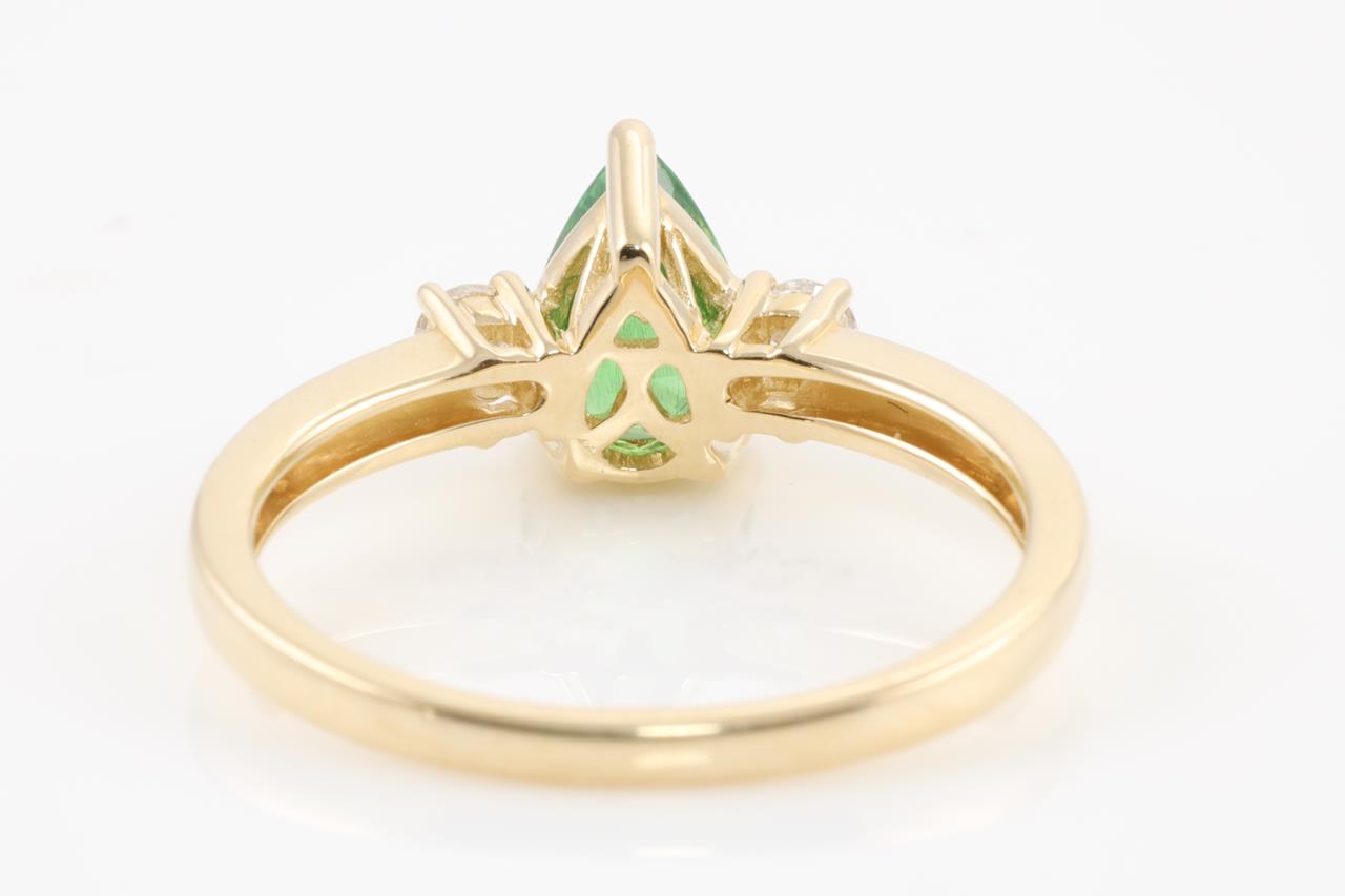 Tsavorite and Diamond ring with pear shape Tsavorite Garnet of 1.13ct and 2 round Diamonds totalling 0.13cts. 14ct yellow gold. Ring size N1/2. Weight: 2.8g (Pre-owned)