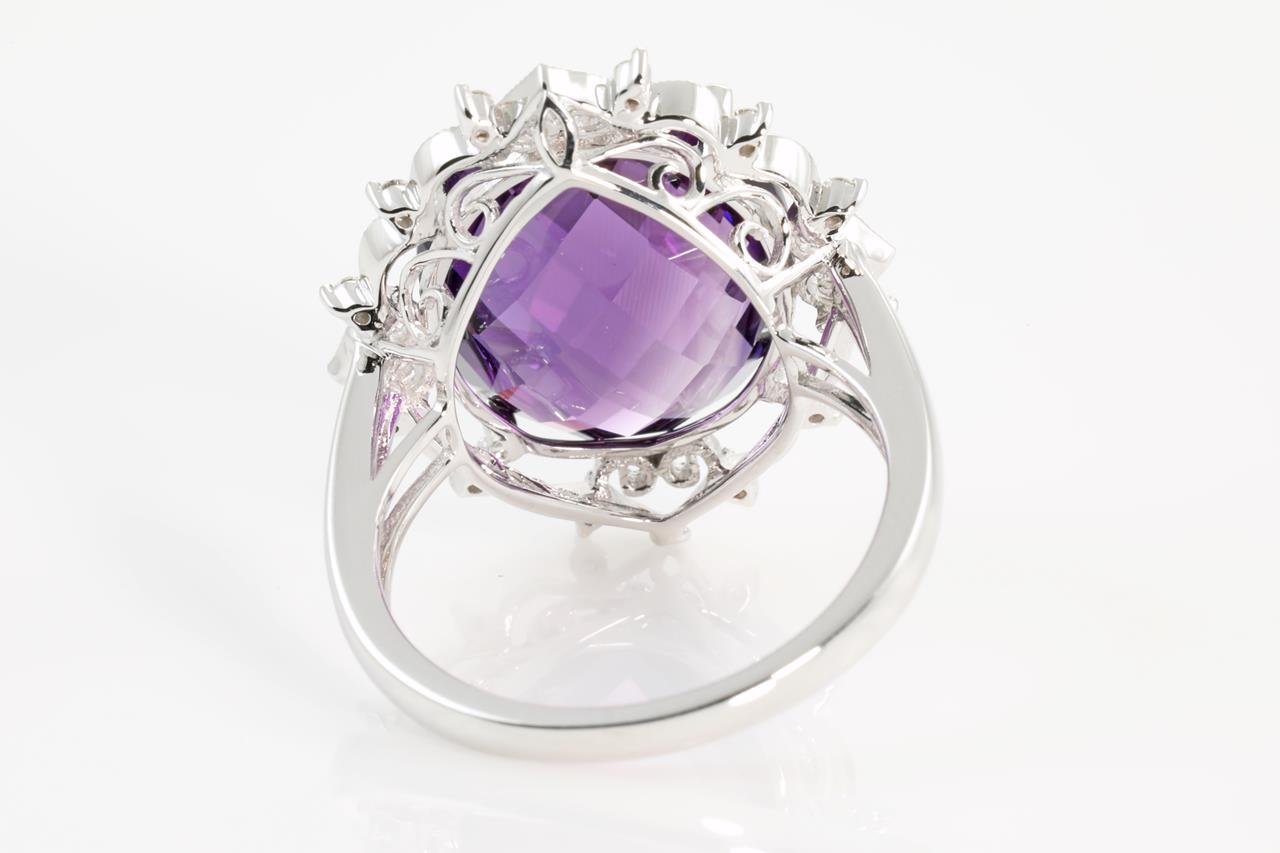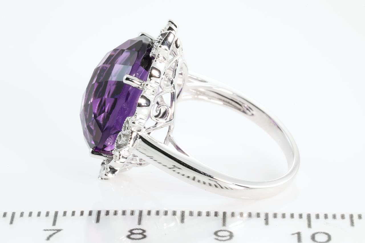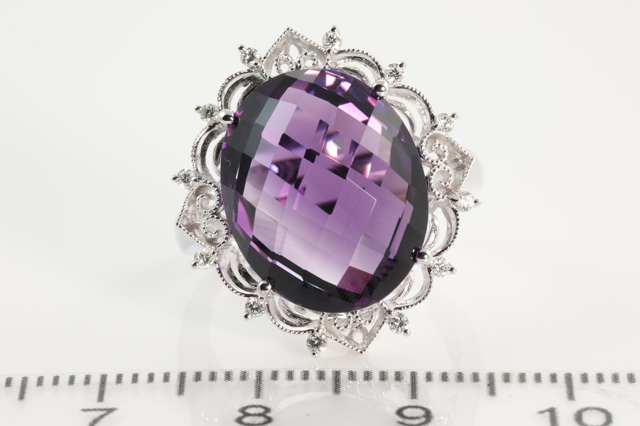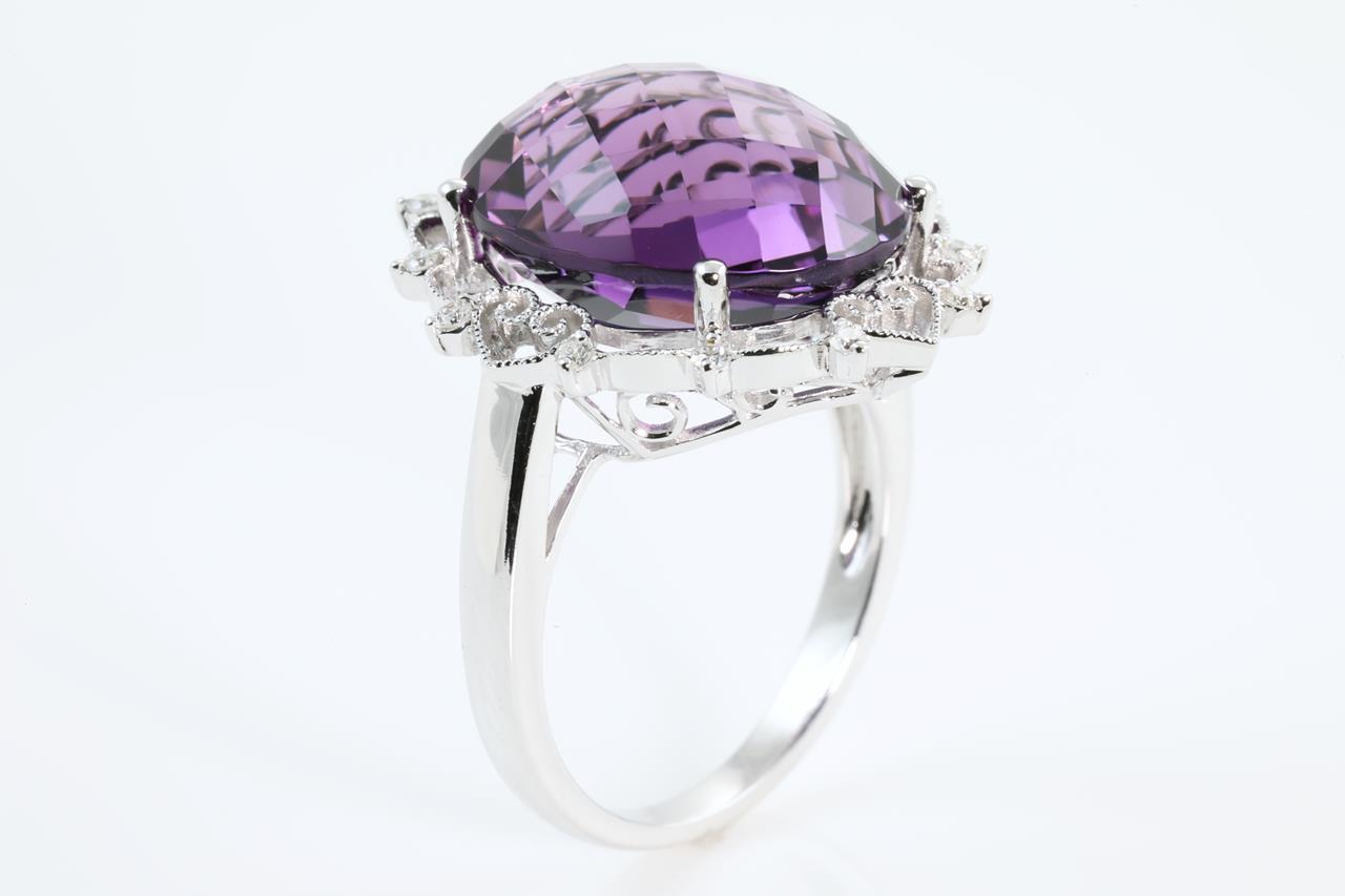 Amethyst and Diamond ring with oval checkerboard cut Amethyst of 11.44ct and Diamonds totalling 0.12cts. 14ct White gold. Ring size N1/2 - ring resizing up is not recommended, can only be resized down with ring clip. Weight: 6.4g (New)