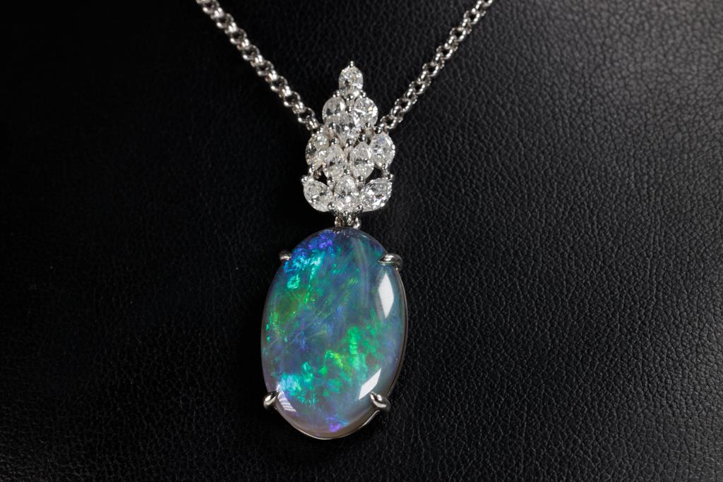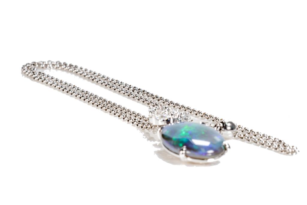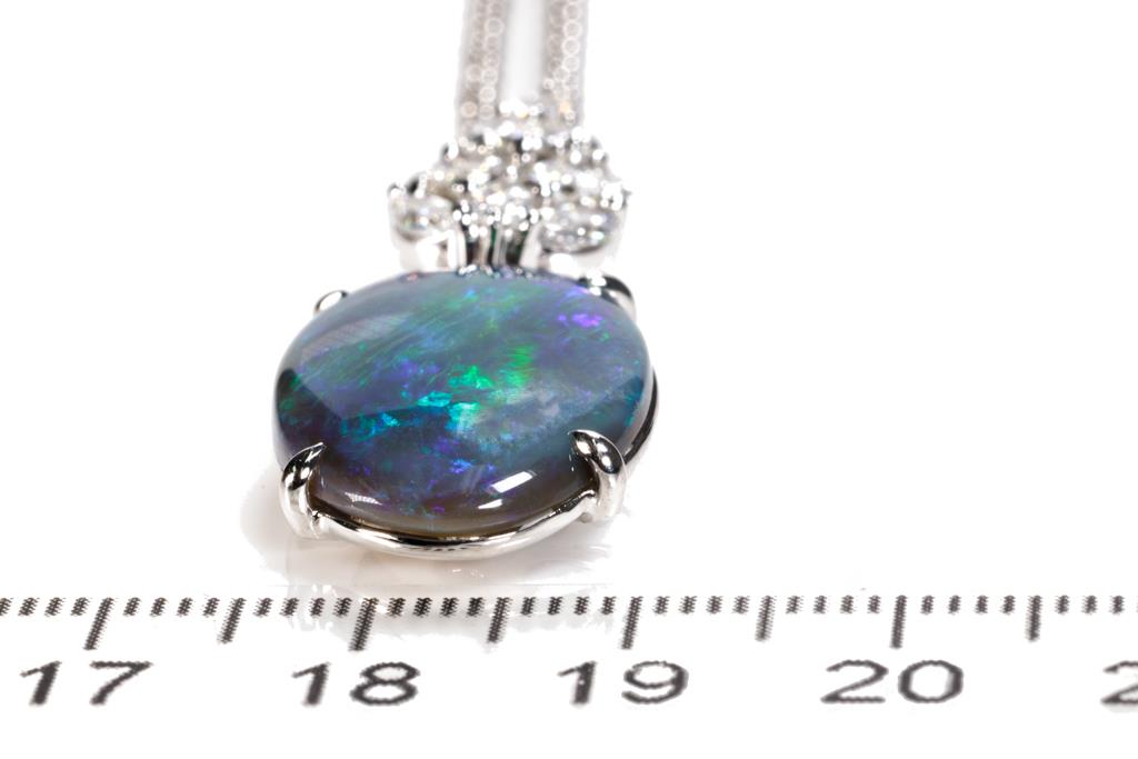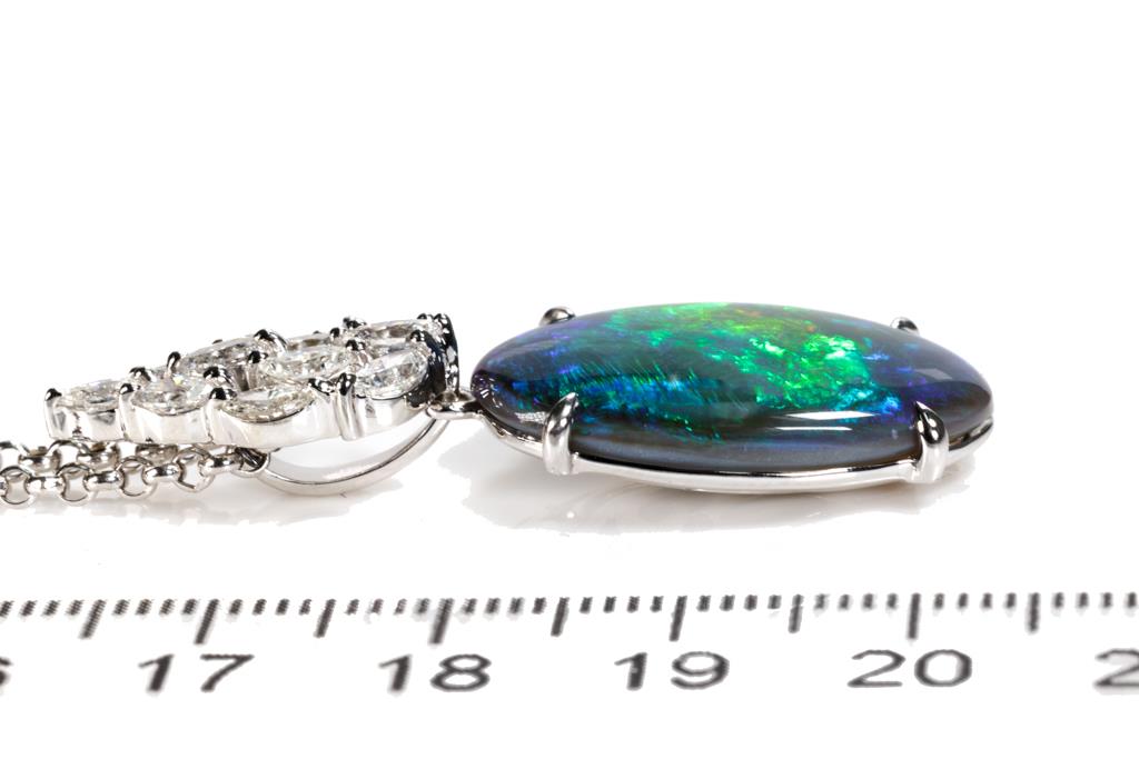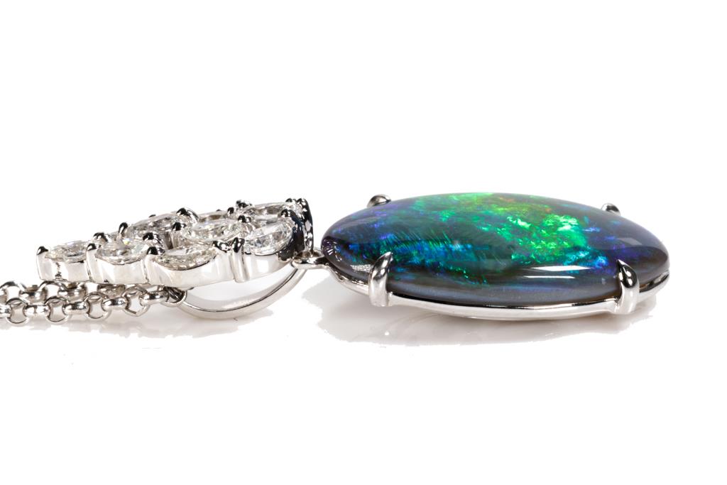 Opal and Diamond pendant with Black Opal of 11.45ct and marquise cut Diamonds totalling 1.41cts (Estimated grading: G-H SI). 18ct white gold with 18ct white gold adjustable 44cm chain. Weight: 10.3g. With Certificate #415888. (Pre-owned)