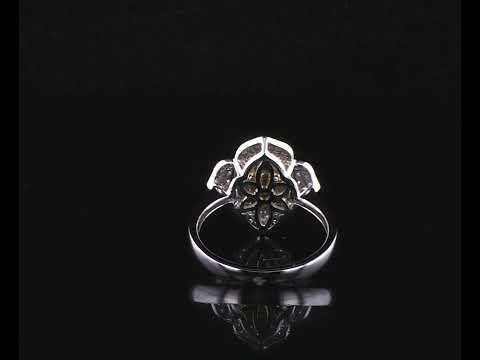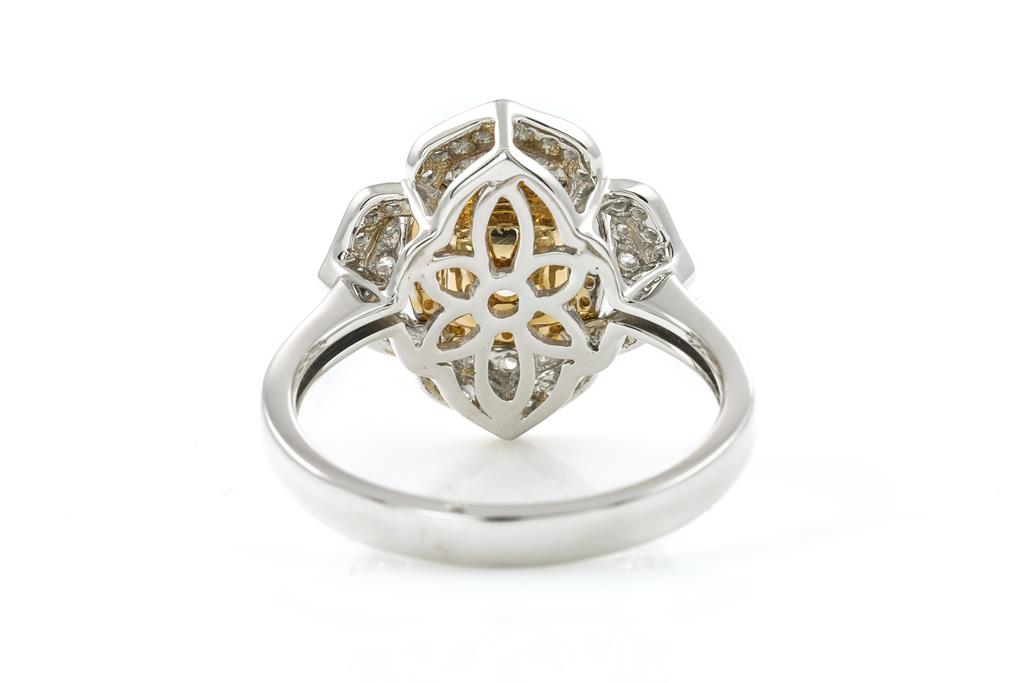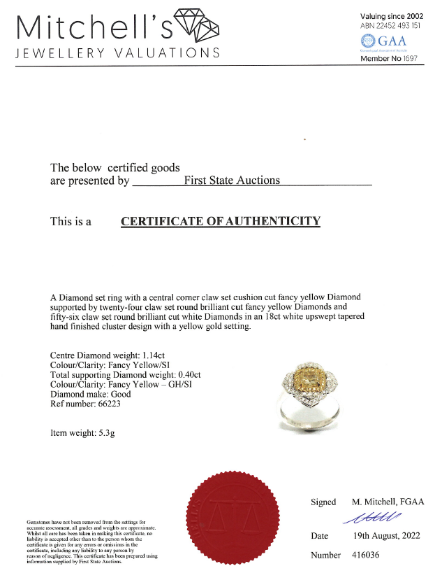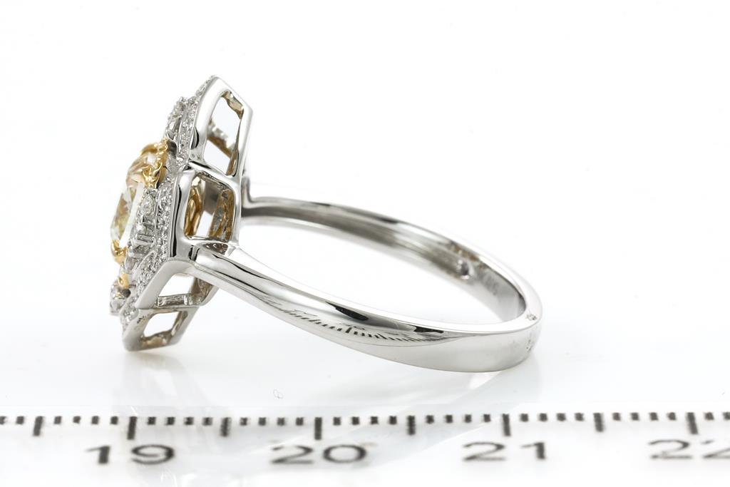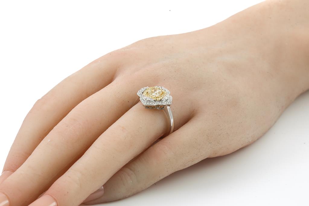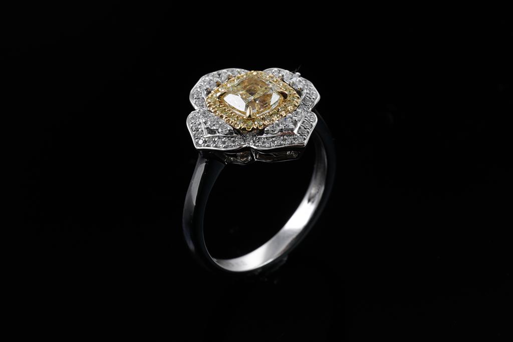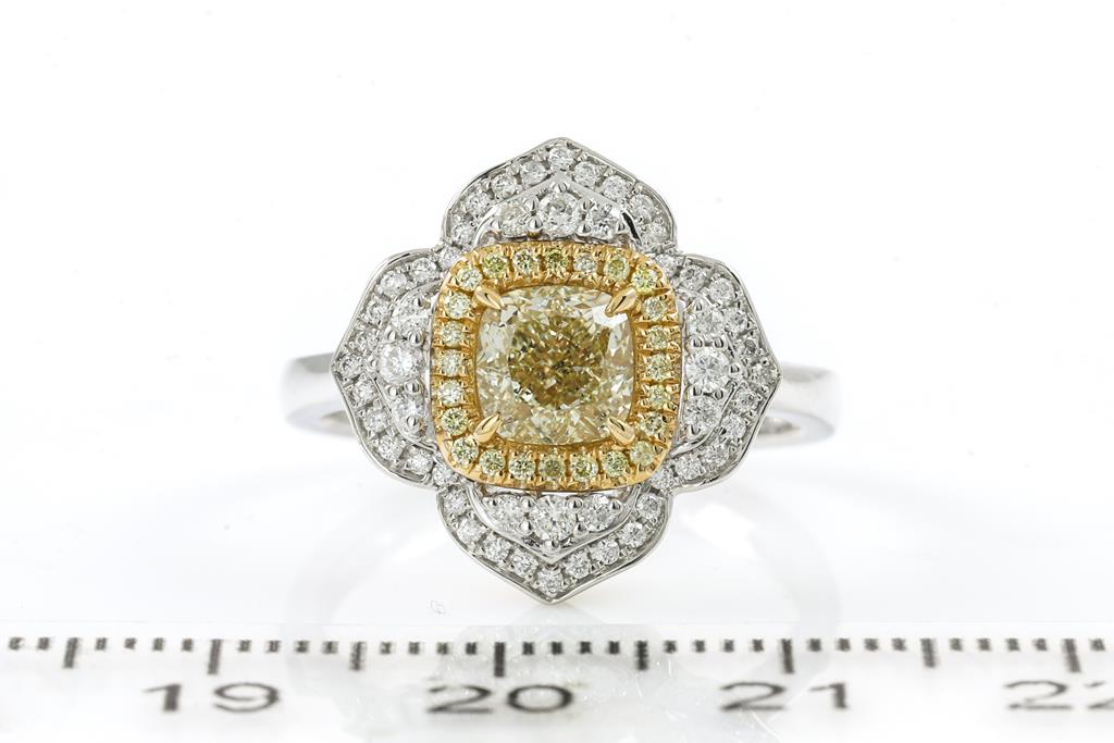Diamond dress ring with centre cushion cut Diamond of 1.14ct (Estimated grading: Fancy Yellow SI) and surrounding round Diamonds totalling 0.40cts (Estimated grading: Fancy Yellow & G-H SI). 18ct yellow gold and white gold. Ring size N1/2 - ring resizing is recommended. Weight: 5.3g. With Certificate #416036. (As new)