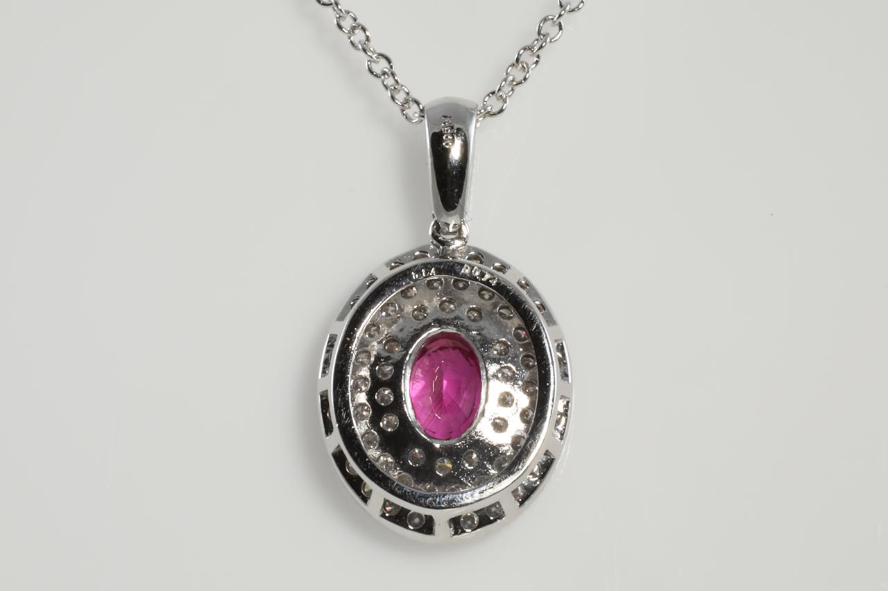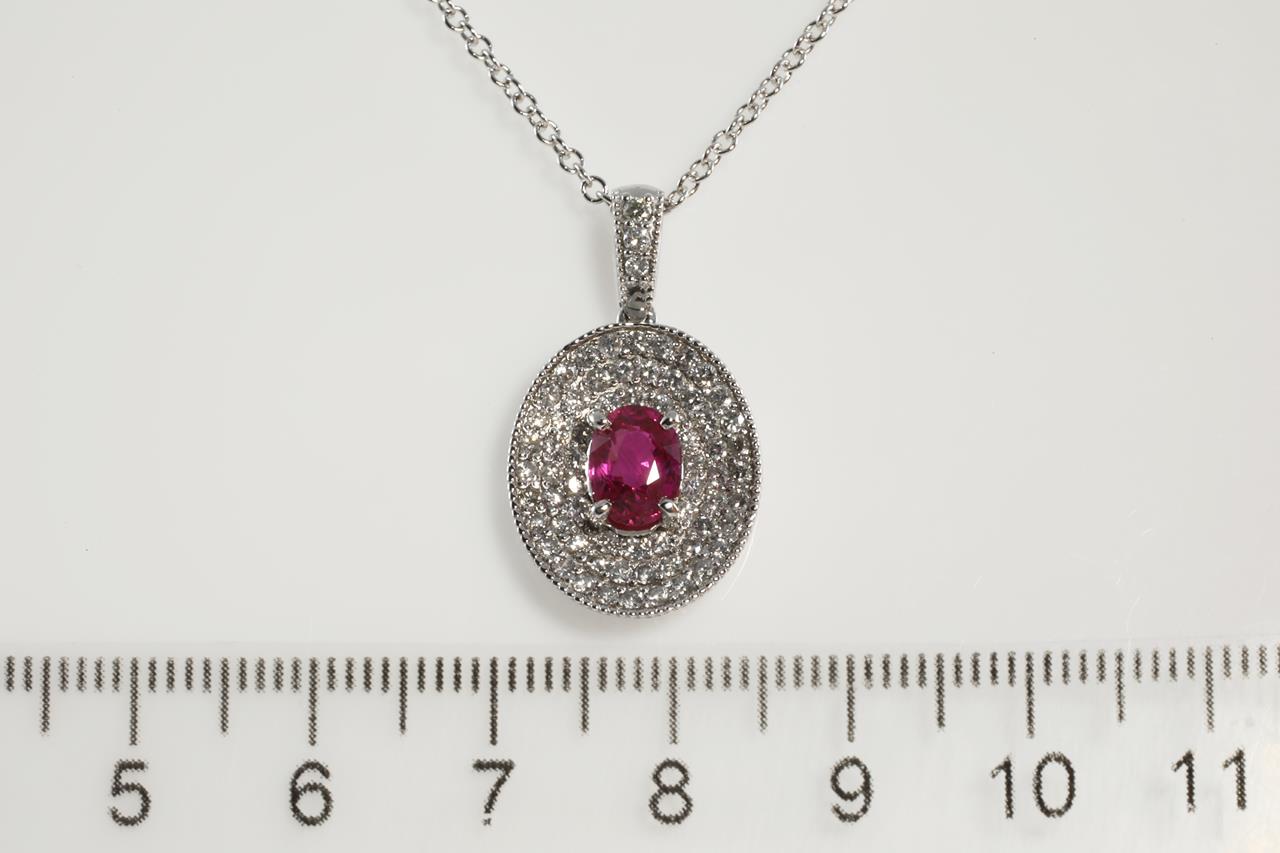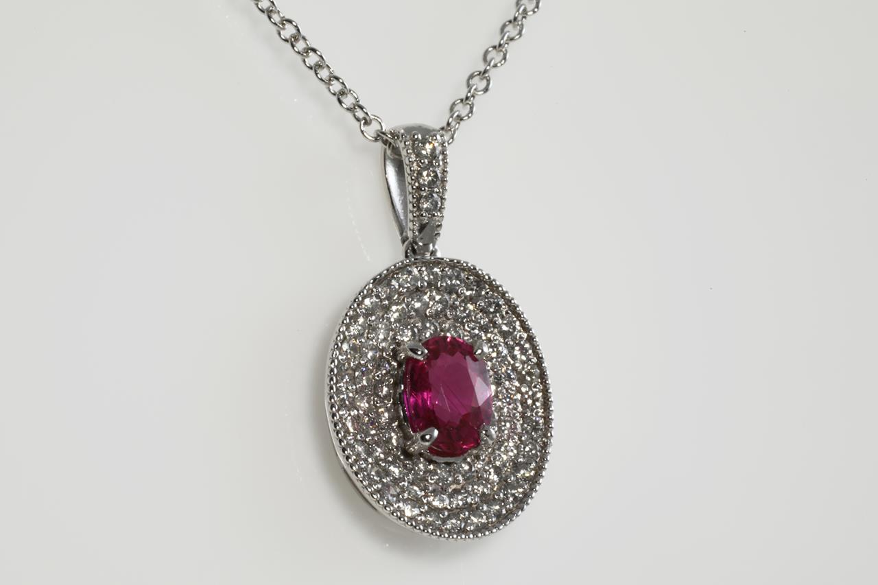 Ruby and Diamond pendant with oval Ruby of 1.14ct and Diamonds totalling 0.74cts (Estimated grading: G SI). Platinum with 18ct white gold 45cm chain. Weight: 4.6g (pre-owned)