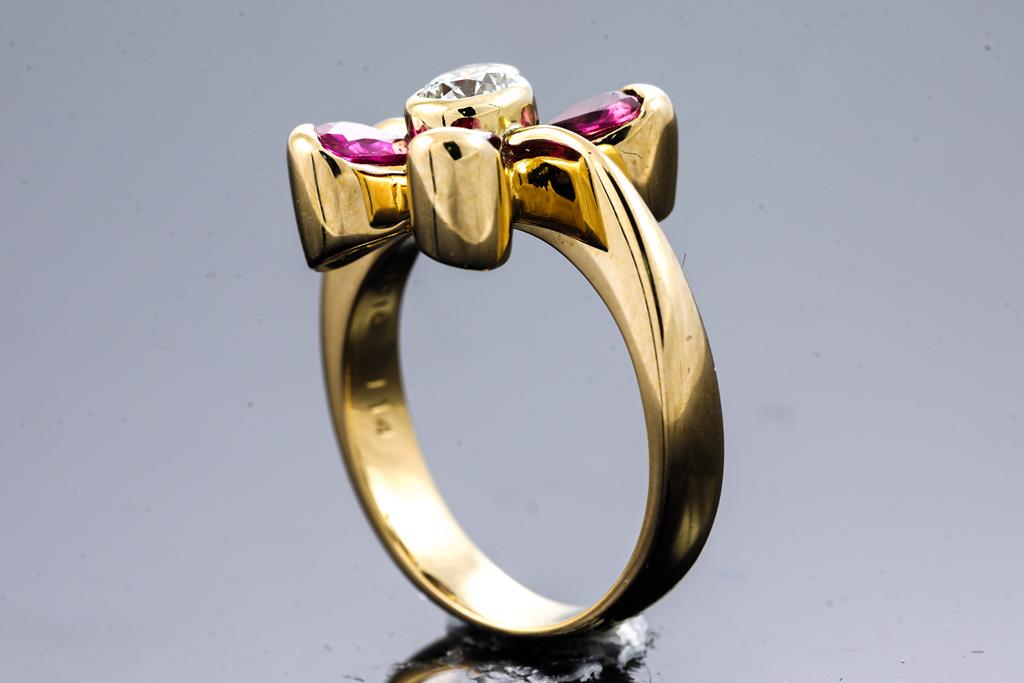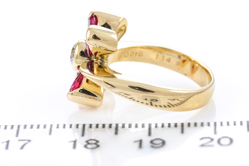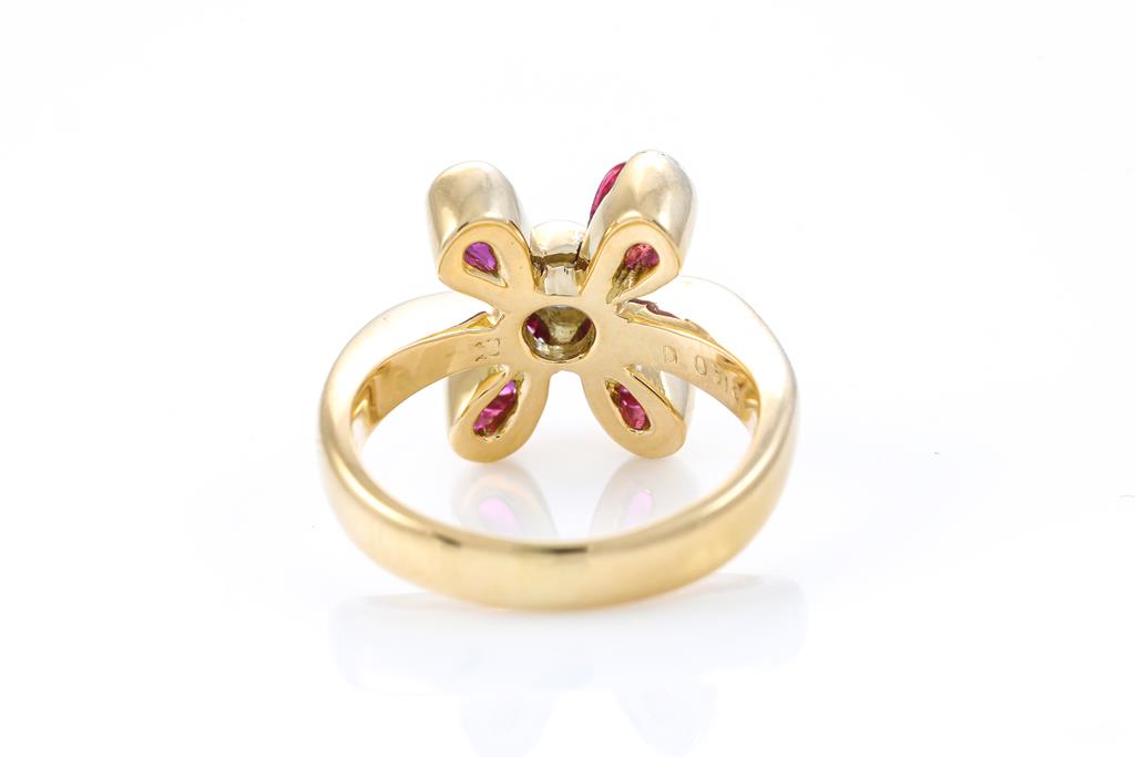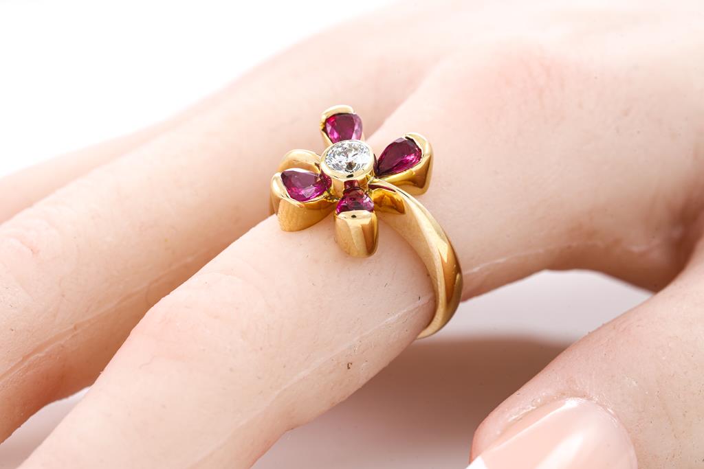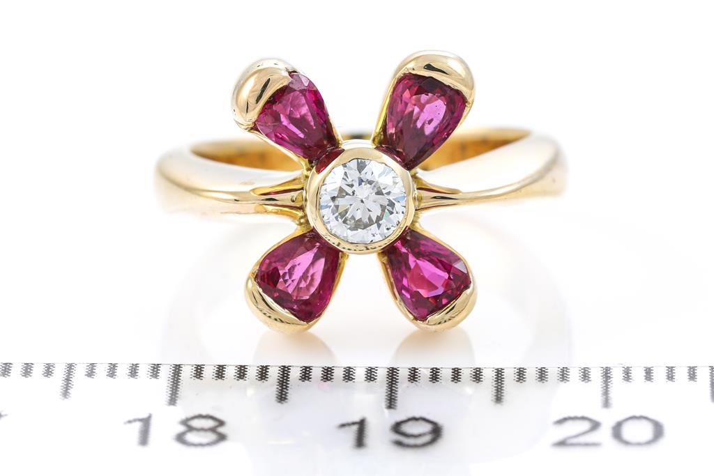Ruby and Diamond flower design ring with 4 pear shape Rubies totalling 1.14cts and one round Diamond of 0.31ct (Estimated grading: H SI2). 18ct yellow gold. Ring size K1/2. Weight: 8.2g. (Pre-owned)