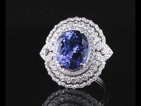 Tanzanite and Diamond ring with an oval shape Tanzanite of 11.53ct and round Diamonds totalling 1.67cts (Estimated grading: H-I SI). 18ct white gold. Ring size N. Weight: 12.3g. With Certificate #416189. (Pre-owned)