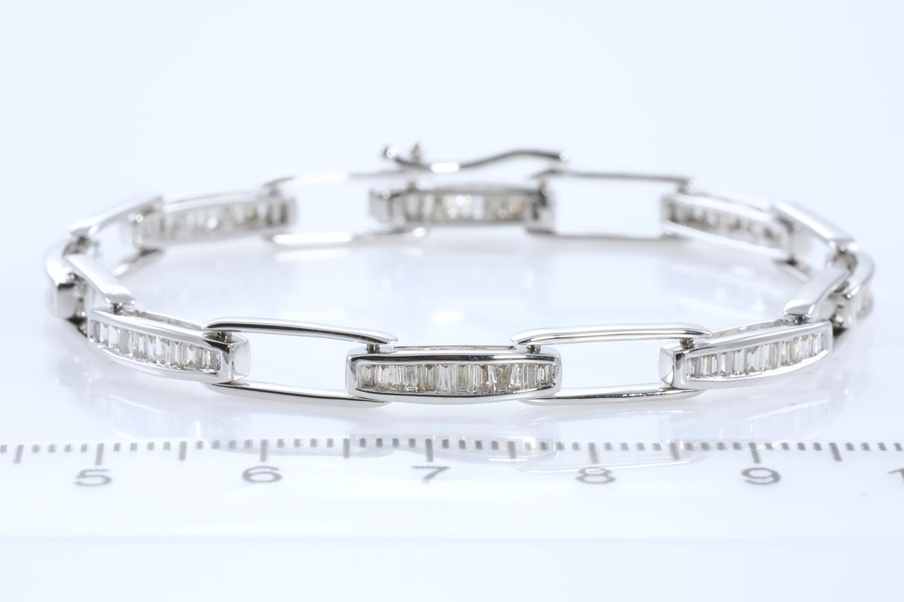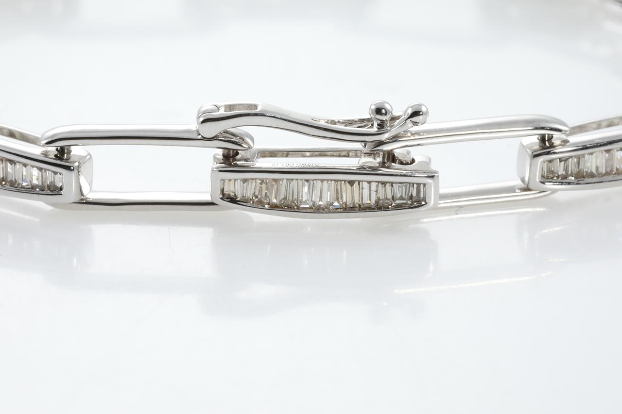 Diamond bracelet with baguette cut Diamonds totalling 1.15cts (Estimated grading: K-L, Faint Brown SI). 18ct white gold. Length:16cm. Weight:10.8g (Pre-owned)