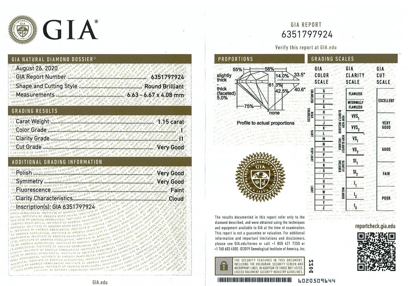 A loose round brilliant cut Diamond of 1.15ct (with GIA summary report graded as I I1 #6351797924). (As New)
