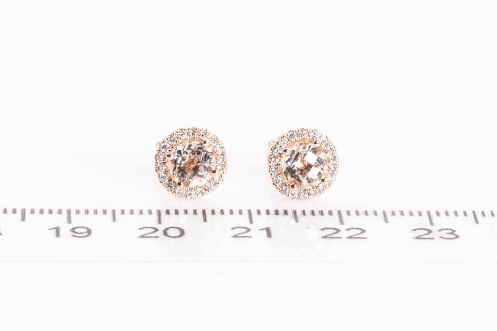 Morganite and Diamond earrings with round Morganite totalling 1.15cts and round Diamonds totalling 0.52cts (Estimated grading: H-I SI). 14ct rose gold. Weight: 1.9g. (New).