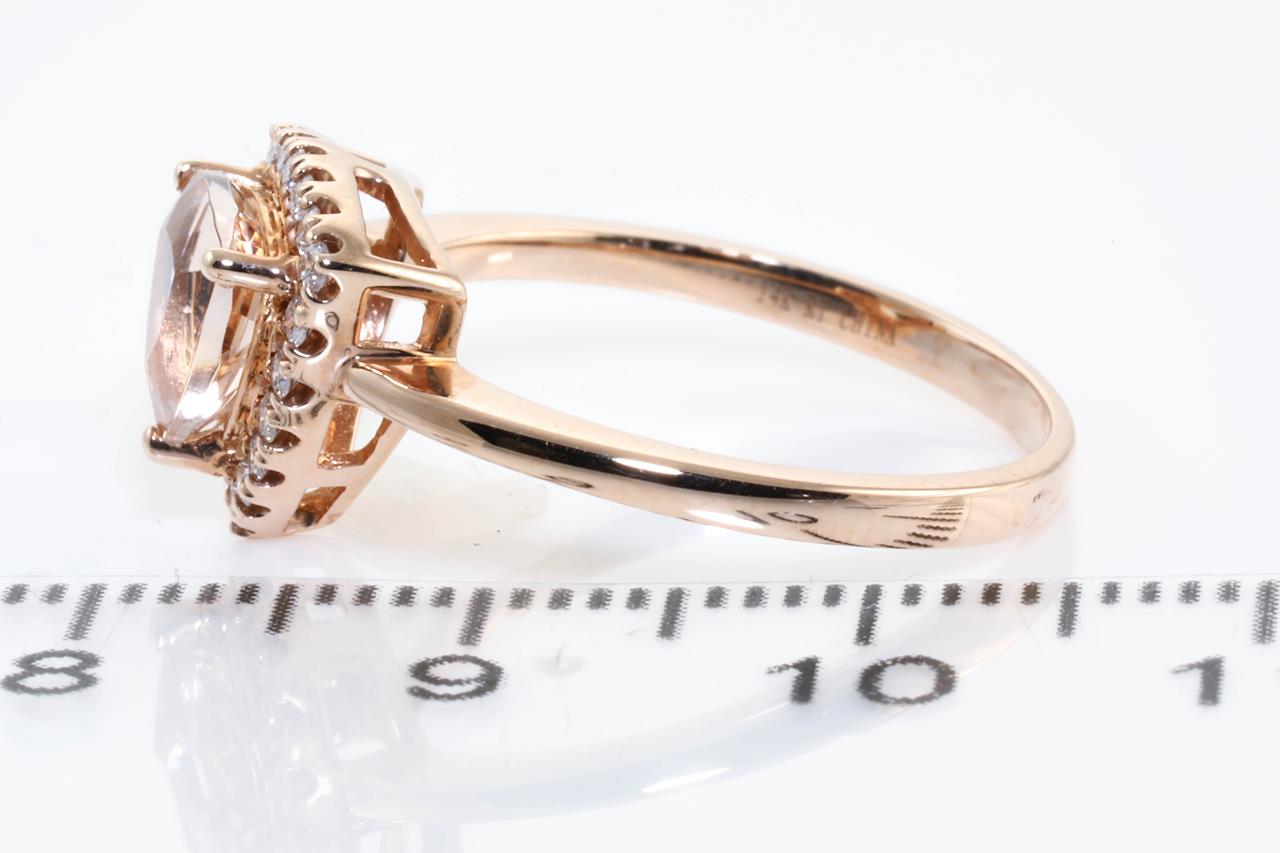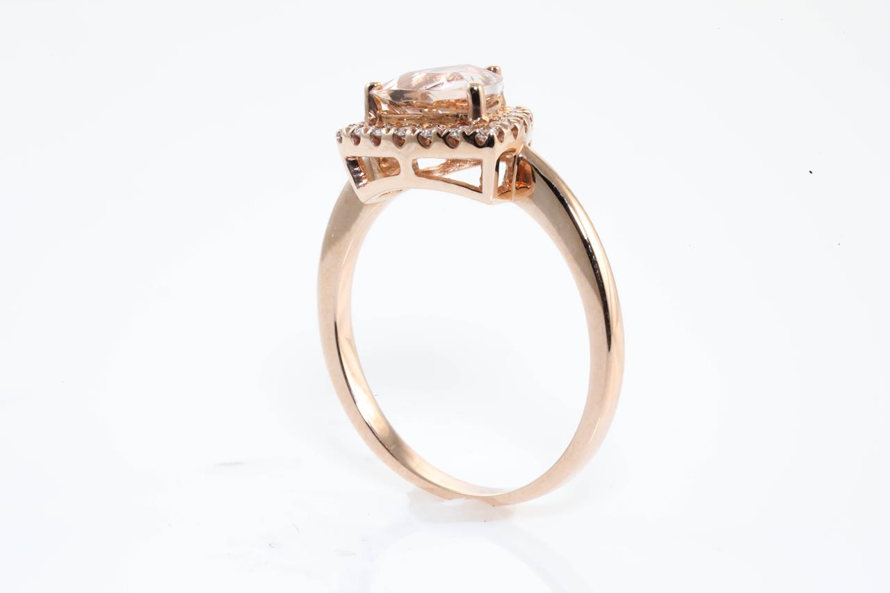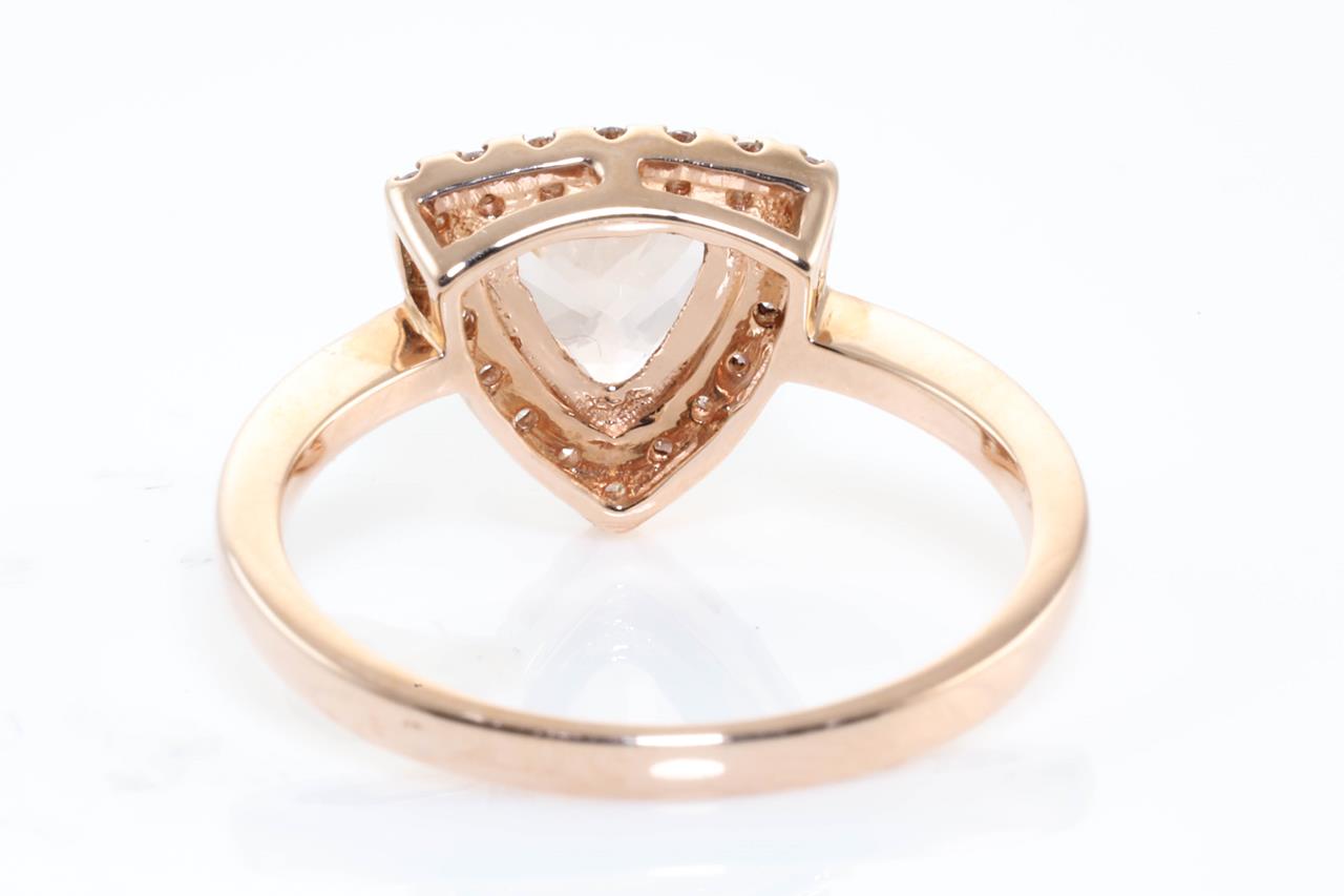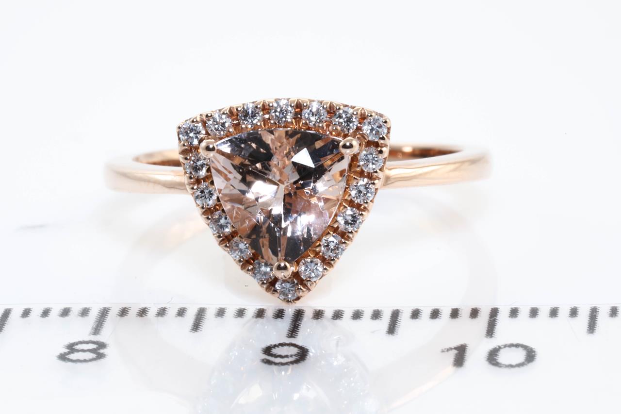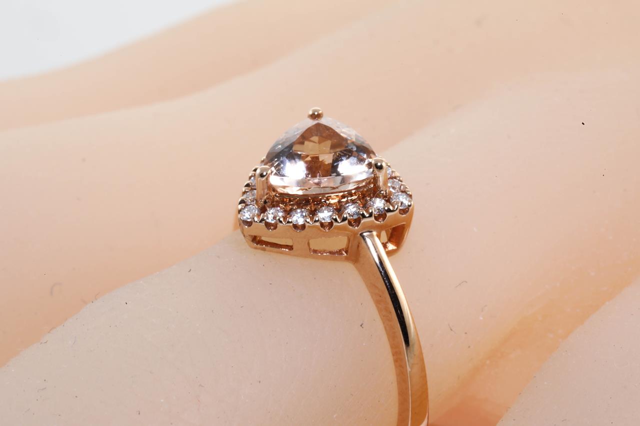 Morganite and Diamond ring with a trilliant cut Morganite of 1.15ct and Diamonds totalling 0.15cts. 14ct rose gold. Ring size N. Weight: 3g. (As new)