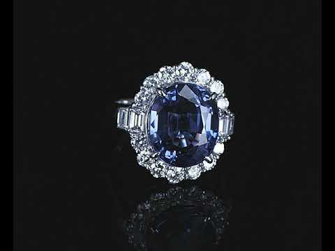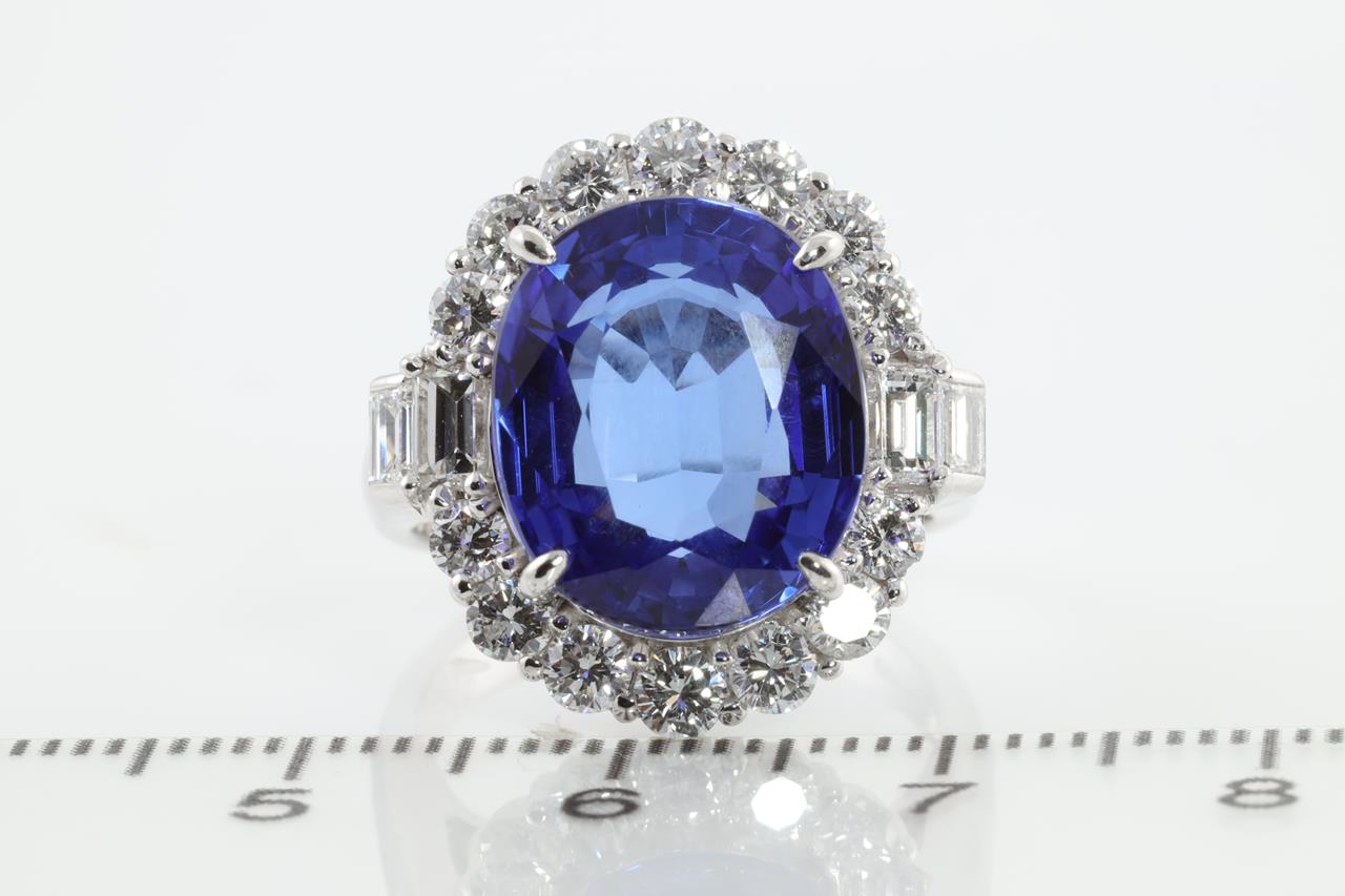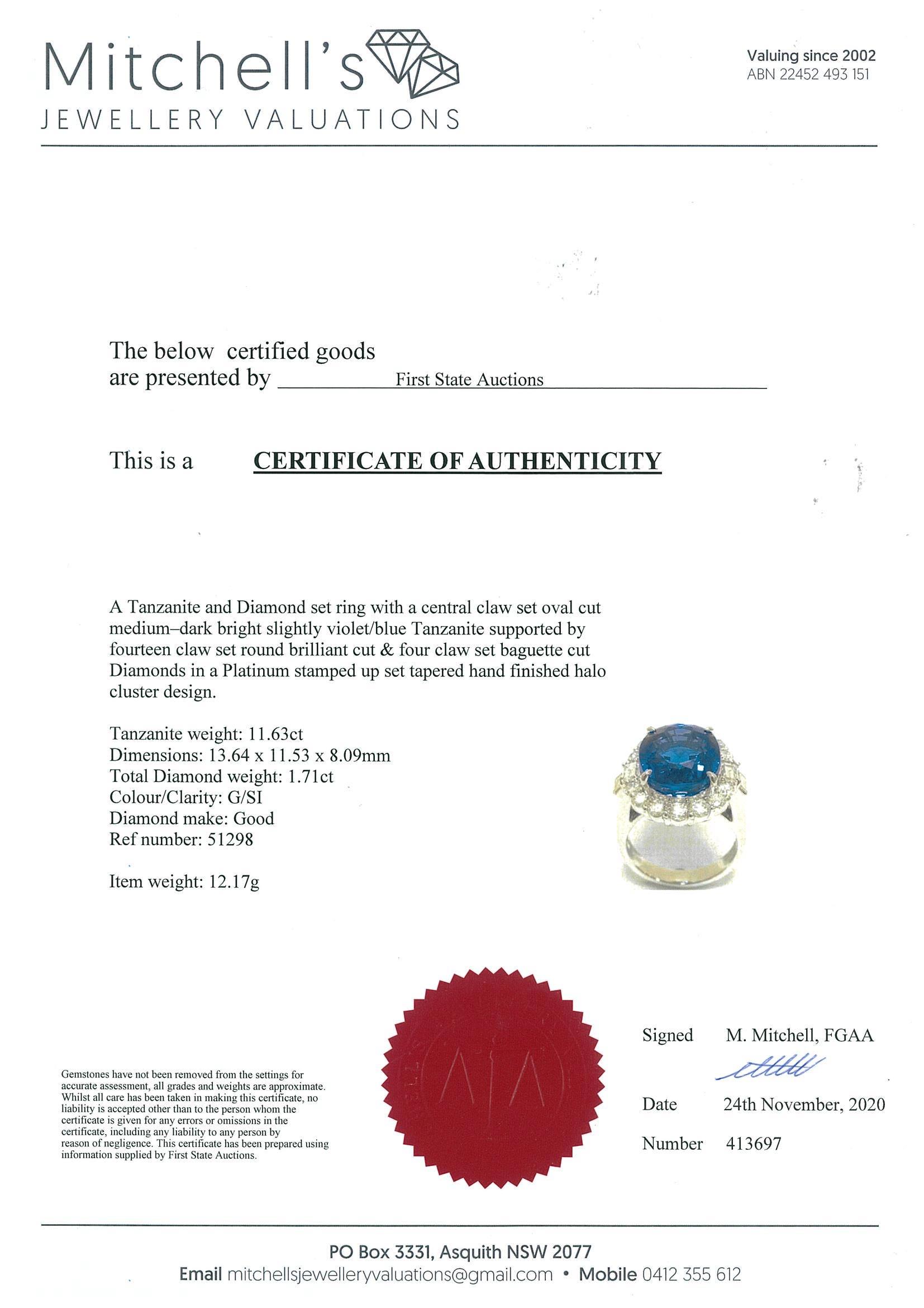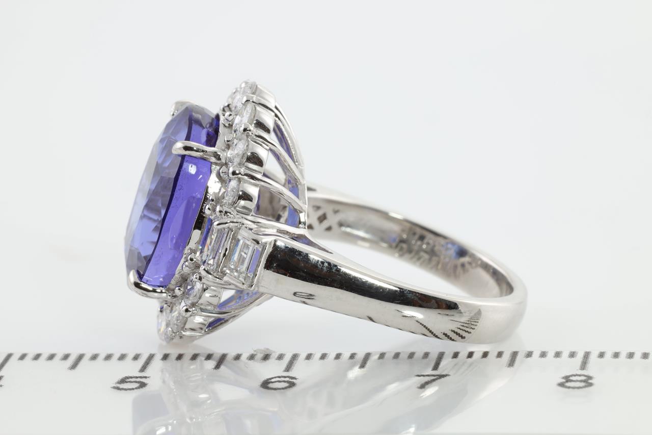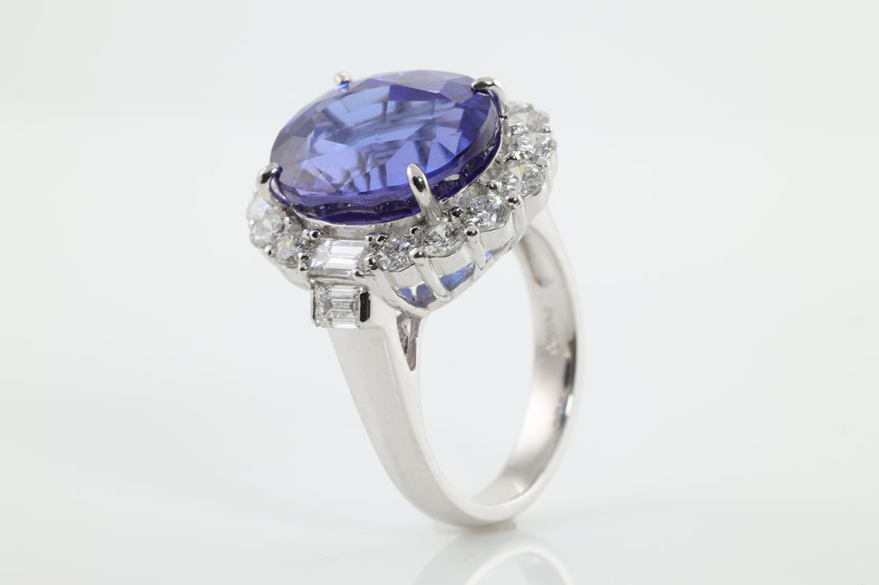 Tanzanite and Diamond ring with oval shape Tanzanite of 11.63ct and round & baguette cut Diamonds totalling 1.71cts (Estimated grading: G SI). Platinum. Ring size M. With certificate #413697. Weight: 12.2g (Pre-owned)