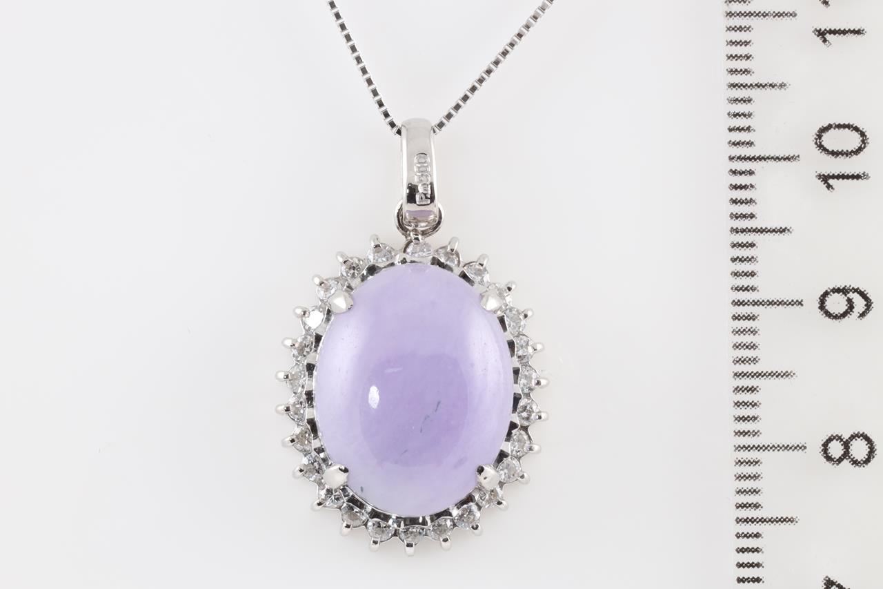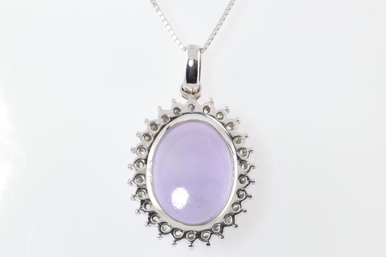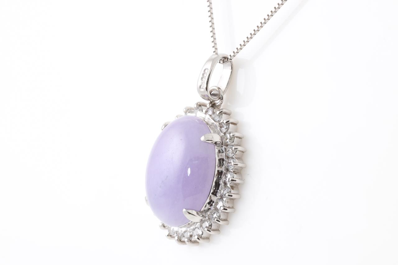 Jade and Diamond pendant with oval cabochon cut translucent light purple Natural Jadeite Jade of 11.68ct (with GEM Identification report #UBC 6201) and Diamonds totalling 0.69cts (Estimated grading: H SI). Platinum with platinum adjustable 45cm chain. Weight: 11.7g (Pre-owned)