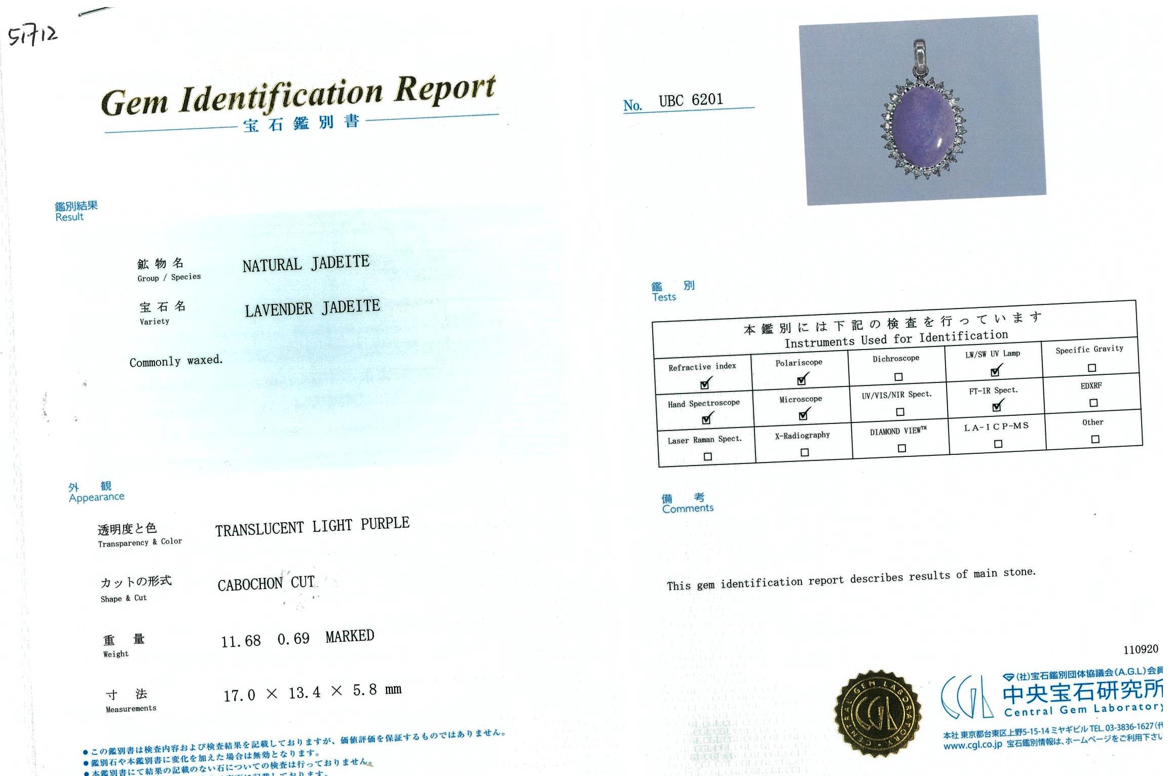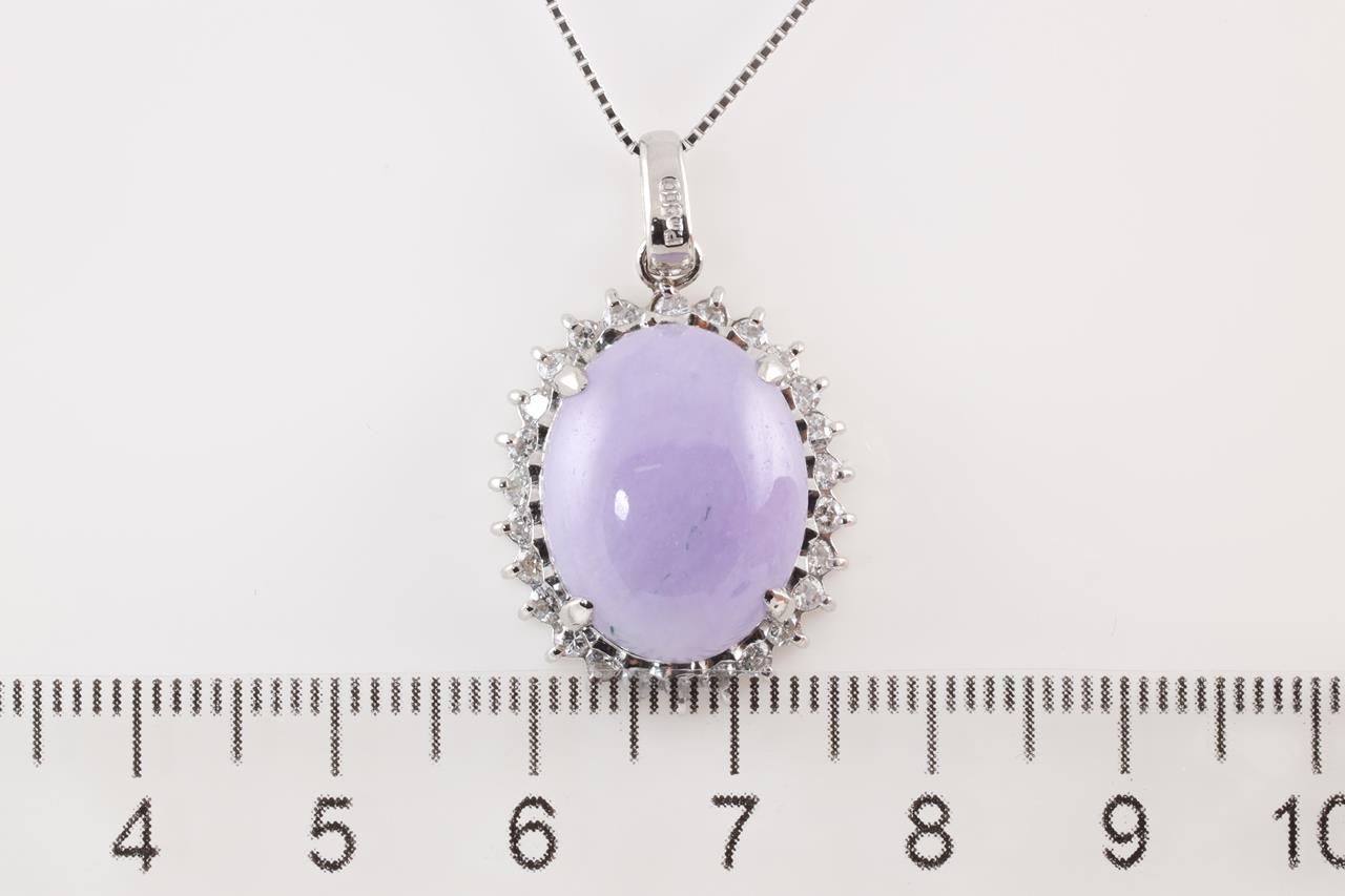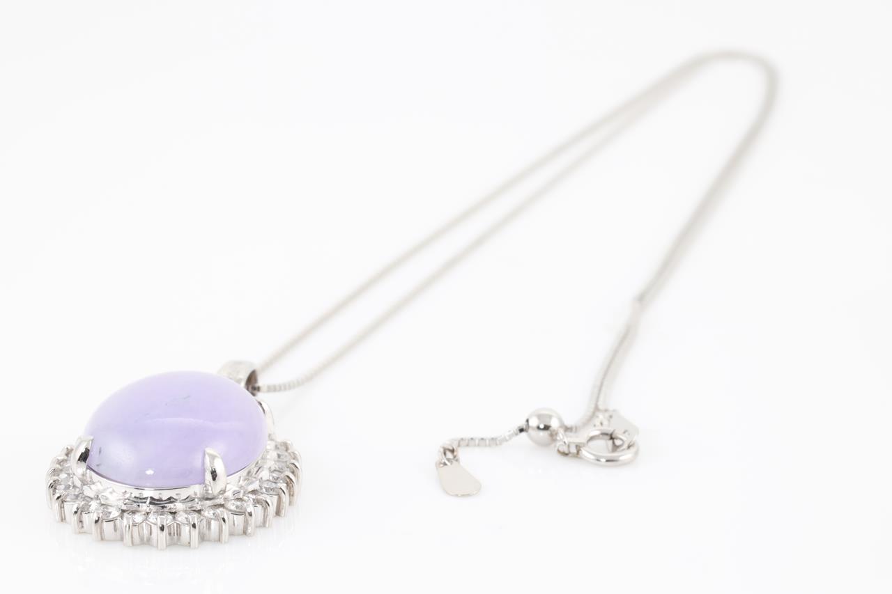 Jade and Diamond pendant with oval cabochon cut translucent light purple Natural Jadeite Jade of 11.68ct (with GEM Identification report #UBC 6201) and Diamonds totalling 0.69cts (Estimated grading: H SI). Platinum with platinum adjustable 45cm chain. Weight: 11.7g (Pre-owned)