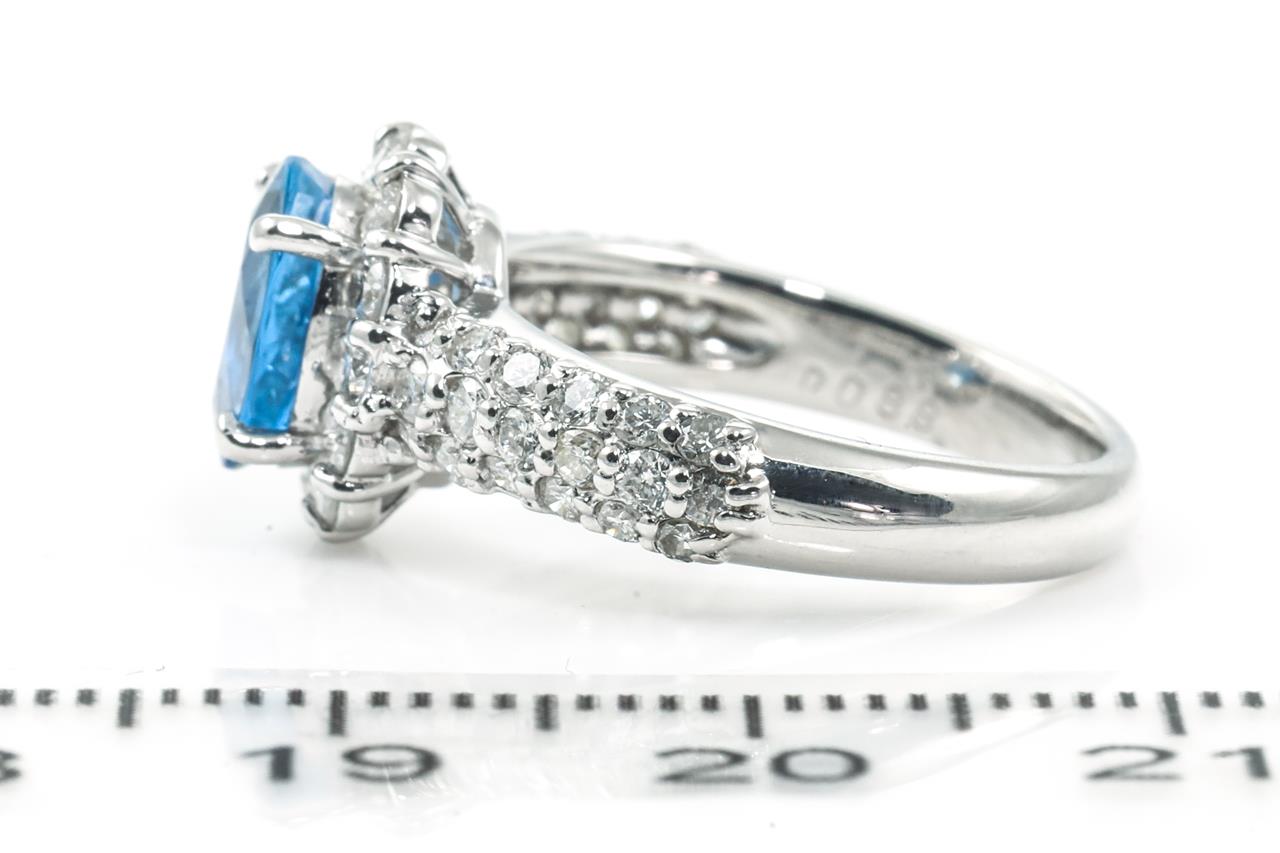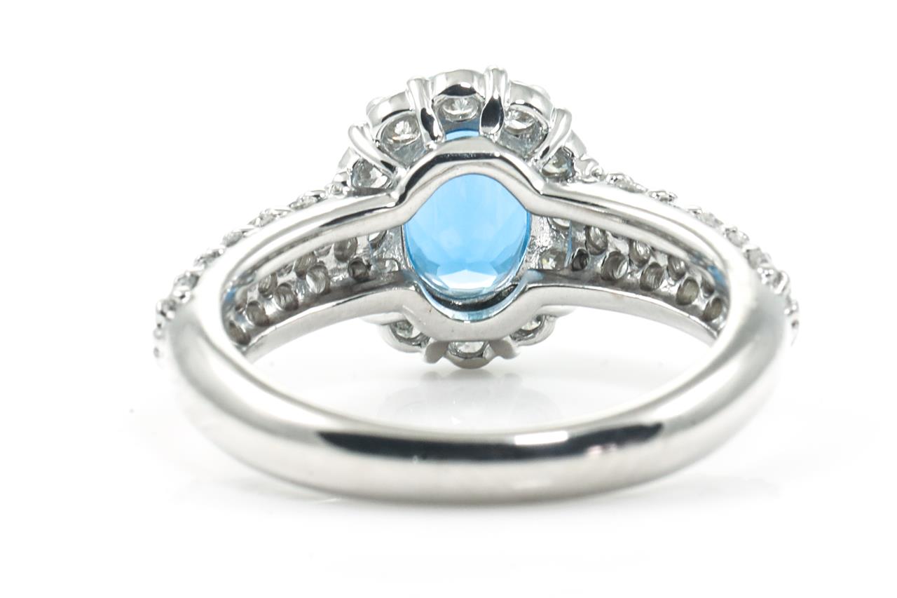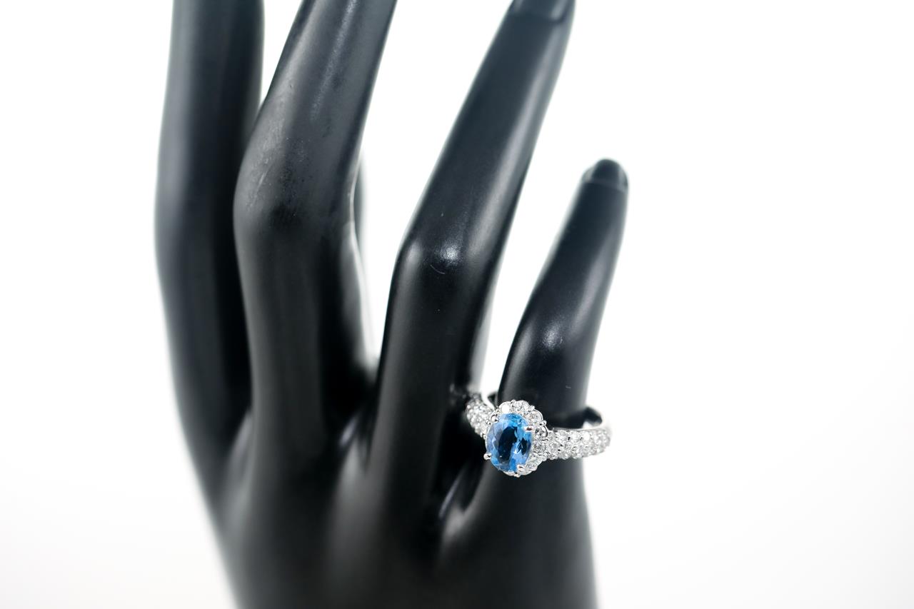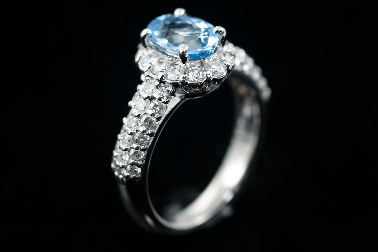 Aquamarine and Diamond ring with an oval shape Aquamarine of 1.16ct and round Diamonds totalling 0.88cts (Estimated grading: H-I SI). Platinum. Ring size J - can be resized up by a maximum of 3 sizes, down with ring clip. Weight: 6.8g (Pre-owned)