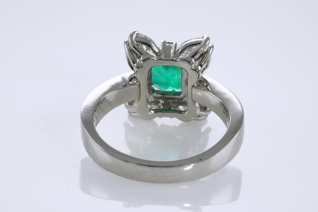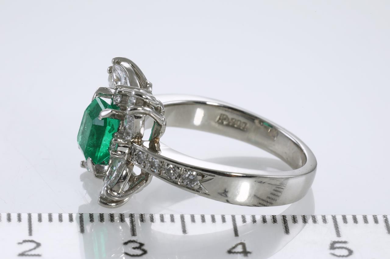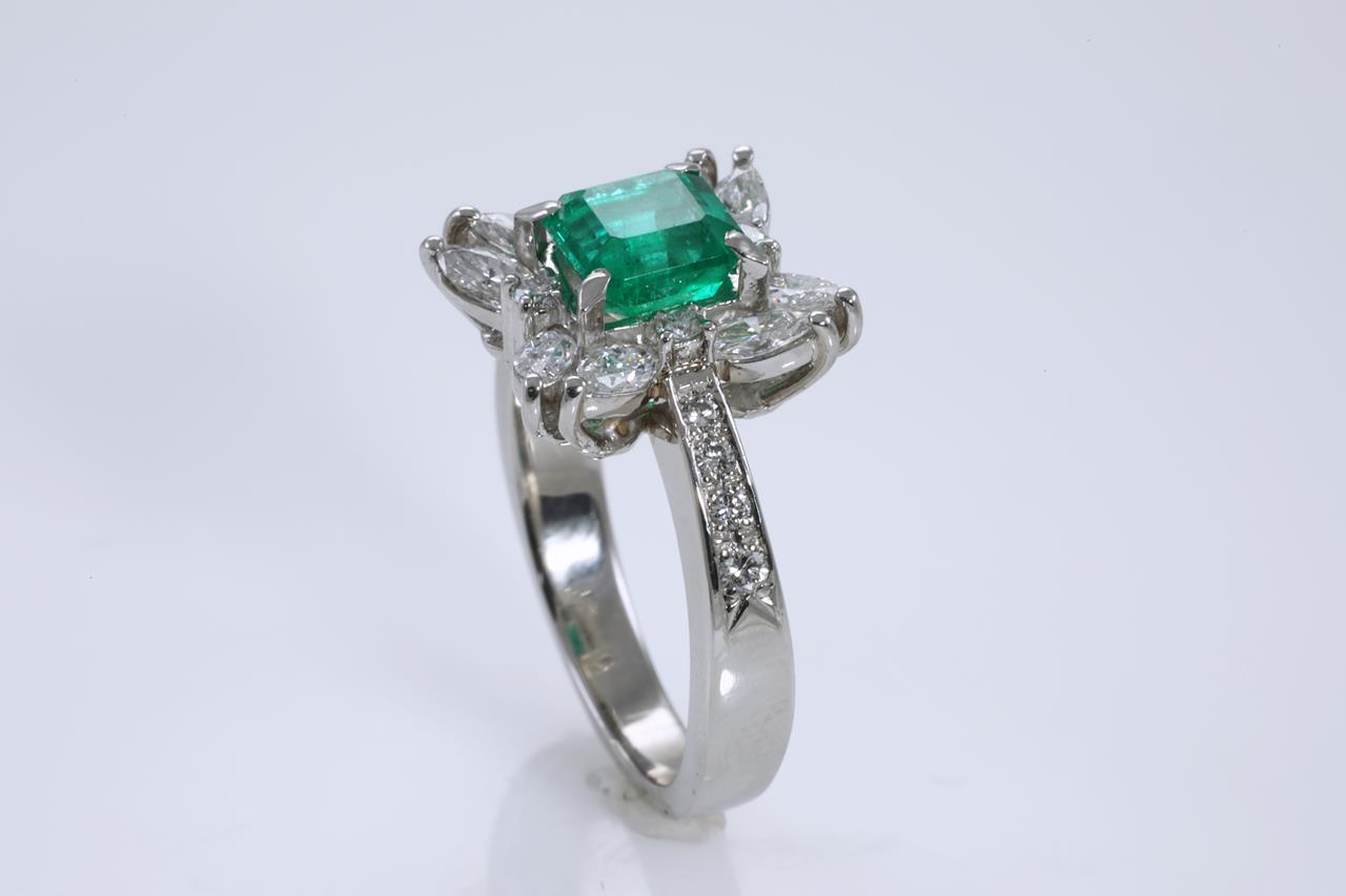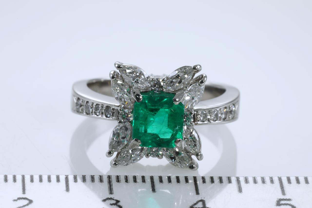 Emerald and Diamond ring with an emerald cut Emerald of 1.16ct (With Gem Identification Report, UBA 9365) and marquise and round Diamonds totalling 1.00cts (Estimated grading: G-H VS-SI). Platinum. (Pre-owned)