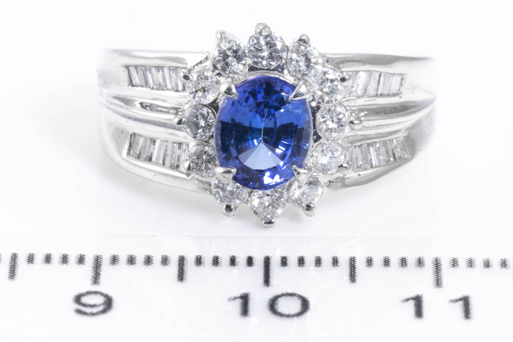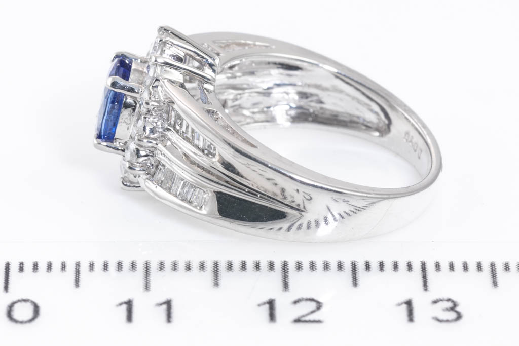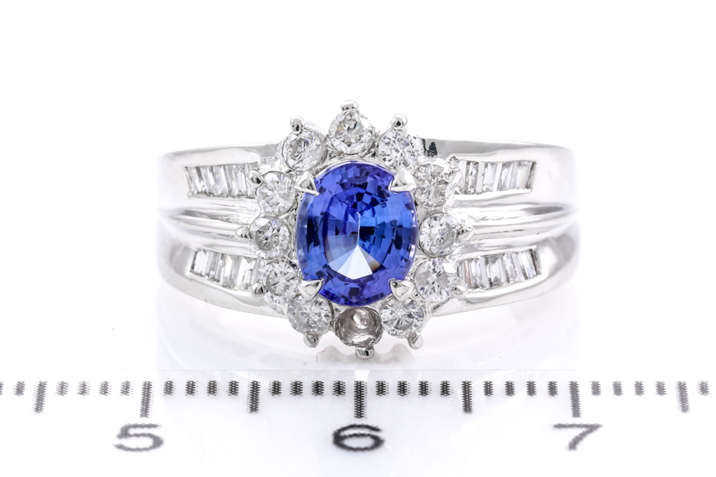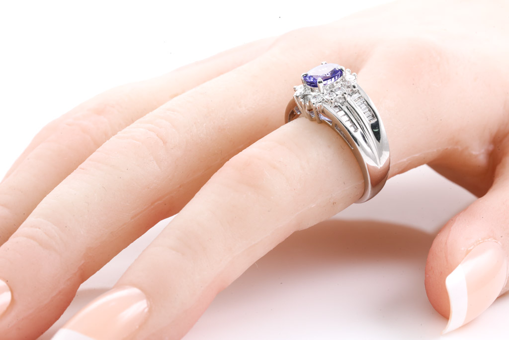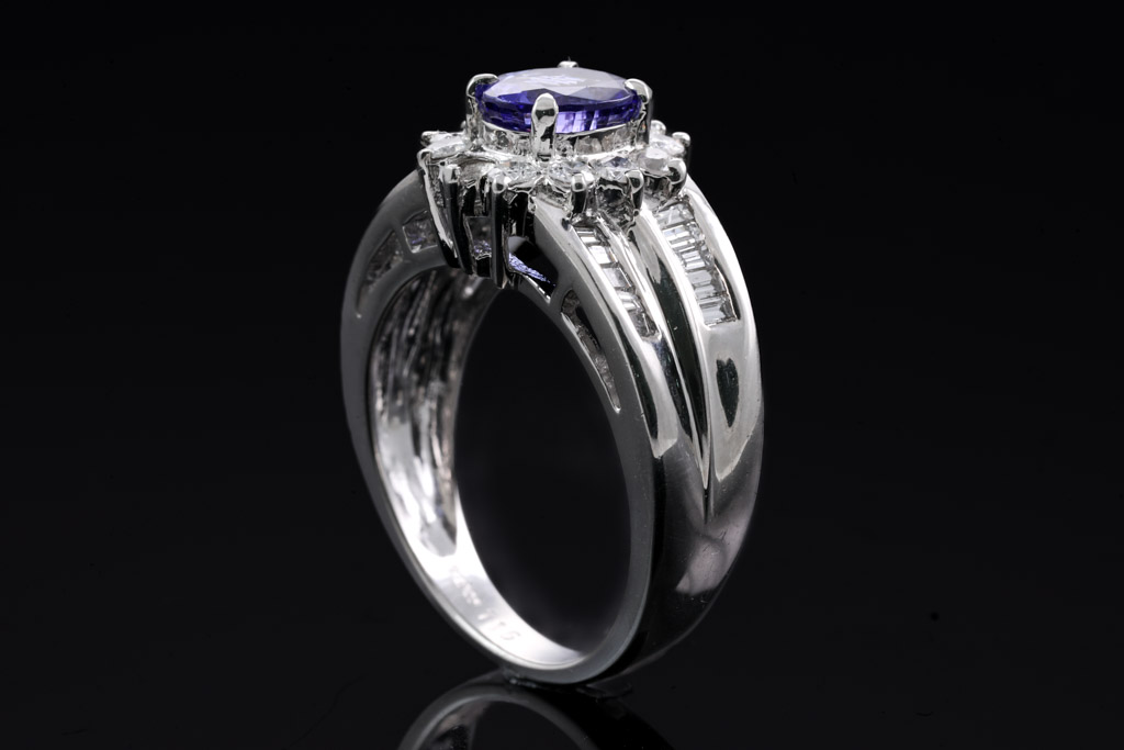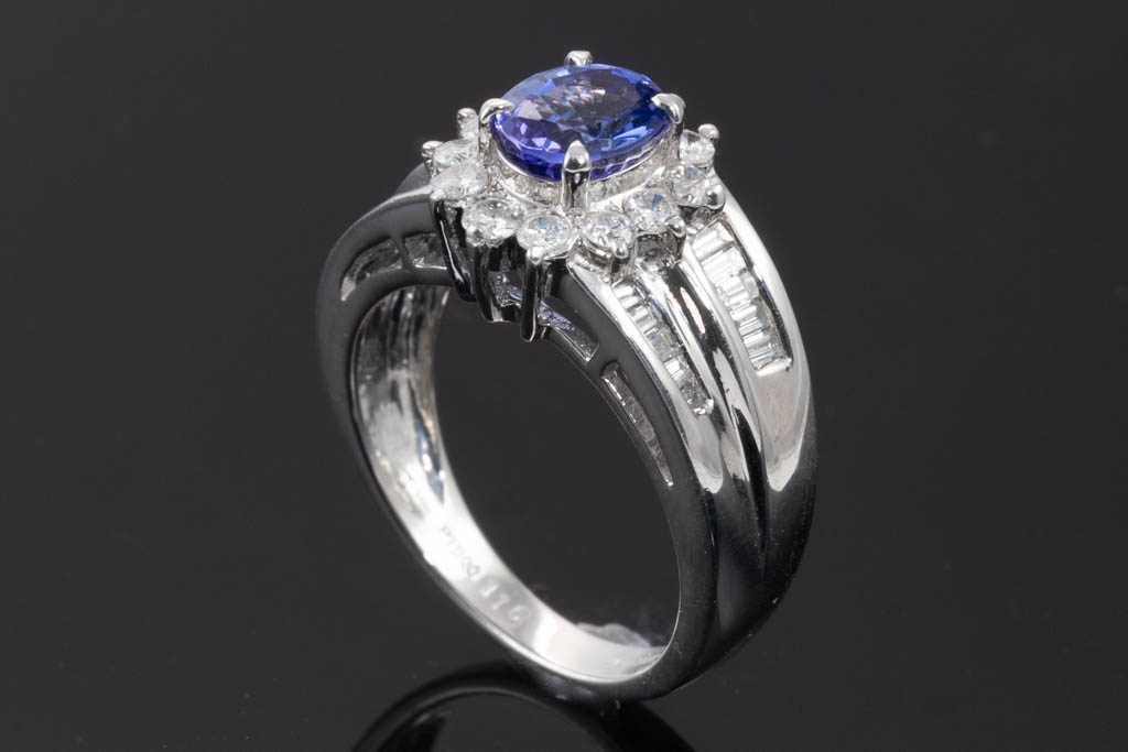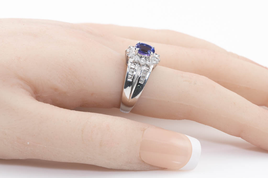 Tanzanite and Diamond ring with oval Tanzanite of 1.16ct with round & baguette cut Diamonds totalling 0.75cts (Estimated grading: G-H SI -P1). Platinum. Rings size M. Weight: 8.6g. (Pre-owned)