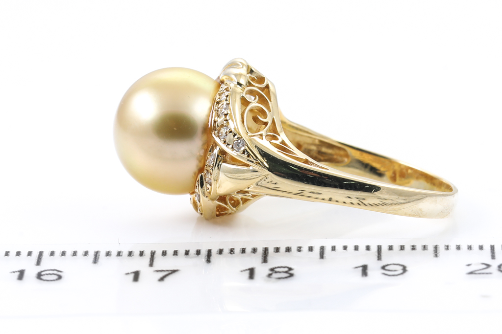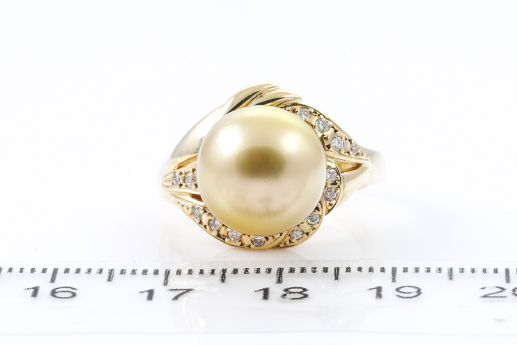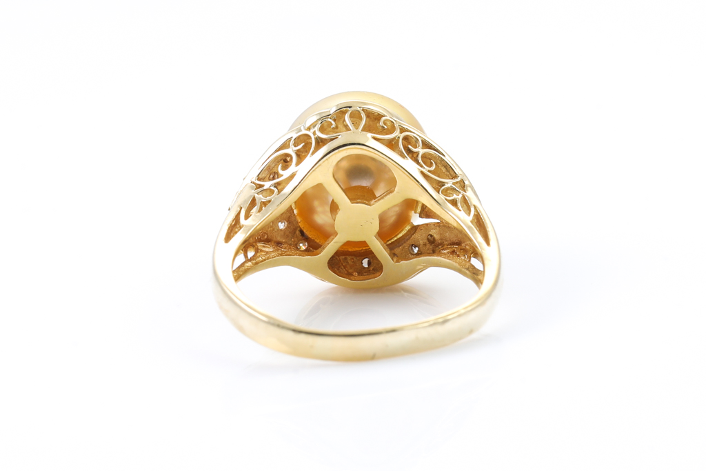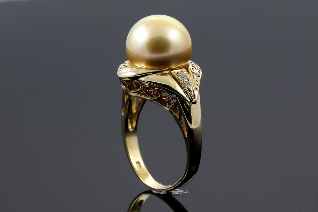 Pearl and Diamond ring with golden South Sea Pearl of 11.6mm and round Diamonds totalling 0.12cts. 18ct yellow gold. Ring size N 1/2. Weigth: 7.7g. (Pre-owned)