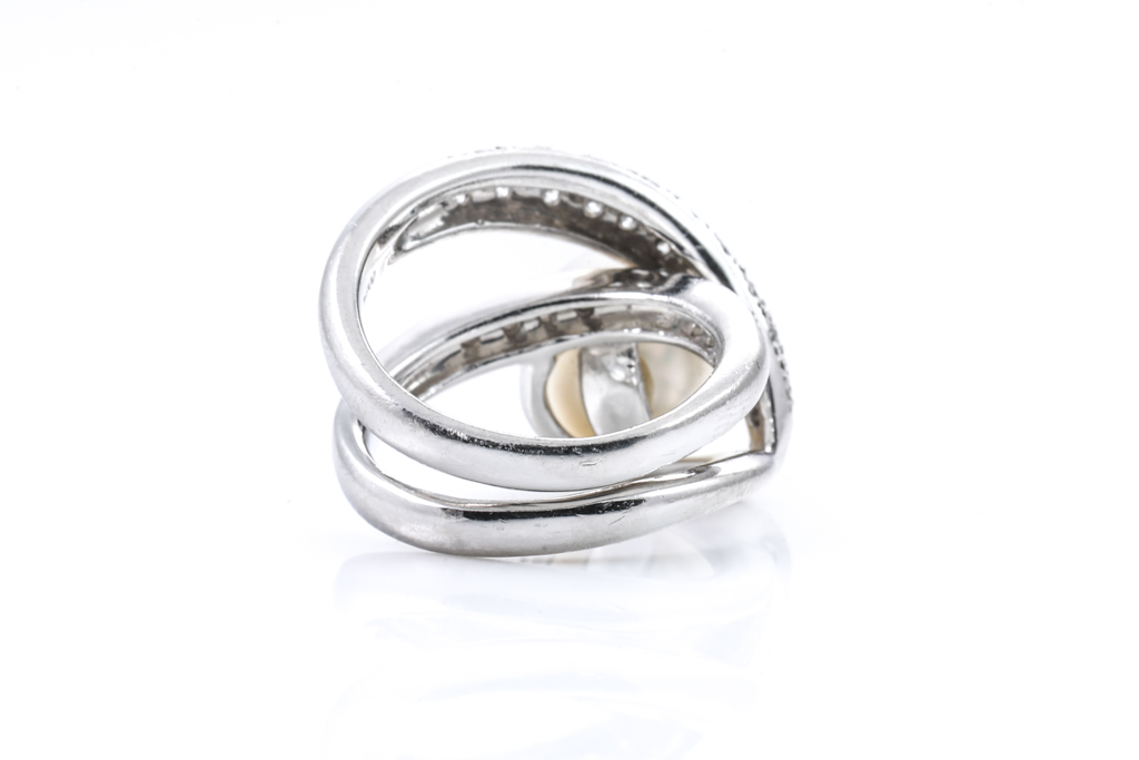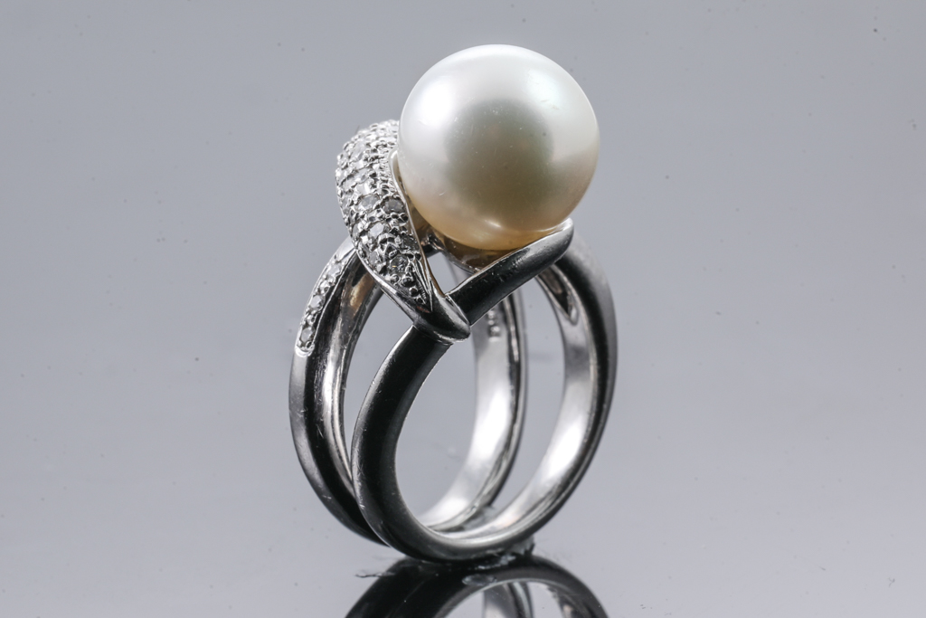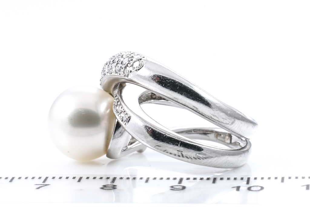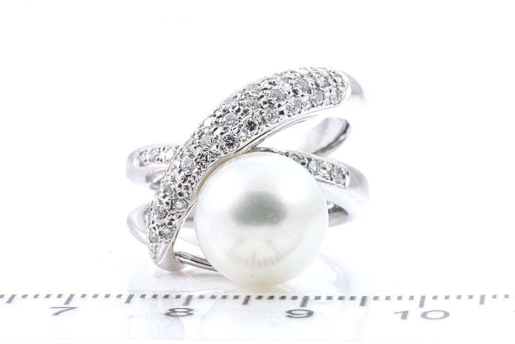 Pearl and Diamond ring with South Sea Pearl of 11.6mm and round Diamonds totalling 0.45cts (Estimated grading: H-I SI-P1). Platinum. Ring size M - ring resizing is not recommended. Weight: 19.5g. (Pre-owned)