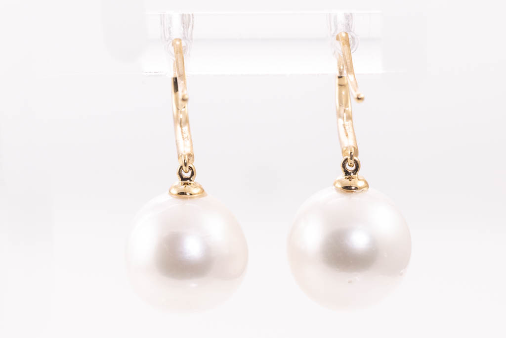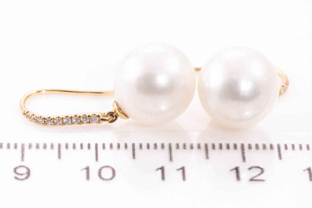 Pearl shepherds hook earrings with South Sea Pearls of 11.6mm and round Diamonds totalling 0.20cts. 18ct yellow gold. Weight: 5.2g. (New)