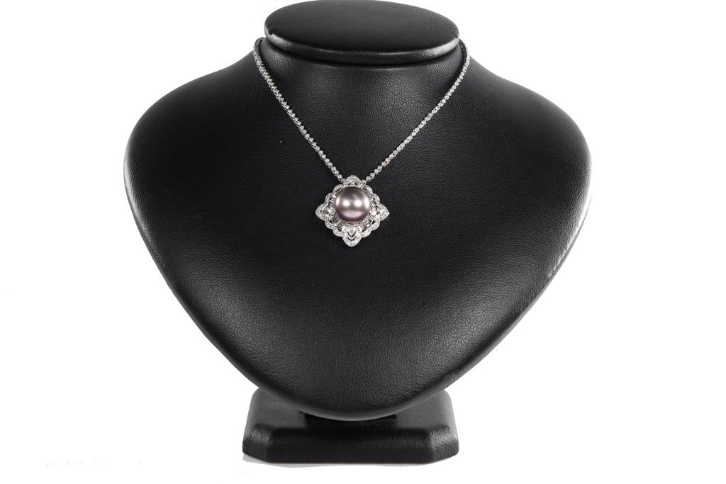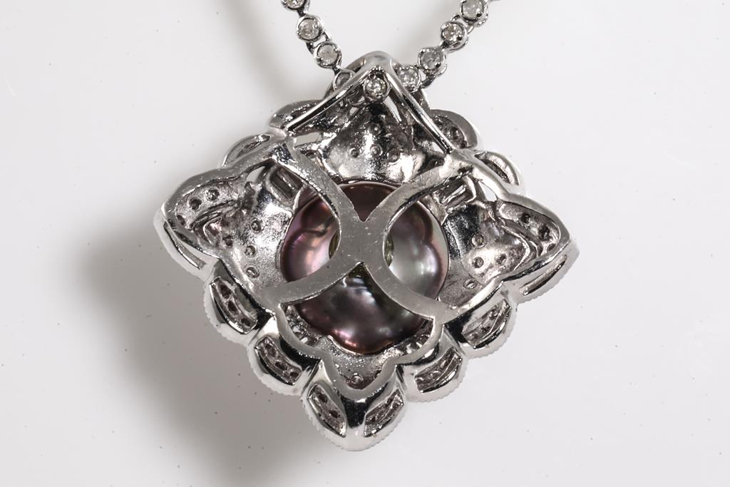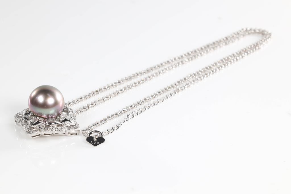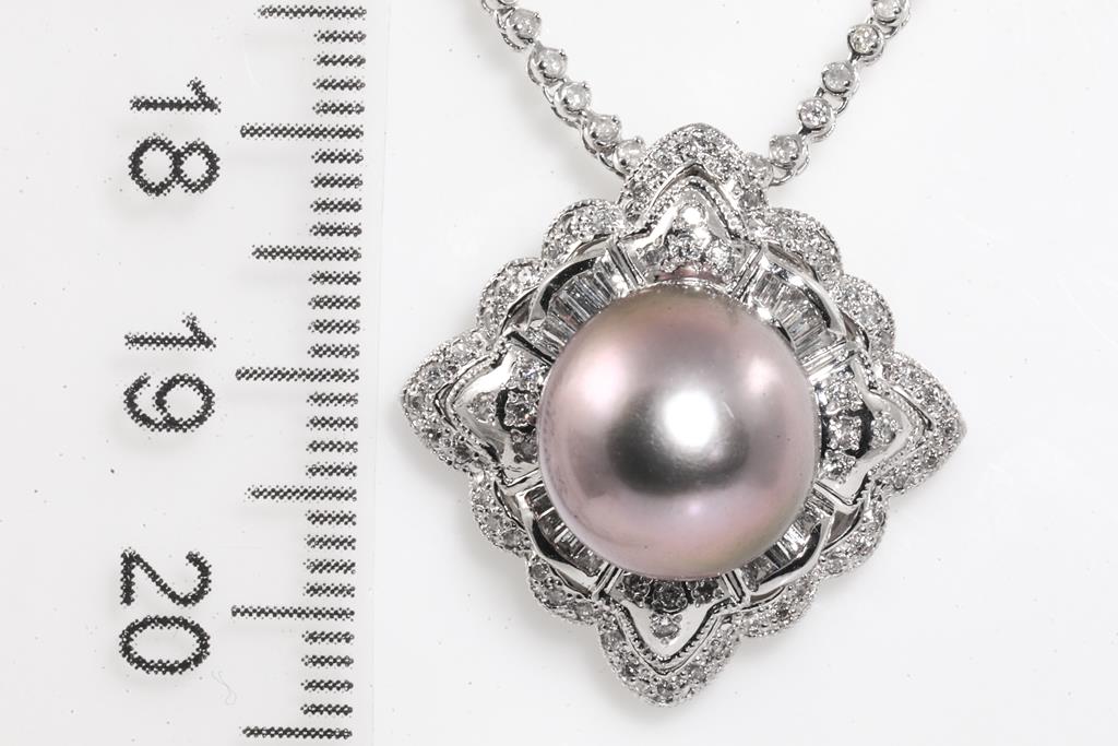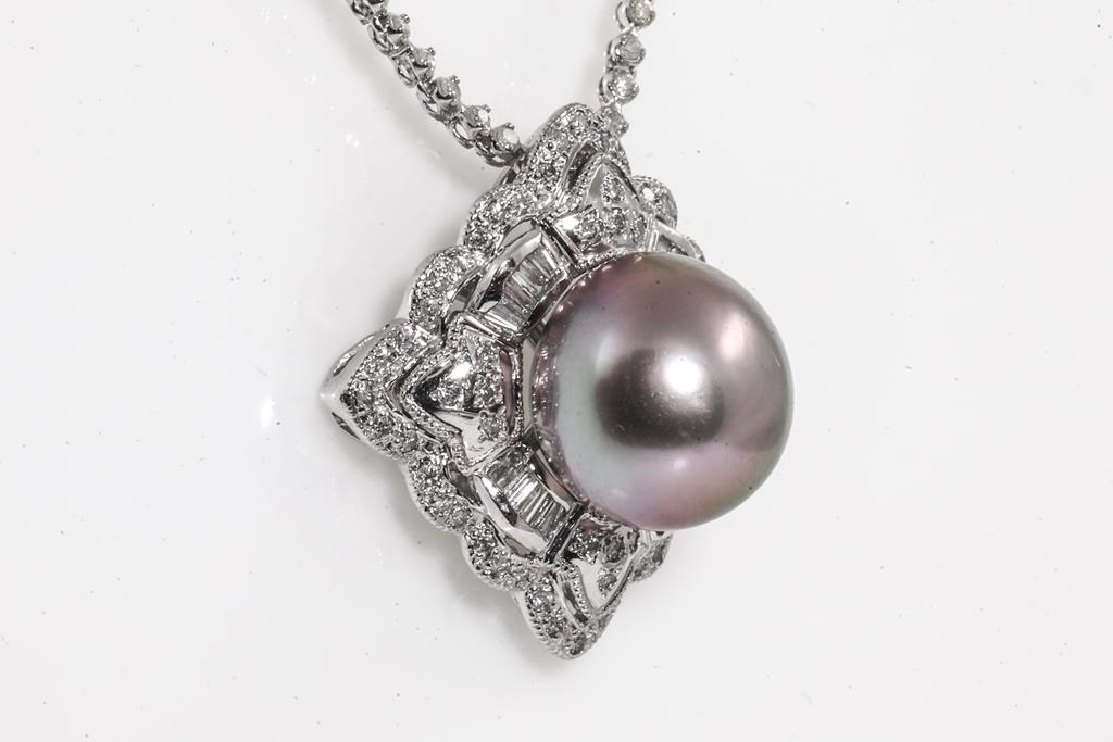 Pearl and Diamond pendant with Tahitian Pearl of 11.6mm and round & baguette cut Diamonds totalling 1.00cts (Estimated graidng: G-H SI). Note chain set with round Diamonds totalling 1.00cts. 14ct white gold. Adjustable max length: 45cm chain. Weigth: 12.7g. (Pre-owned)