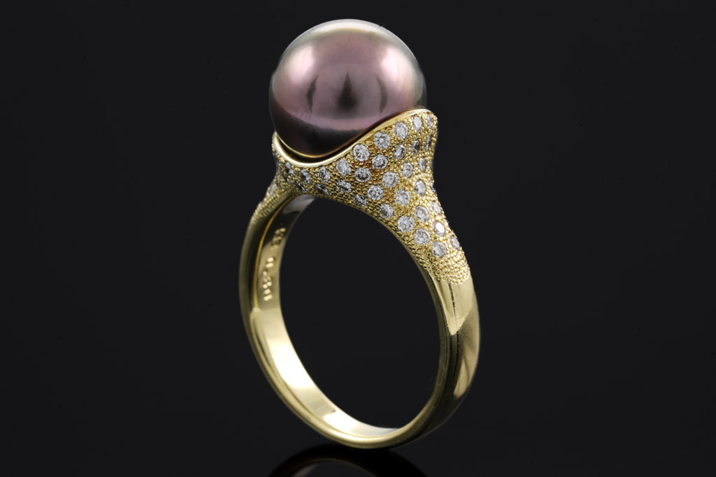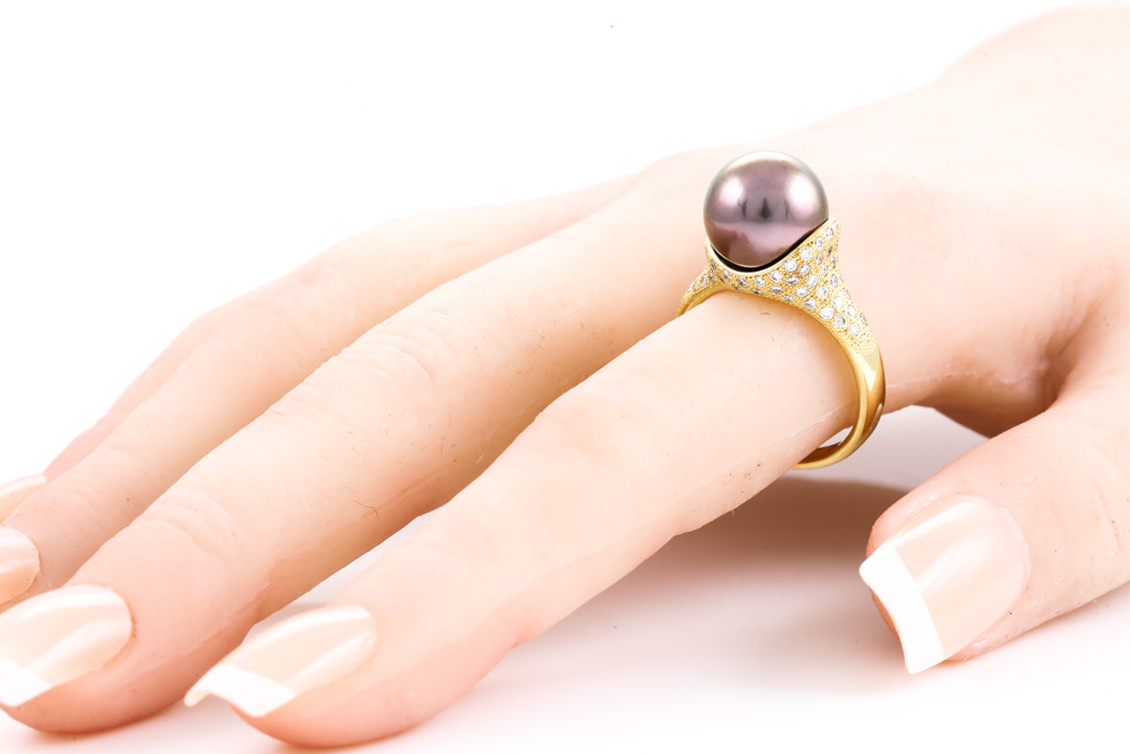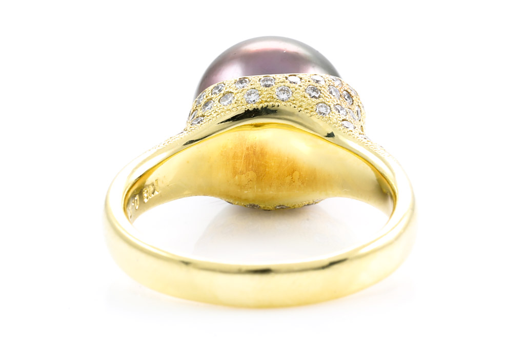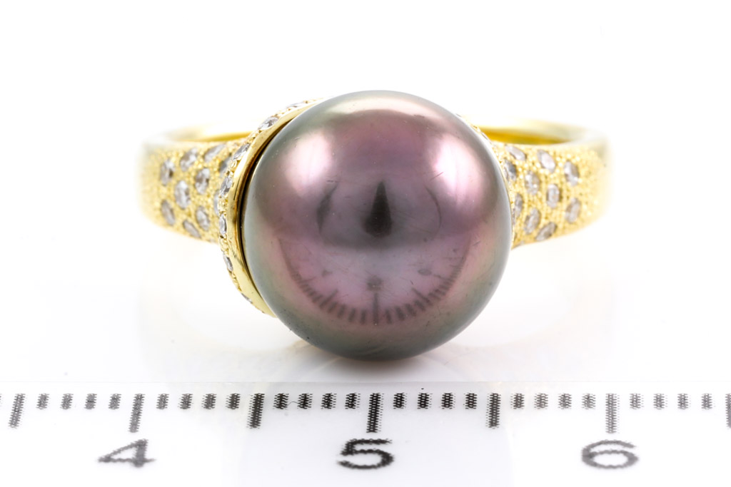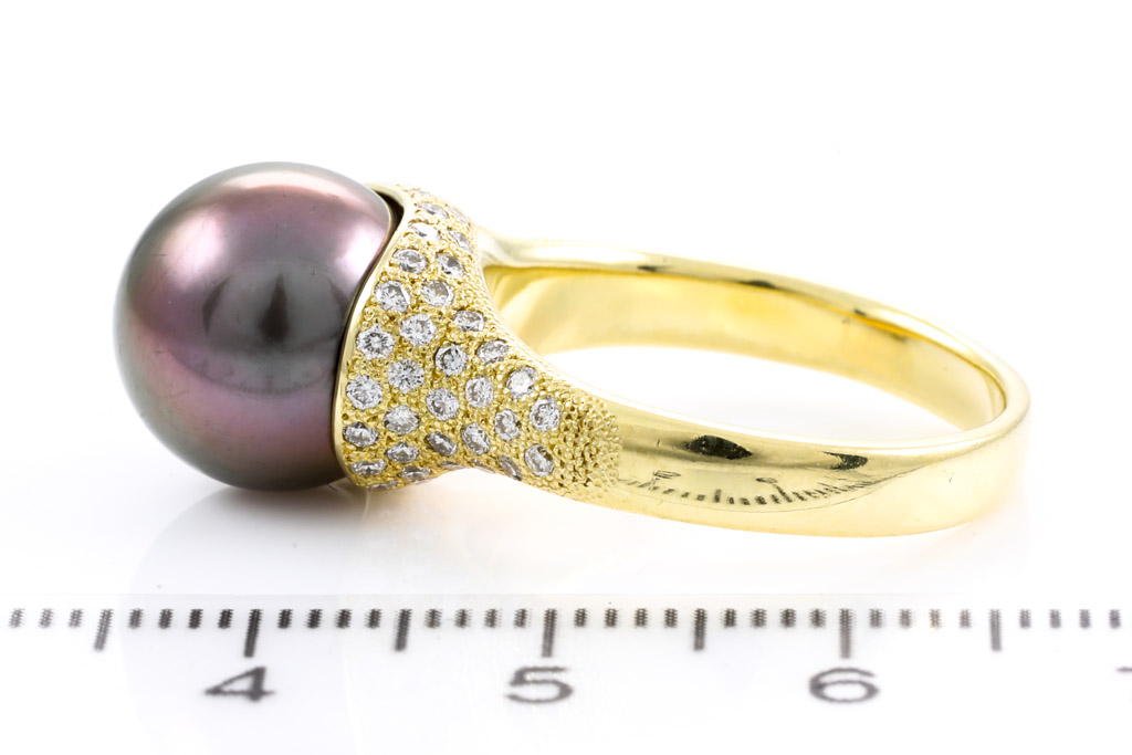 Pearl and Diamond ring with purplish tone Tahitian Pearl of 11.6mm and round Diamonds totalling 0.80cts (Estimated grading: G SI). 18ct yellow gold. Ring size P - ring resizing is not recommended. Weight: 9.1g. (Pre-owned)