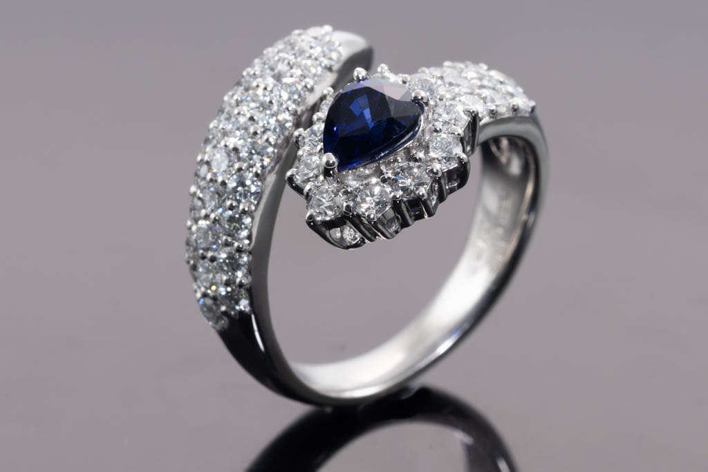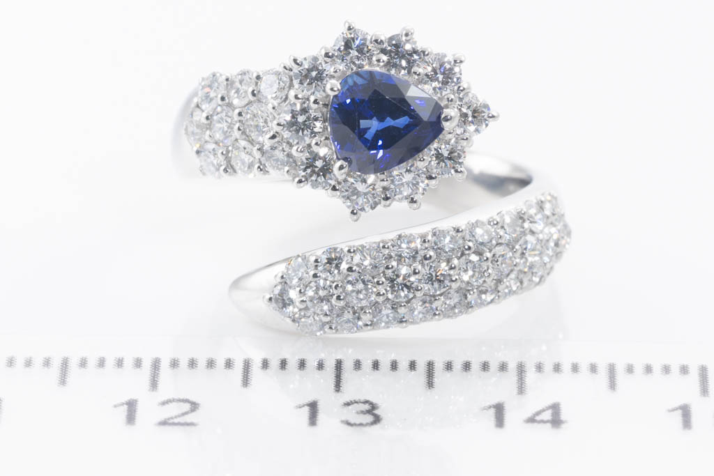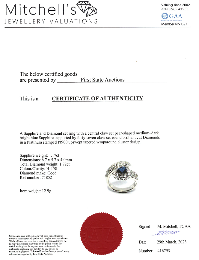 Sapphire and Diamond wrap around ring with pear shape blue Sapphire of 1.17ct and round Diamonds totalling 1.72cts (Estimated grading H-I SI). Platinum - 900. Rings size N1/2 - ring resizing is not recommended. Weight: 12.9g. With Certificate #416793. (Pre- owned)