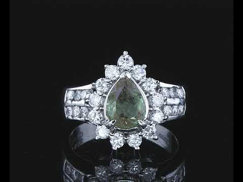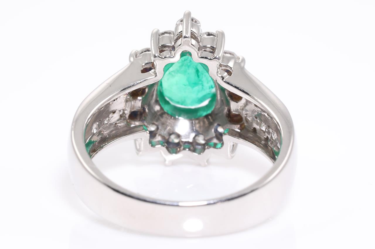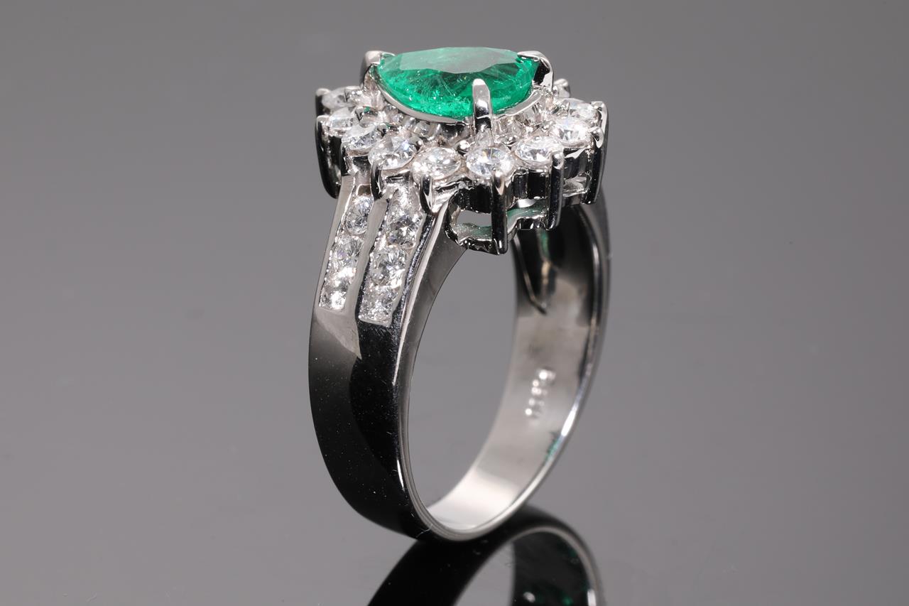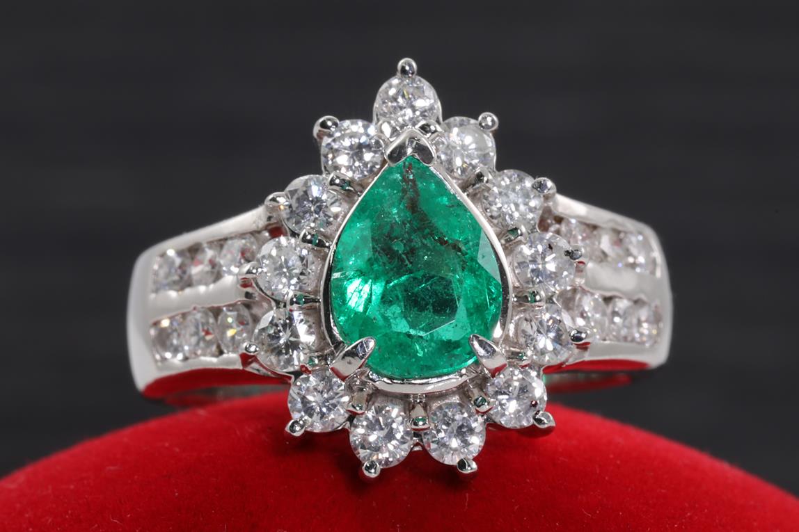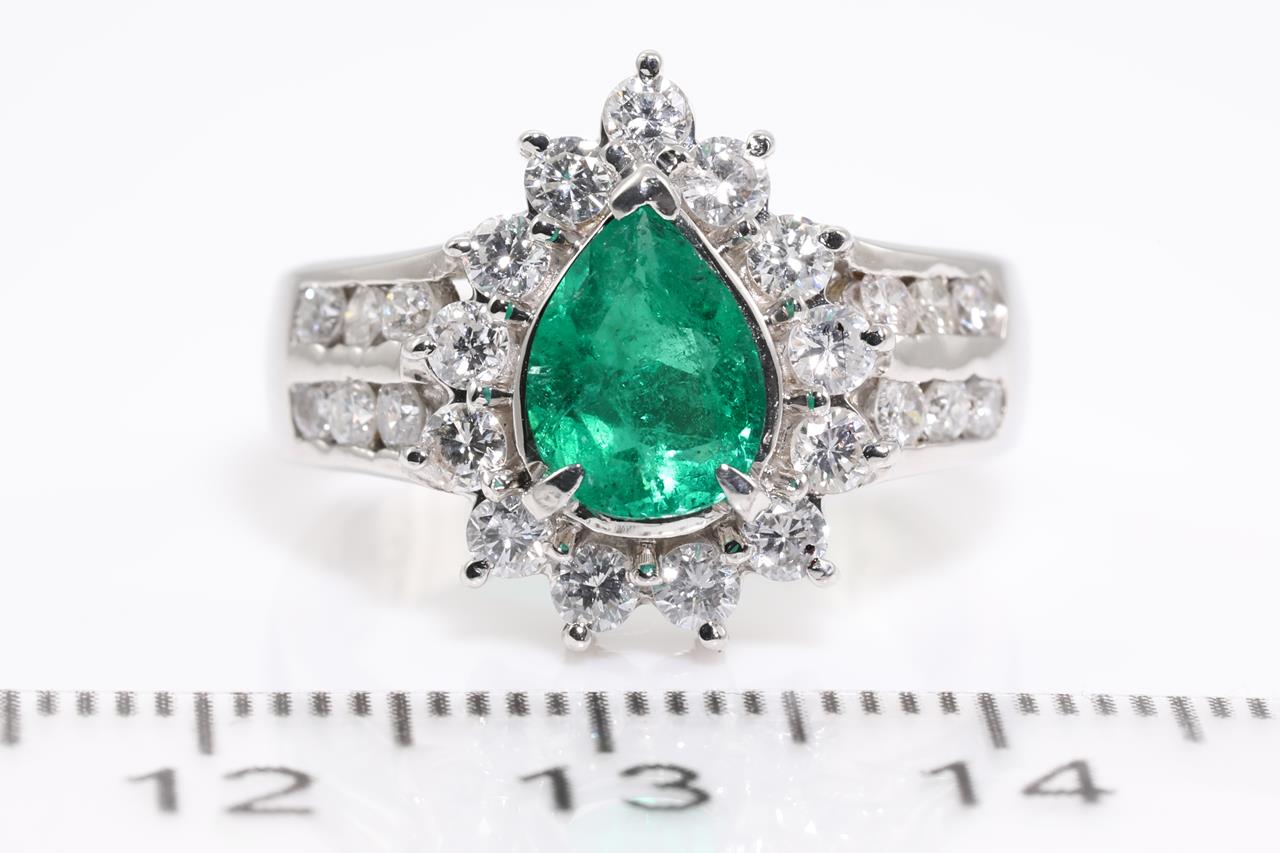 Emerald and Diamond ring with a pear shape Emerald 1.17ct and Diamonds totalling 1.00cts (Estimated grading: G-H SI). Platinum. Ring size M1/2 - can be resized up by a maximum of 3 sizes, down with ring clip. Weight: 9.5g. With certificate #414526. (As New)