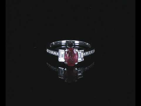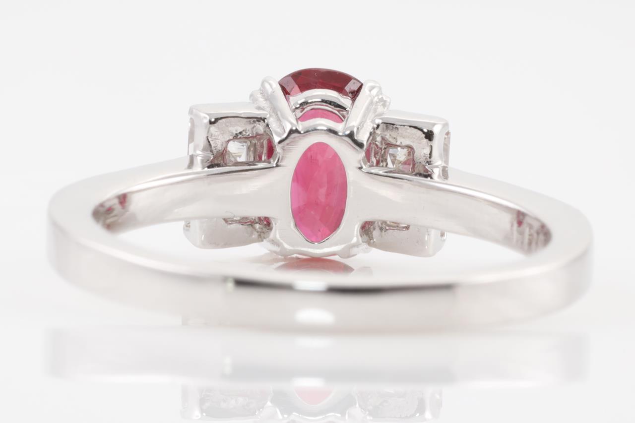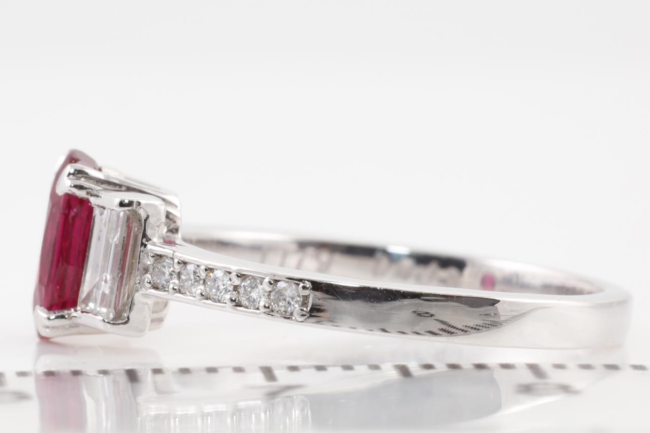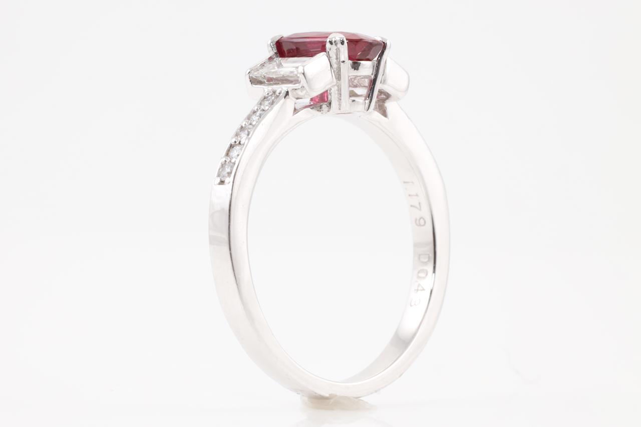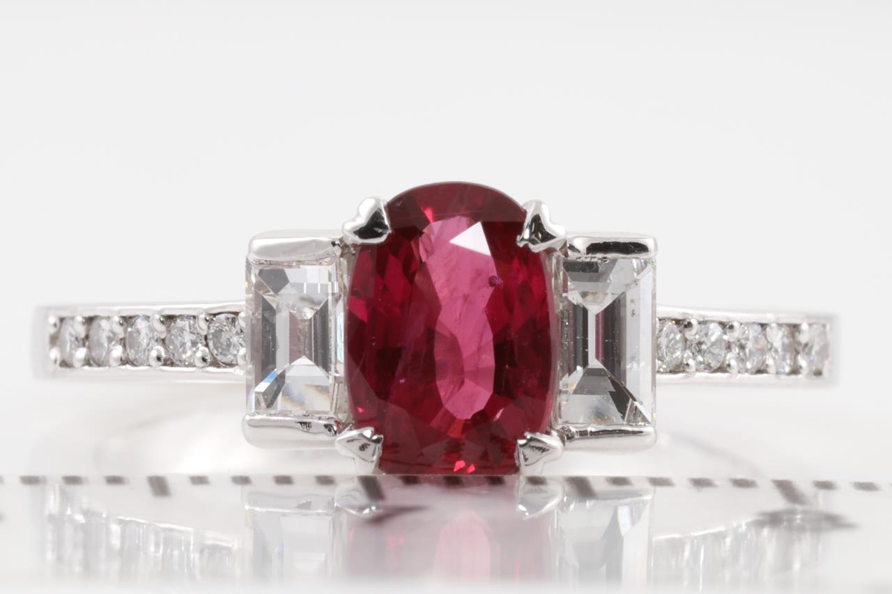Ruby and Diamond ring with oval shape Ruby of 1.17ct and Diamonds totalling 0.43cts (Estimated grading: G-H VS-SI). Platinum. Ring size: M. Weight: 4.6g (Pre-owned)