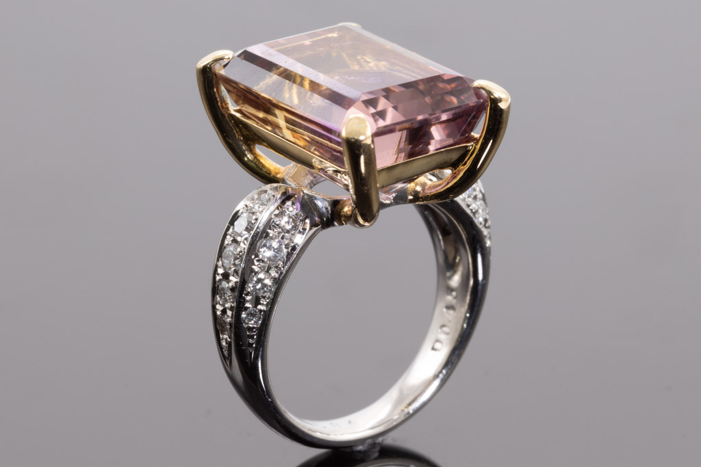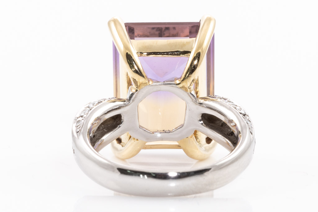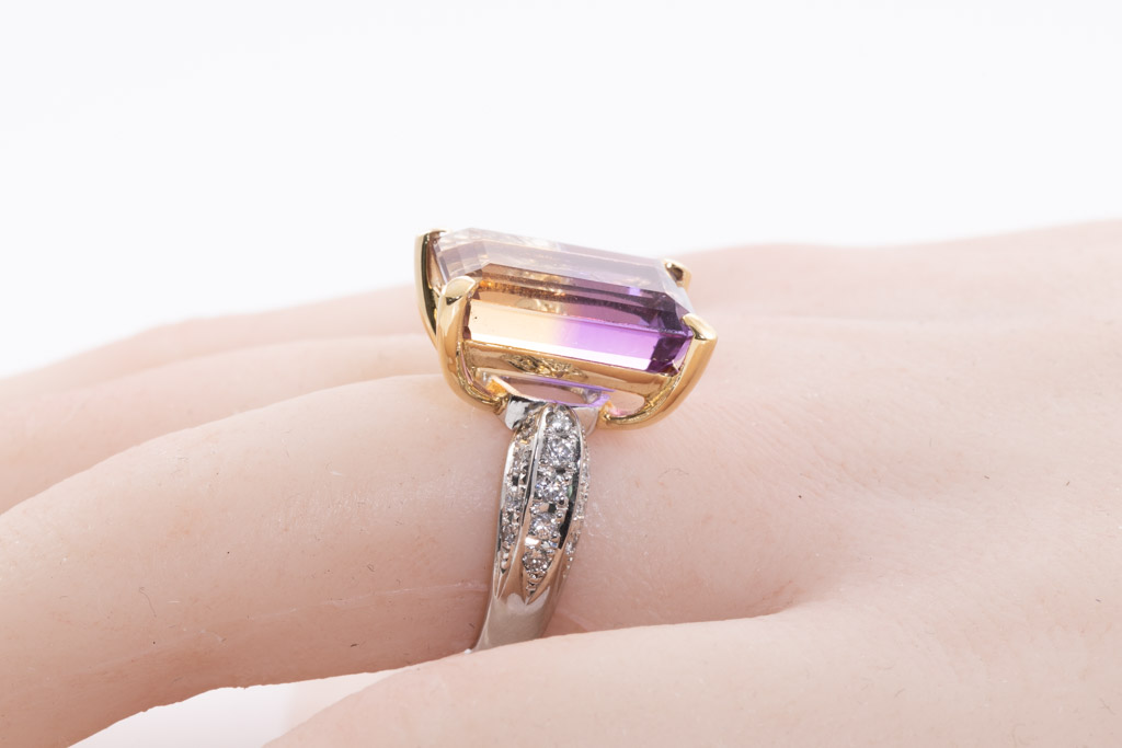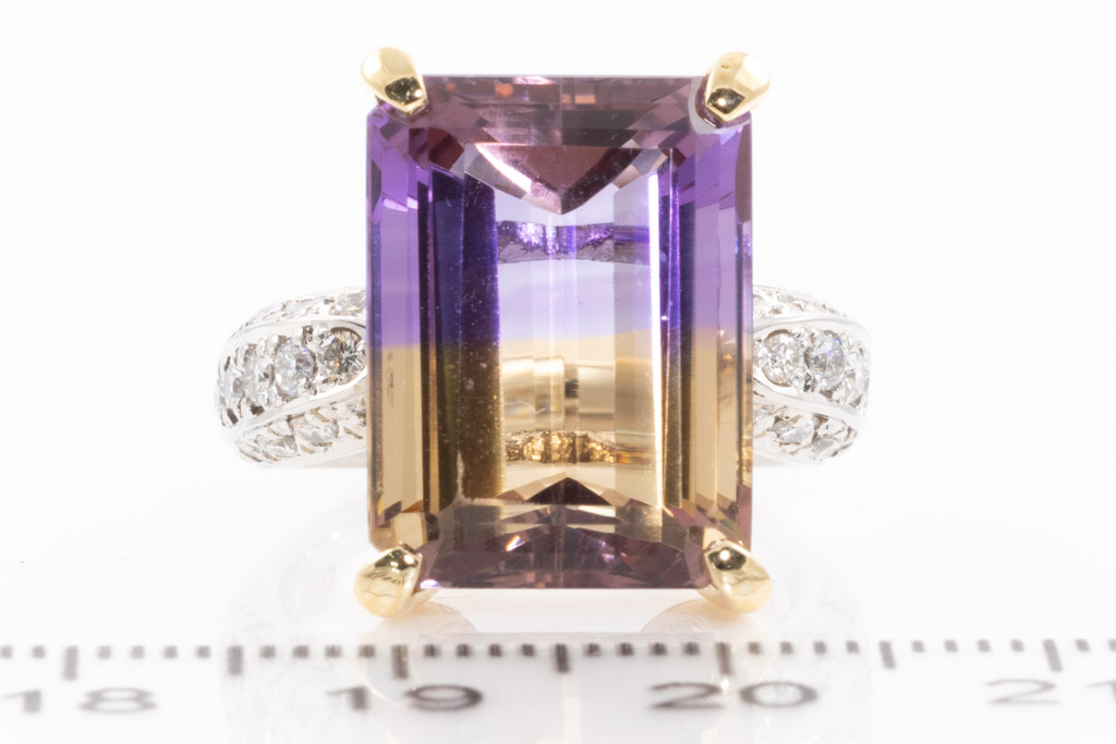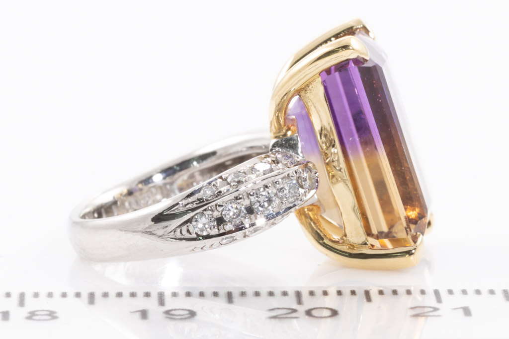 Ametrine and Diamond ring with emerald cut Ametrine of 11.84ct and round Diamonds totalling 0.45cts (Estimated grading: G-H SI). 18ct yellow gold and platinum. Ring size J1/2 - ring resize is not recommended. Weight: 12.0g. (Pre-owned)