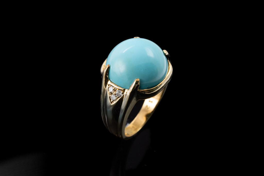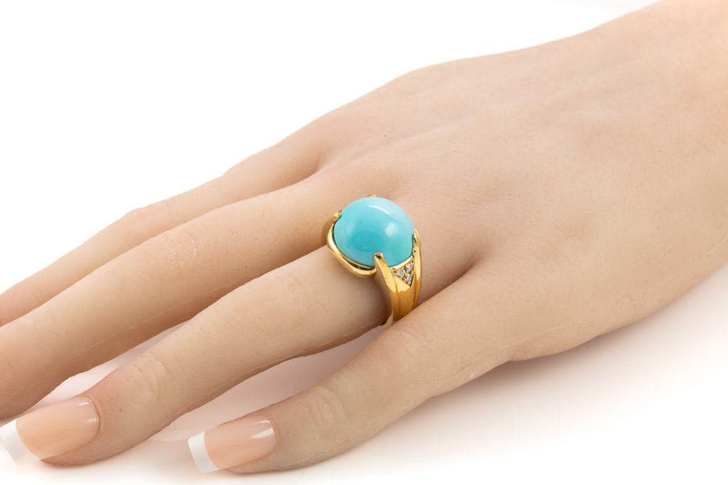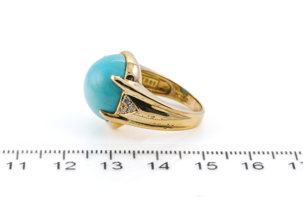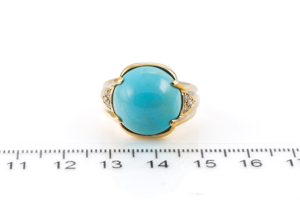 Turquoise and Diamond ring with round cabochon cut Turquoise of 11.86ct and round Diamonds totalling 0.12cts. 18ct yellow gold. Ring size N. Weight: 10.5g (Pre-owned)