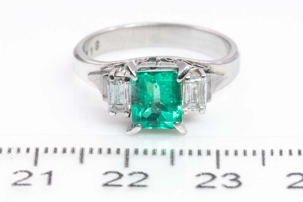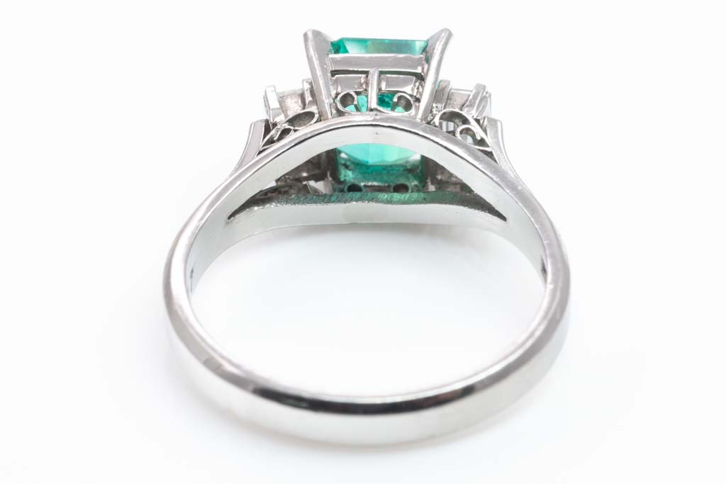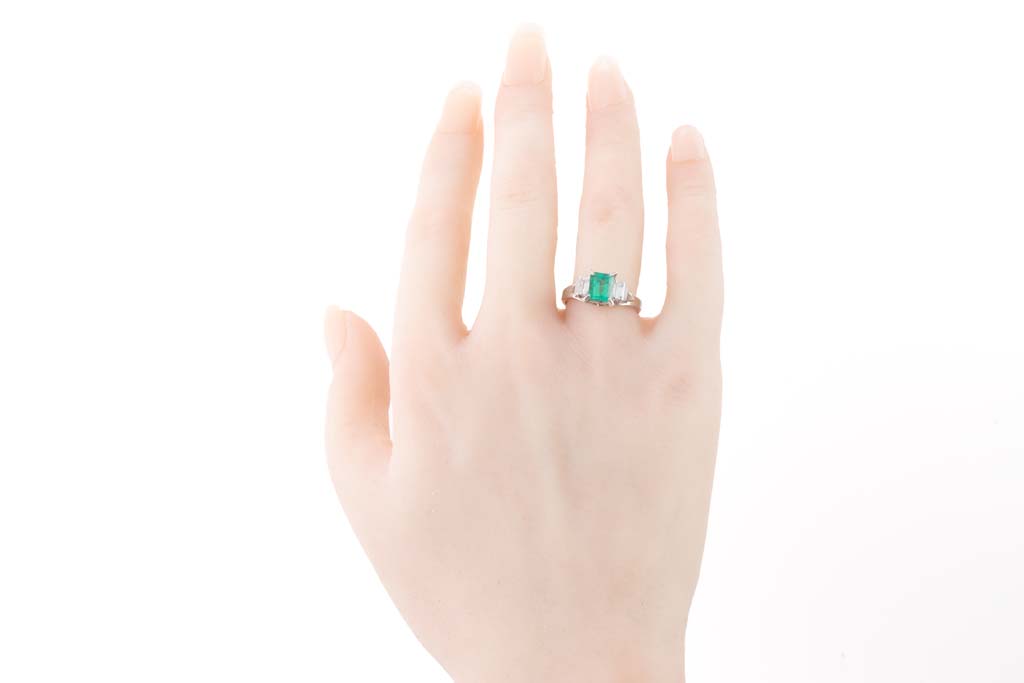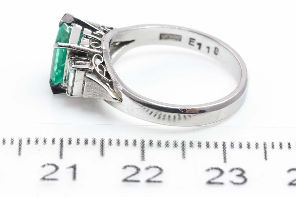 Emerald and Diamond ring with emerald cut Emerald of 1.18ct and baguette cut Diamonds totalling 0.37cts (Estimated grading: F-G VS). Platinum-900. Ring size M. Weight: 5.4g. (Pre-owned)