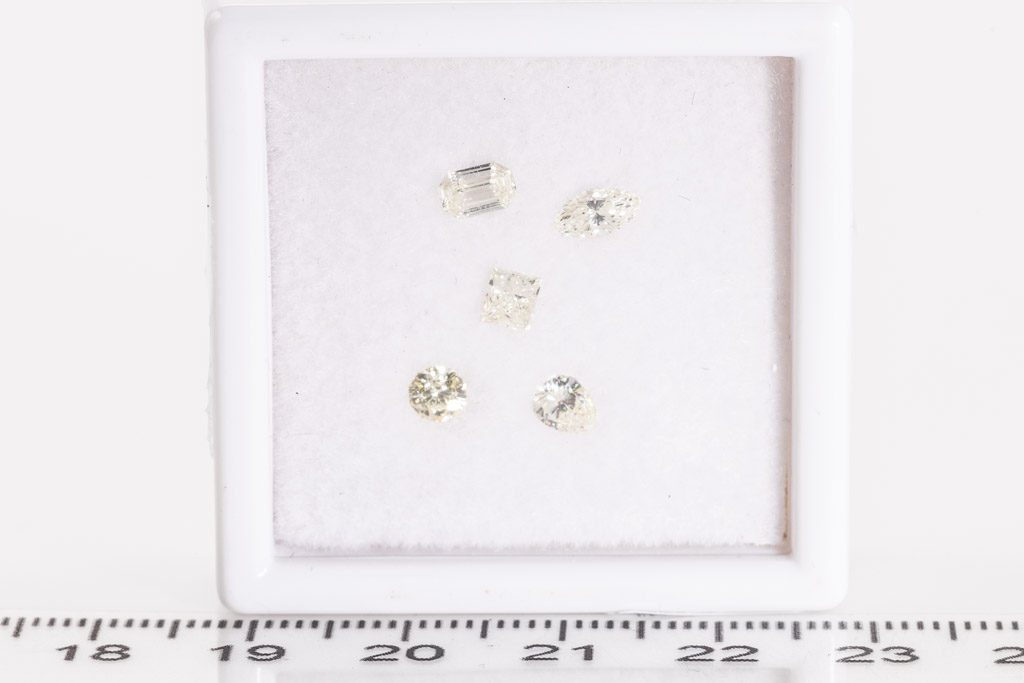 A loose parcel of 5 mixed shape Diamonds (princess, round, pear, emerald and marquise cut) totalling 1.18cts (Estimated grading: Natural Light Yellow VS-SI). (New)