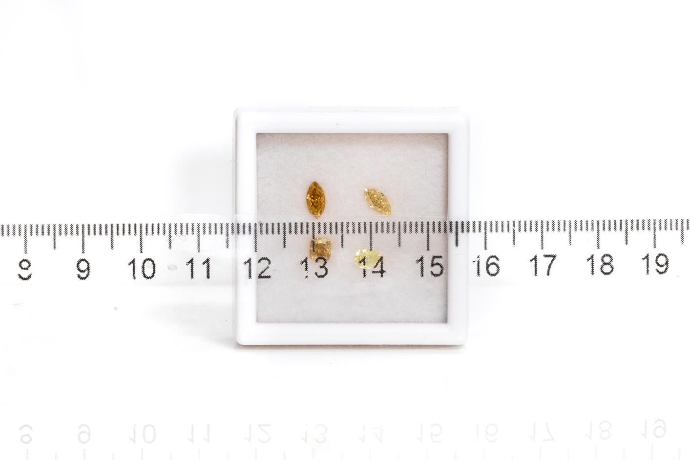 A loose parcel of 4 mixed shape Diamonds (including 1 x Pear, 2 x marquise cuts and 1 x Cushion cut) totalling 1.18cts (Estimated grading: Fancy Yellow, Fancy Light Brownish Yellow, Fancy Intensive Brownish Yellow, clarity ranging from VS-SI2). (New)
