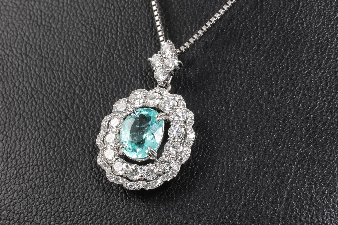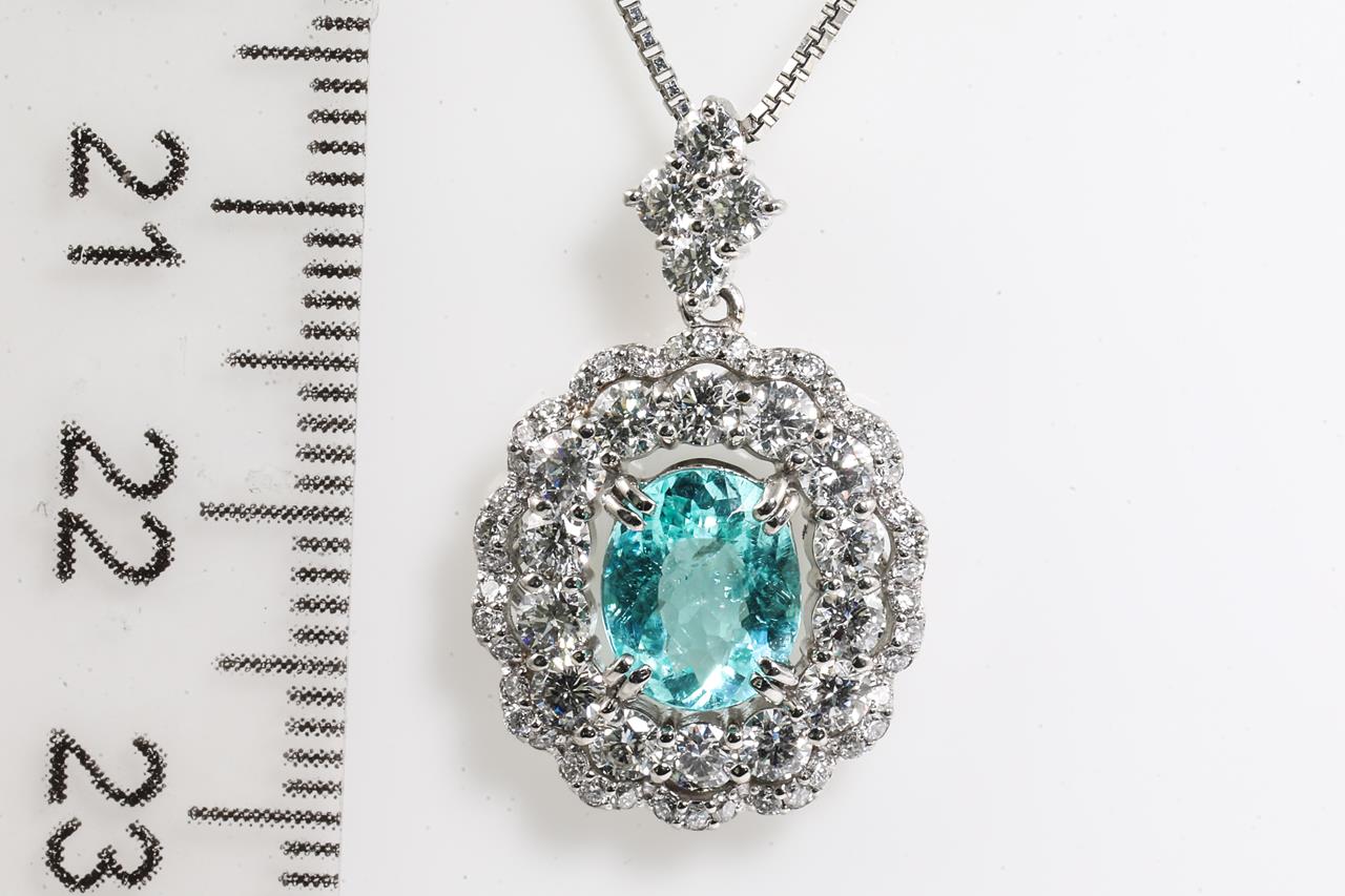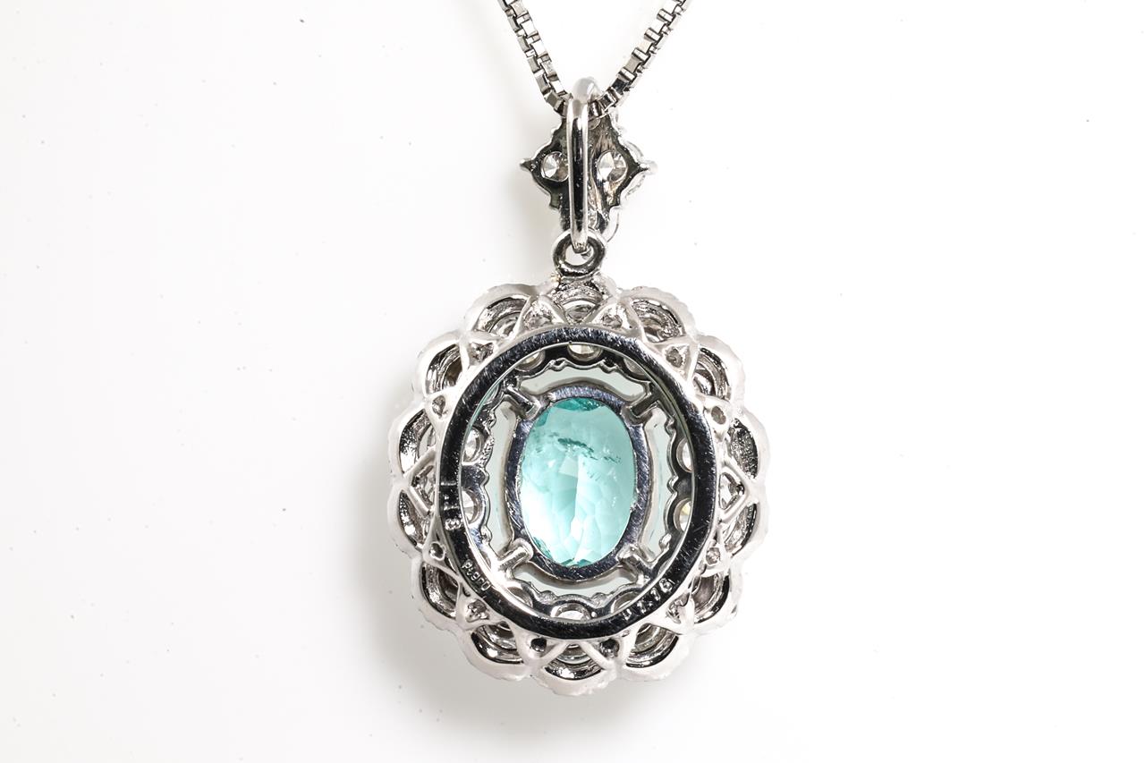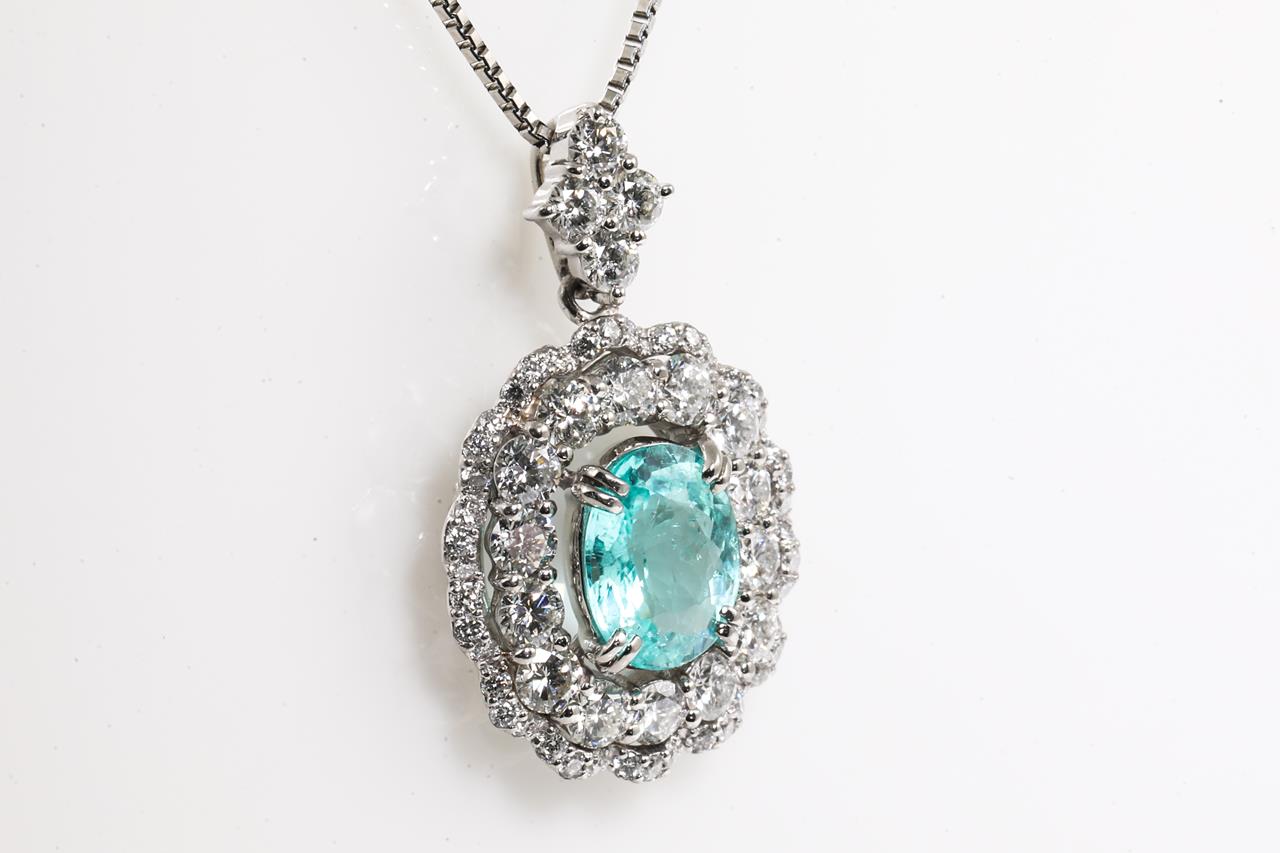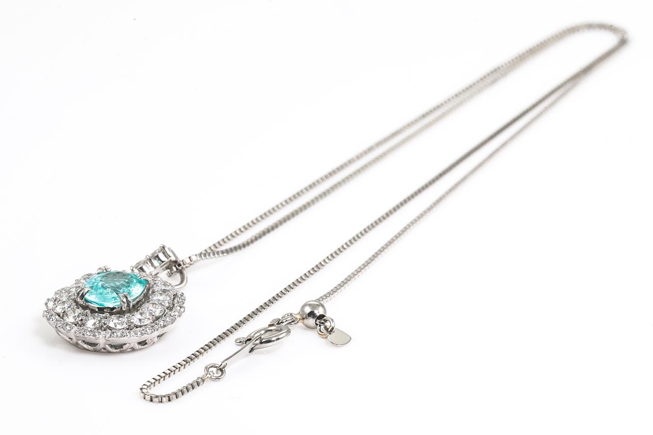 Tourmaline & Diamond pendant with centre oval shape Paraiba Tourmaline of 1.18ct and surrounding round Diamonds totalling 1.18cts (Estimated grading: H-I SI). Platinum with 45cm adjustable chain. Weight: 6.4g. With certificate #415477. (Pre-owned)