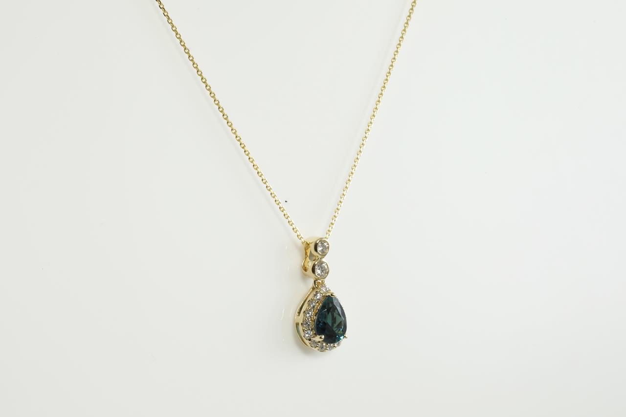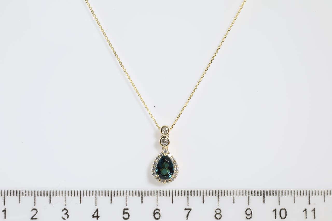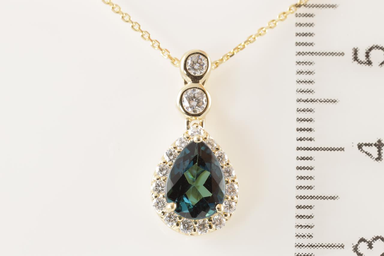 Tourmaline and Diamond pendant with pear shape green Tourmaline of 1.18ct and Diamonds totalling 0.31cts (Estimated grading: H SI). 14ct yellow gold with 18gold 45cm chain. Weight: 2.9g (As New)
