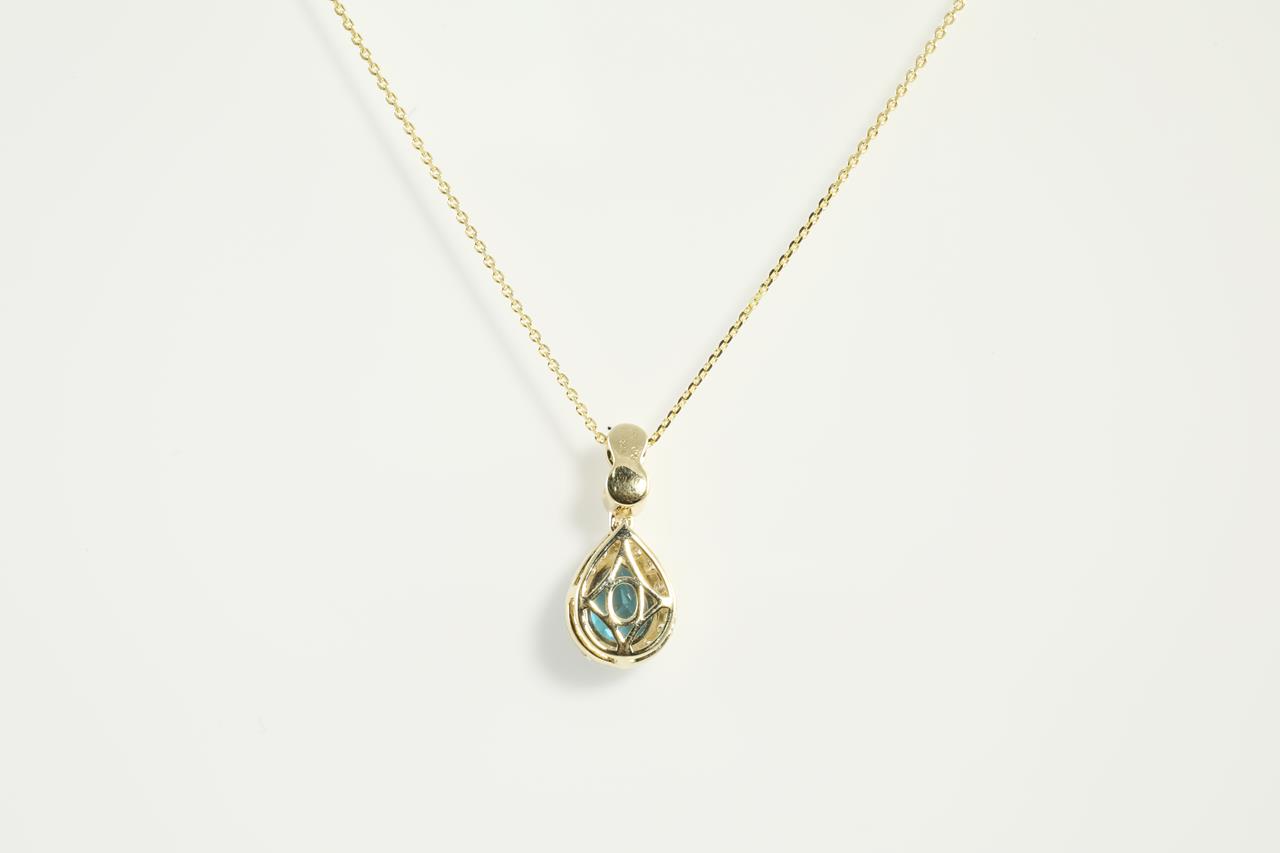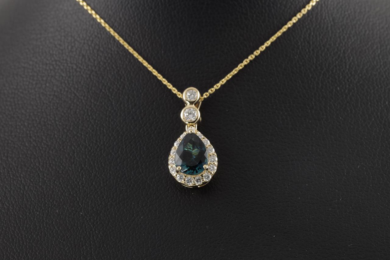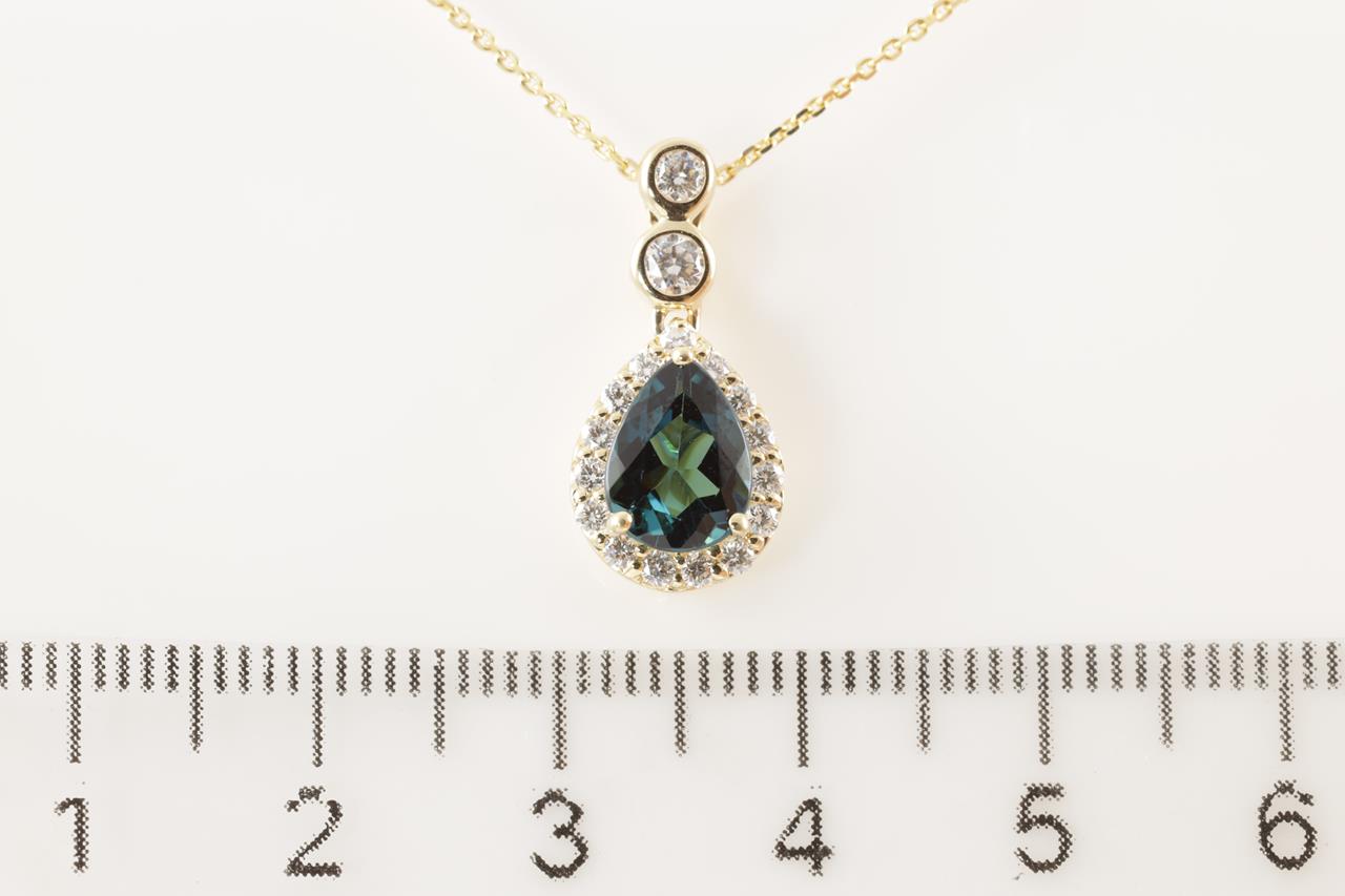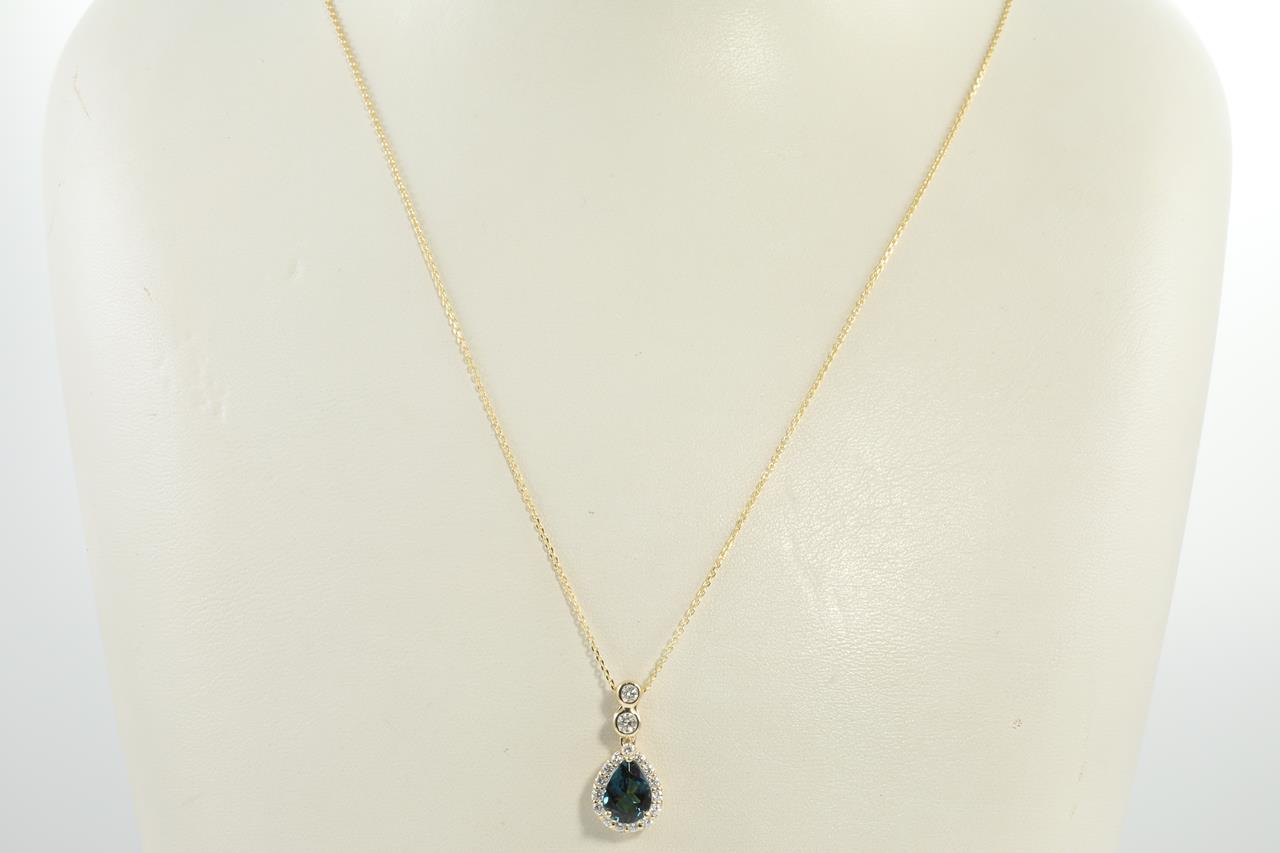 Tourmaline and Diamond pendant with pear shape green Tourmaline of 1.18ct and Diamonds totalling 0.31cts (Estimated grading: H SI). 14ct yellow gold with 18gold 45cm chain. Weight: 2.9g (As New)