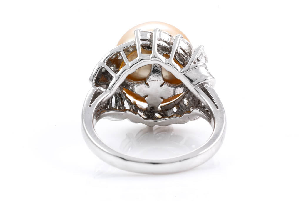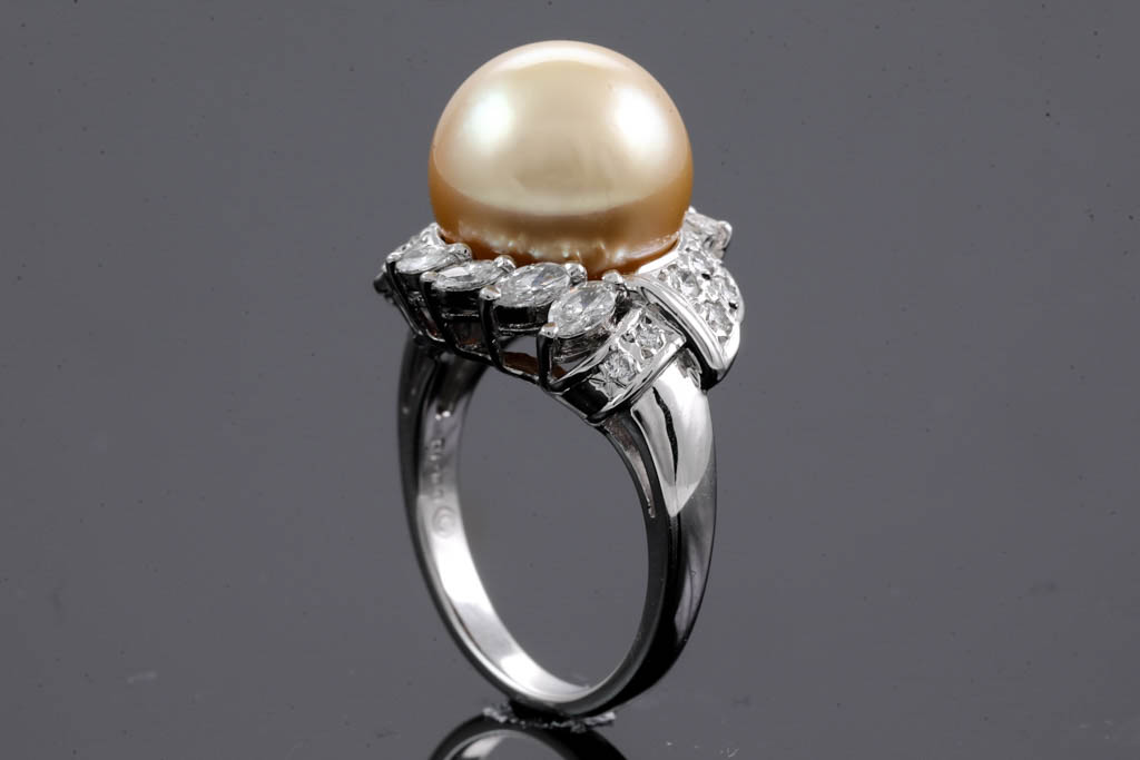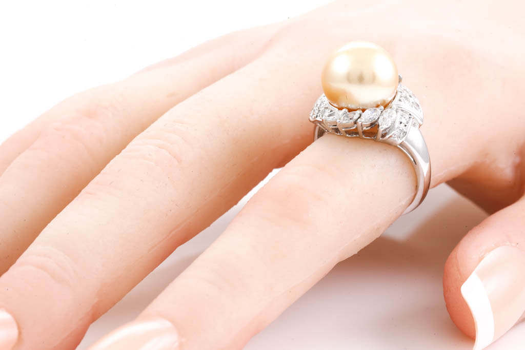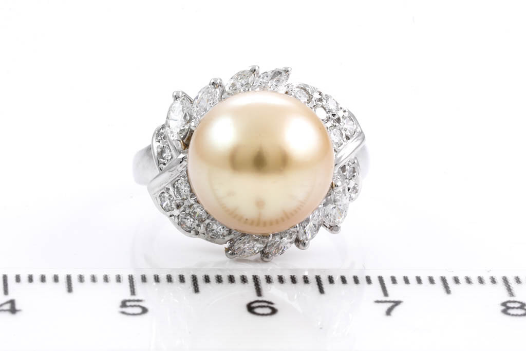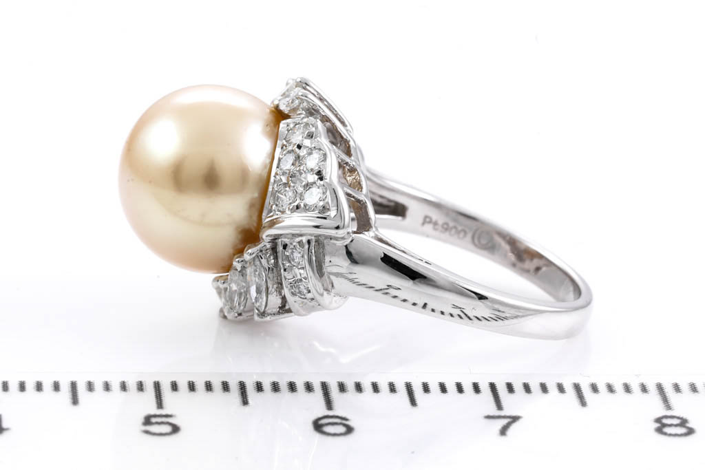Pearl and Diamond ring with golden South Sea Pearl of 11.8mm and round & marquise cut Diamonds totalling 0.69cts (Estimated grading: H-I SI). Platinum. Ring size K1/2. Weight: 10.0g. (Pre-owned)