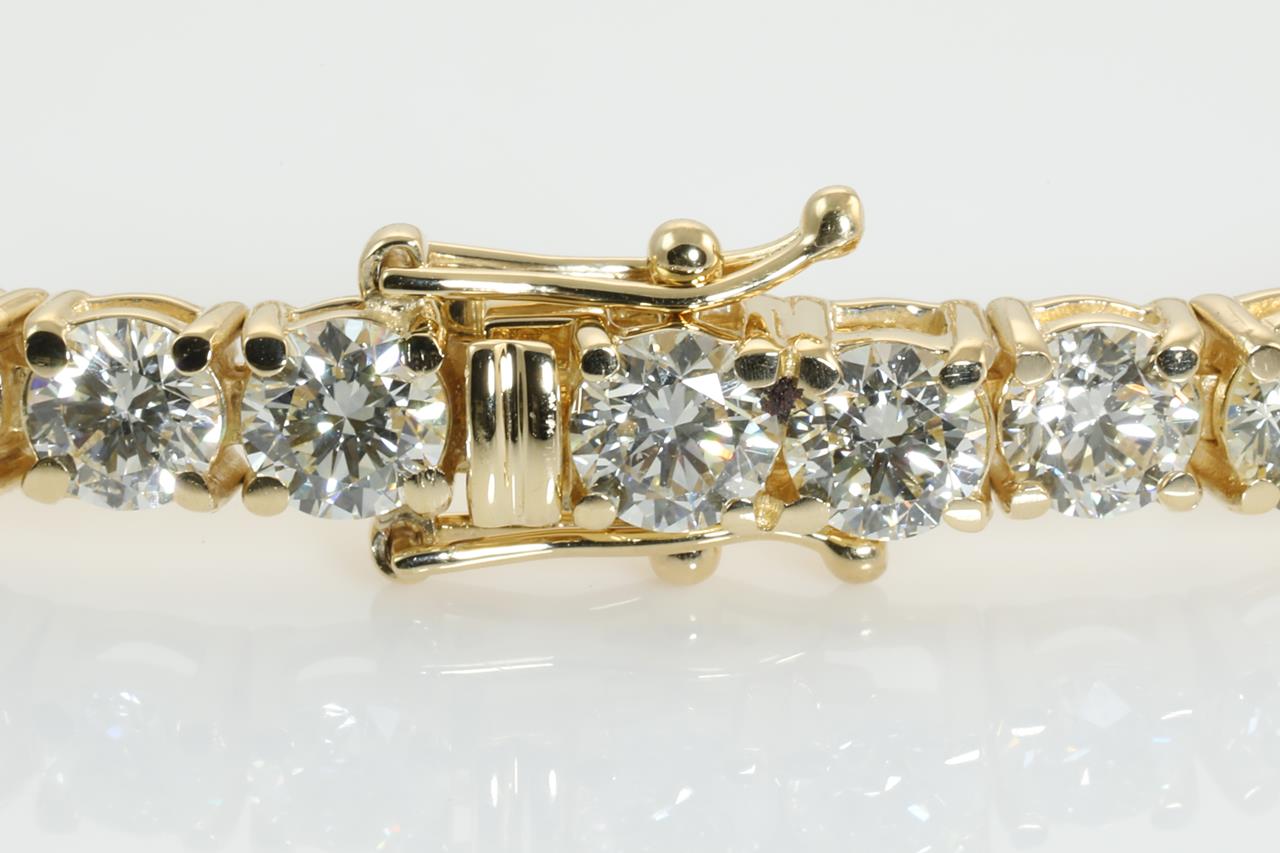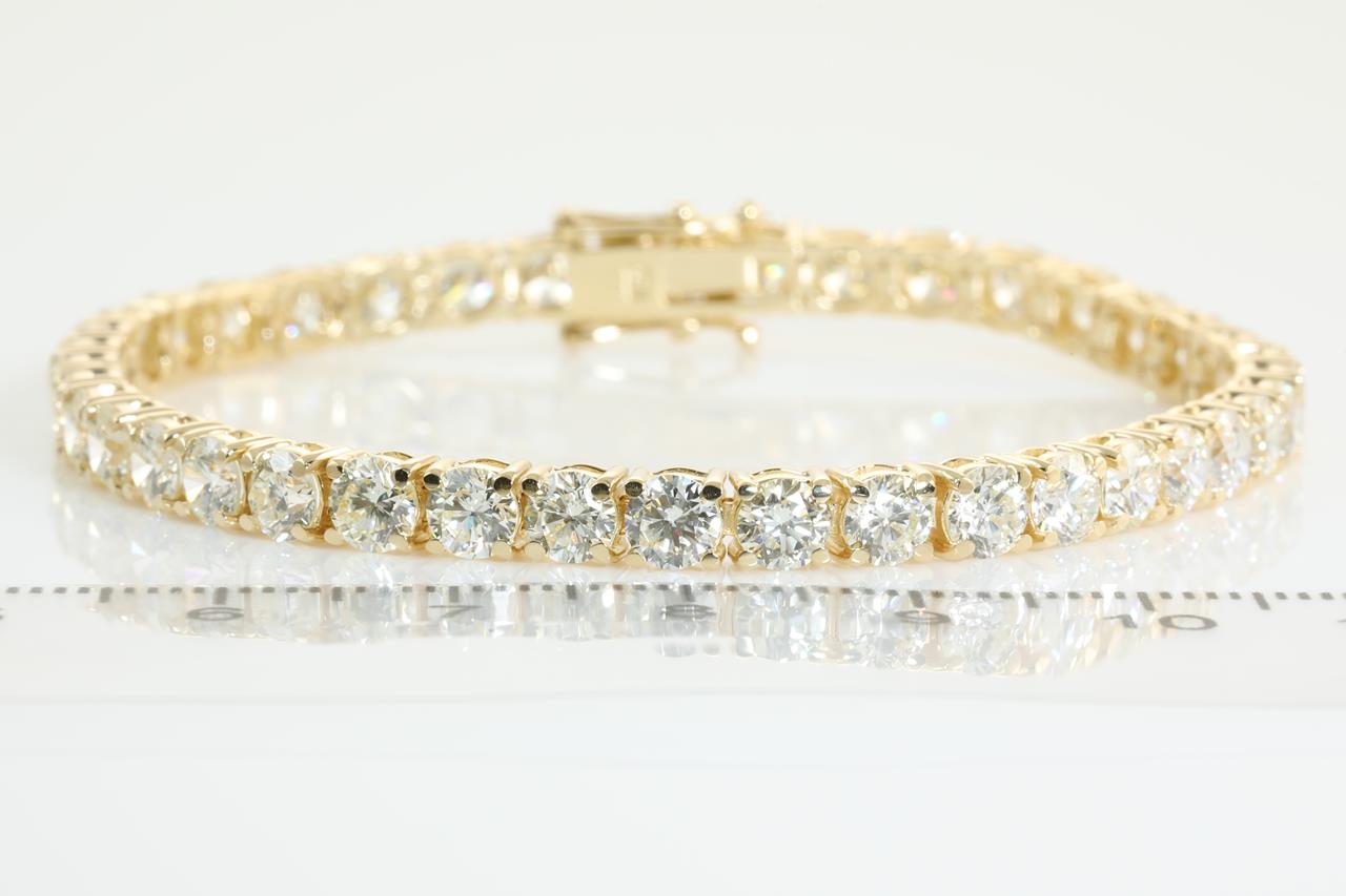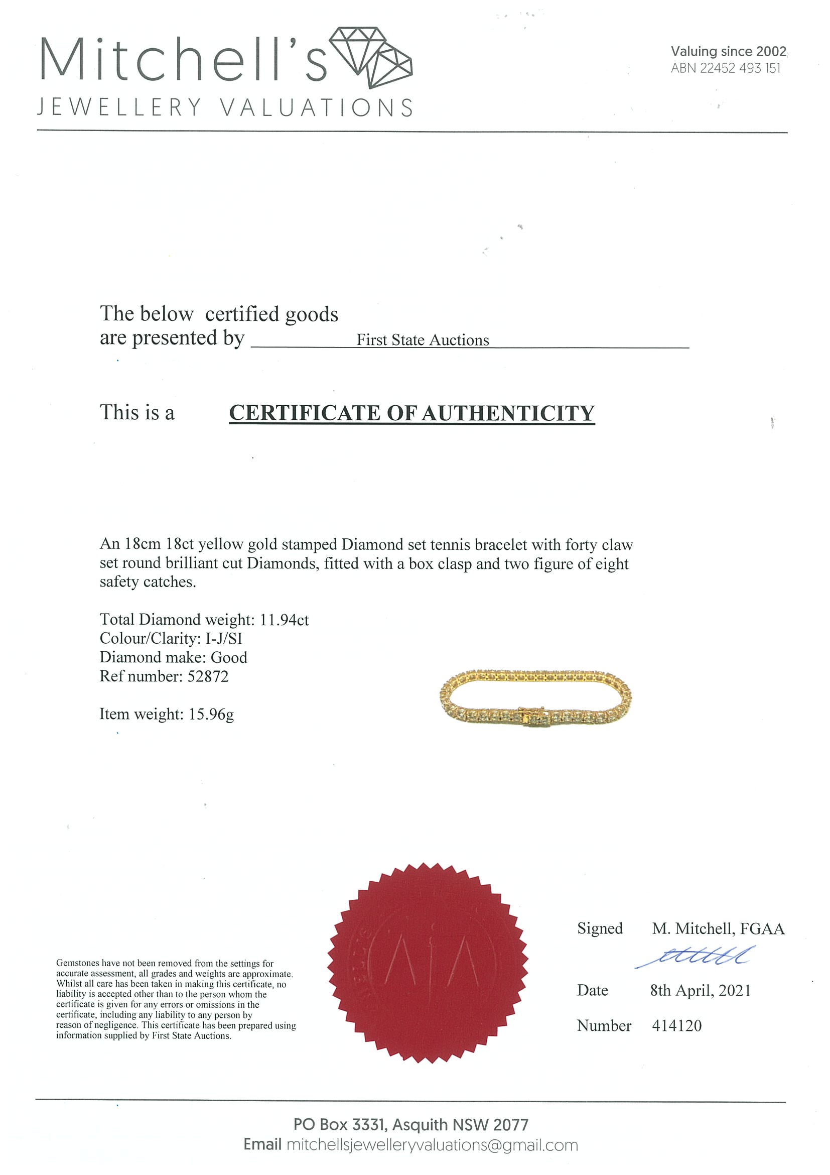 Diamond tennis bracelet with 40 round Diamonds totalling 11.94cts (Estimated grading: I-J SI). 18ct yellow gold. Length: 18cm Weight: 15.9g. With certificate #414120. (New)