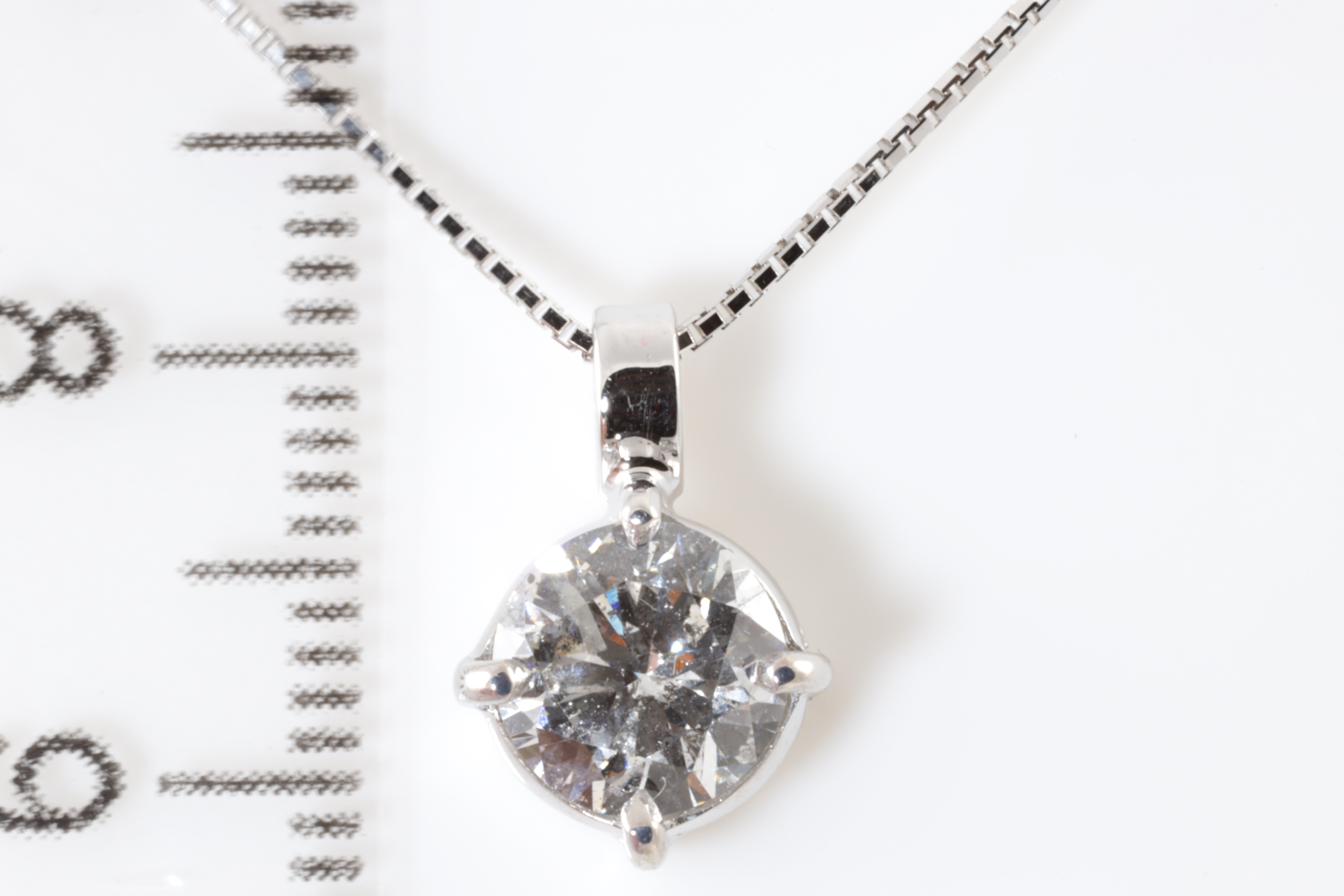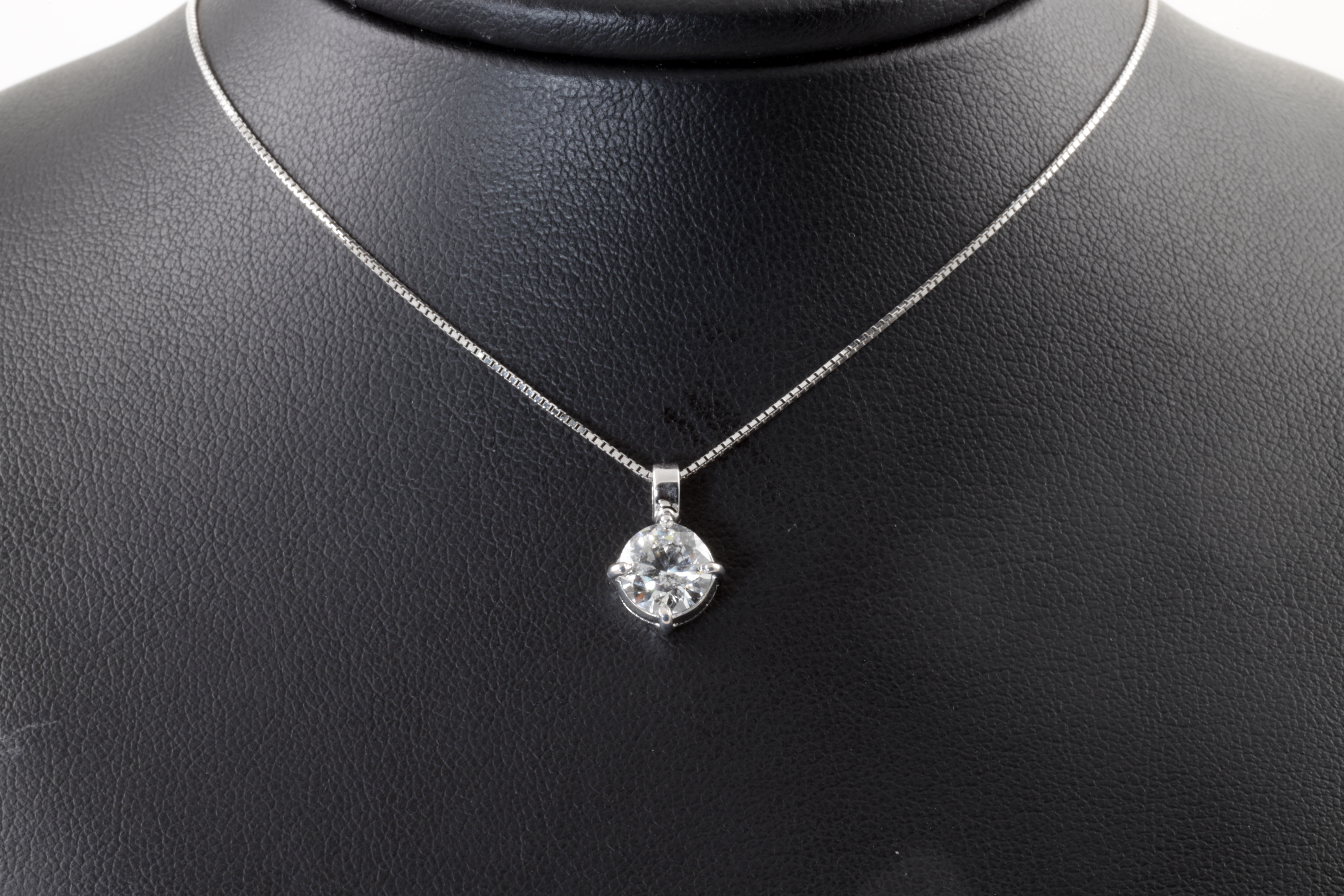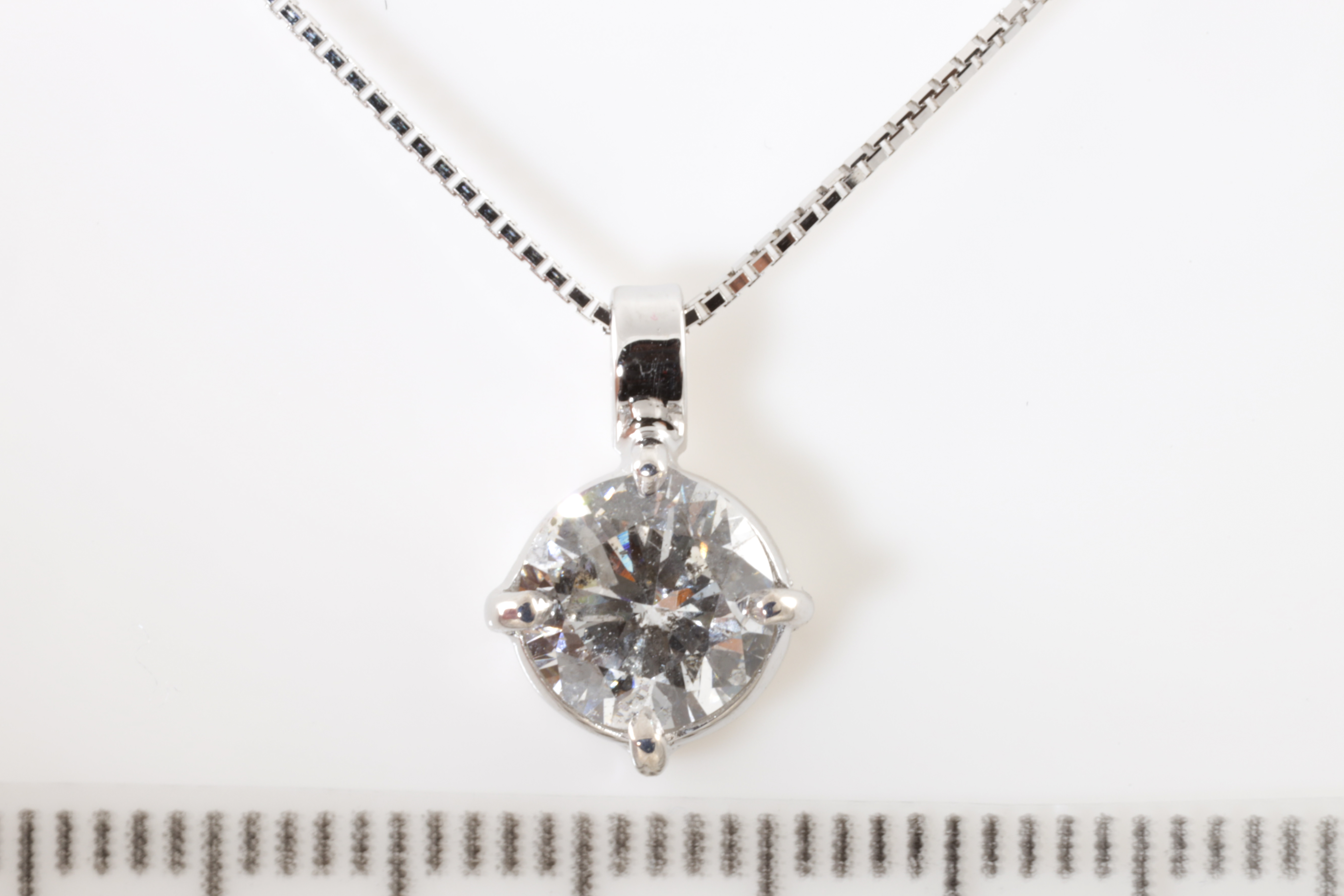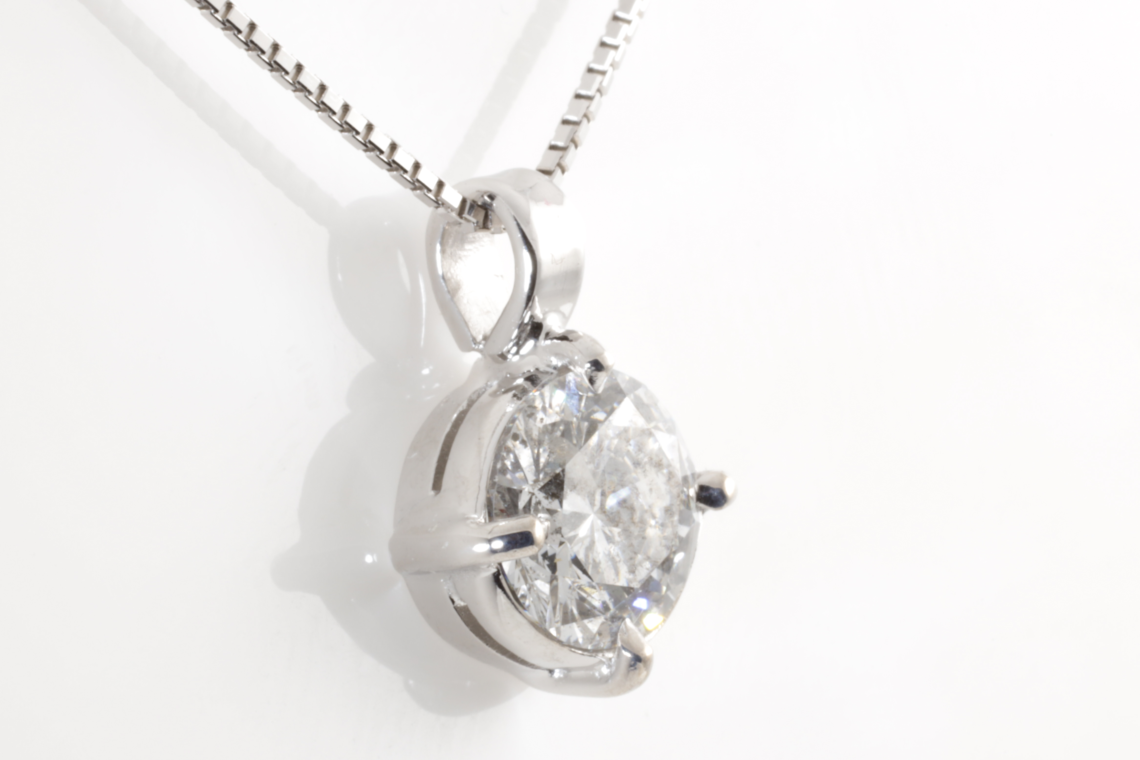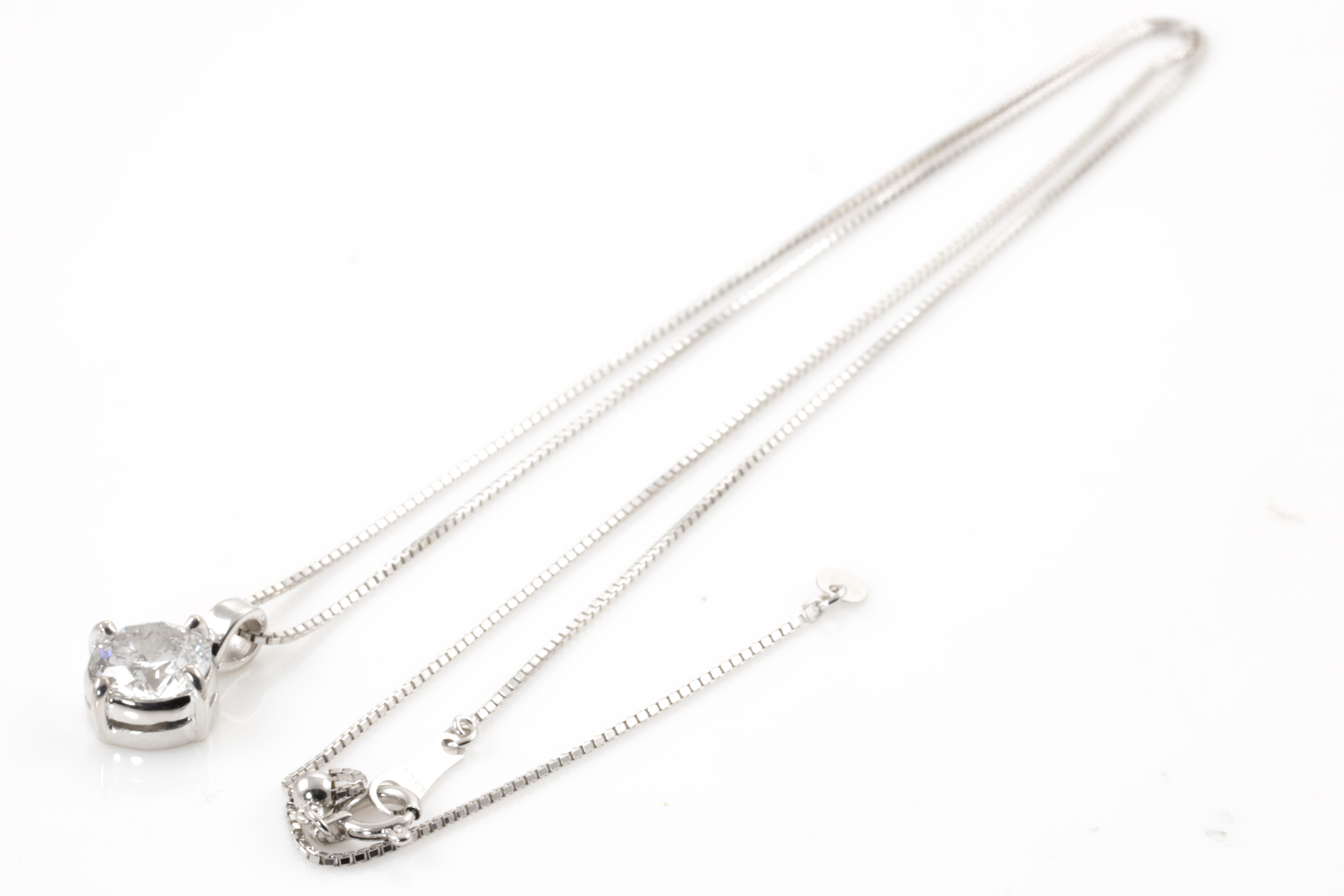 Diamond solitaire pendant with a round Brilliant Cut Diamond of 1.19ct (With GSL summary report graded as F P2, #AA 64943/2). 18ct white gold with adjustable 44cm chain. Weight: 3.4g. (Pre-owned)