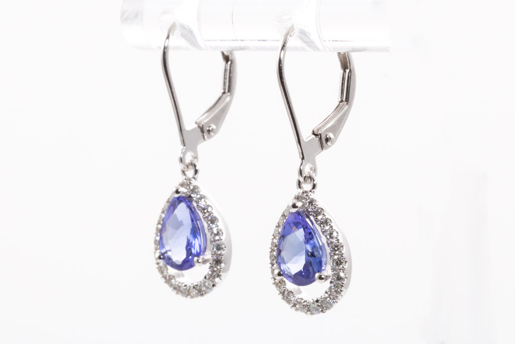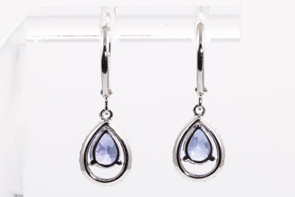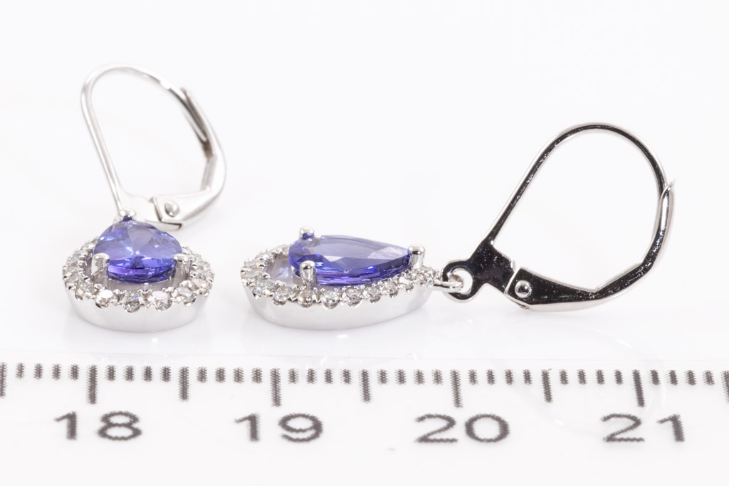 Tanzanite and Diamond leverback earrings with pear shape Tanzanites totalling 1.19cts and round Diamonds totalling 0.28cts. 18ct white gold. Weight: 2.7g. (New)