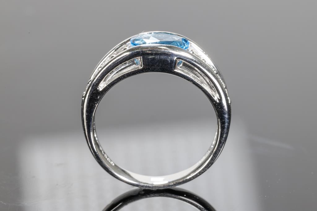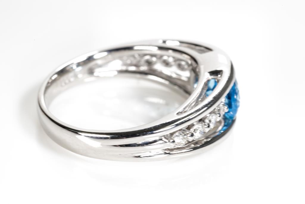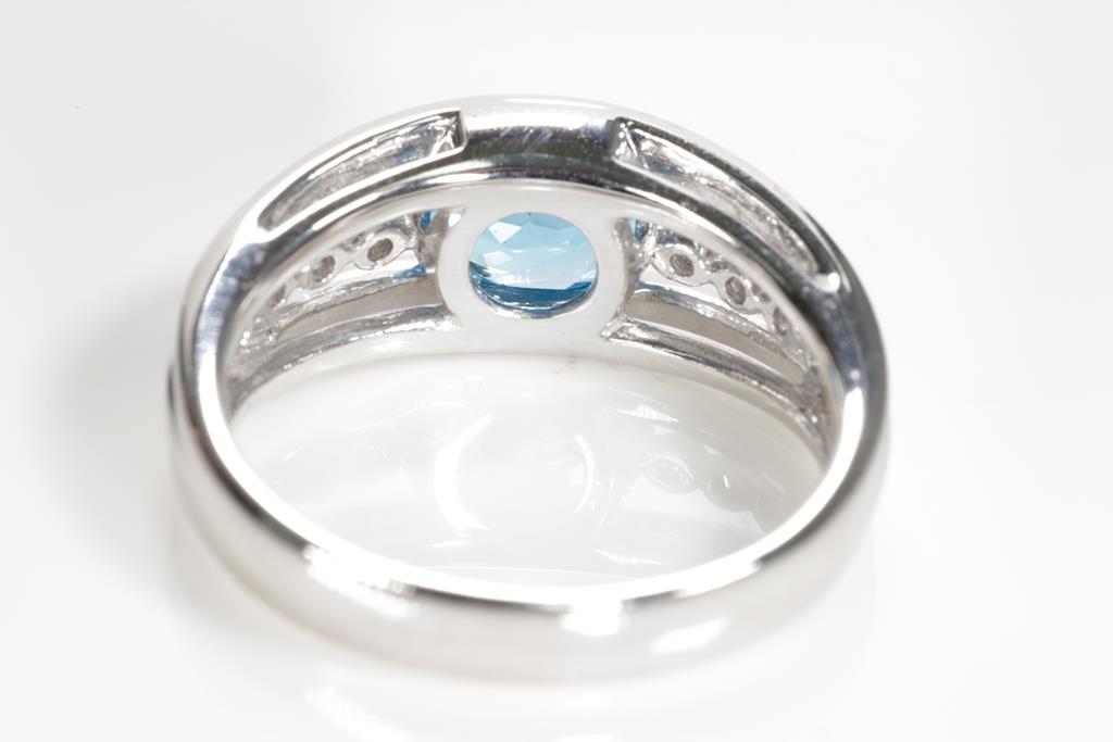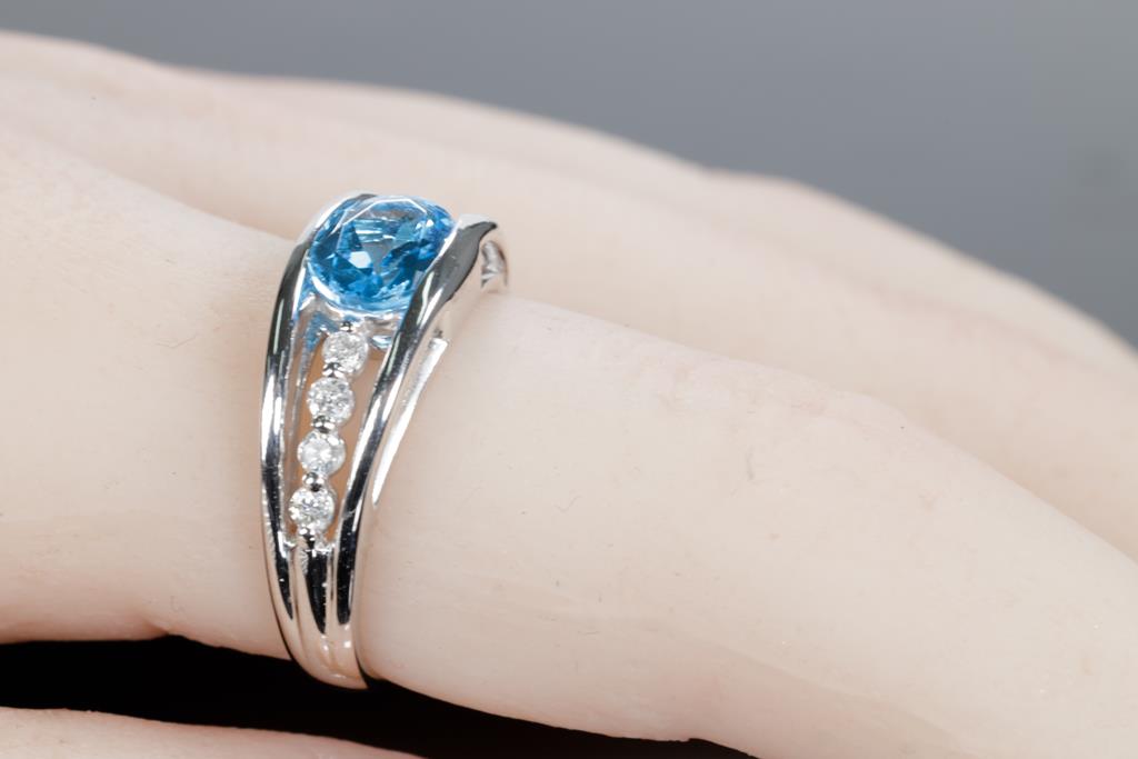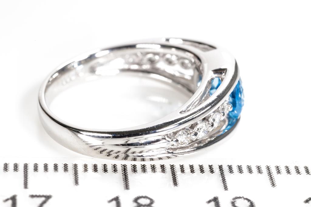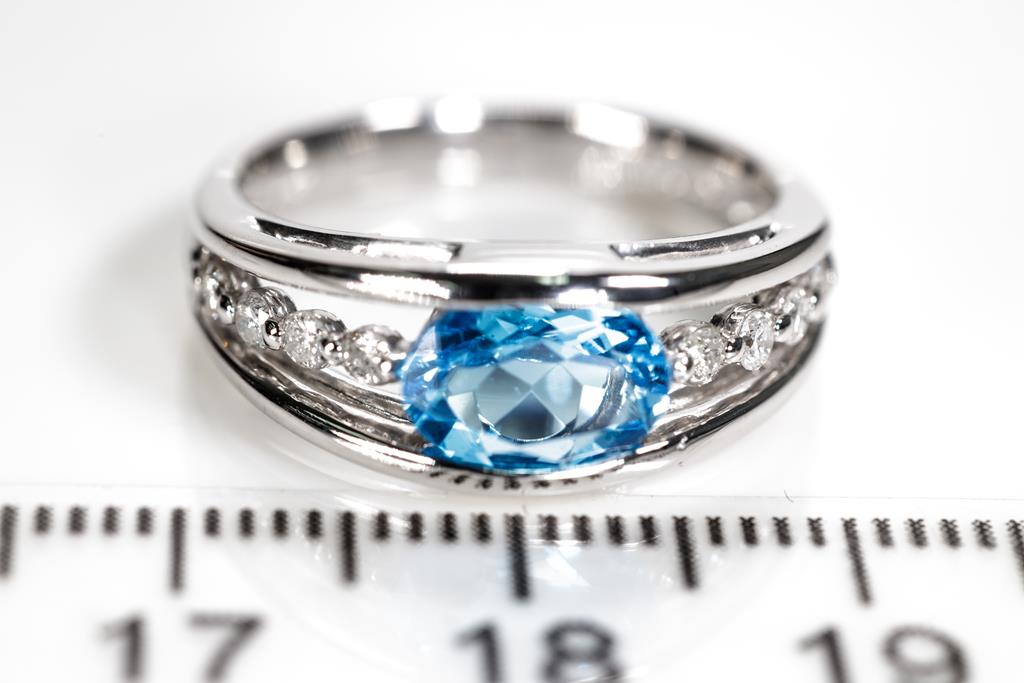 Topaz and Diamond ring with an oval shape blue Topaz of 1.19ct and round Diamonds totalling 0.18cts. Platinum. Ring size L1/2 - ring resizing is not recommended. Weight: 6.4g. (Pre-owned)