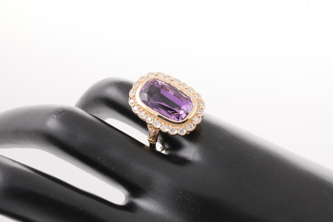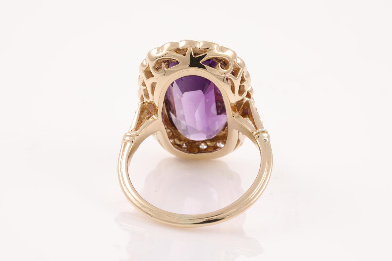 Amethyst and Diamond ring with centre oval shape Amethyst of 12ct and round Diamonds totalling approximately 0.72ct (Estimated grading H SI). 14ct rose gold. Ring K1/2. Weight 6.8g. (Pre-owned)