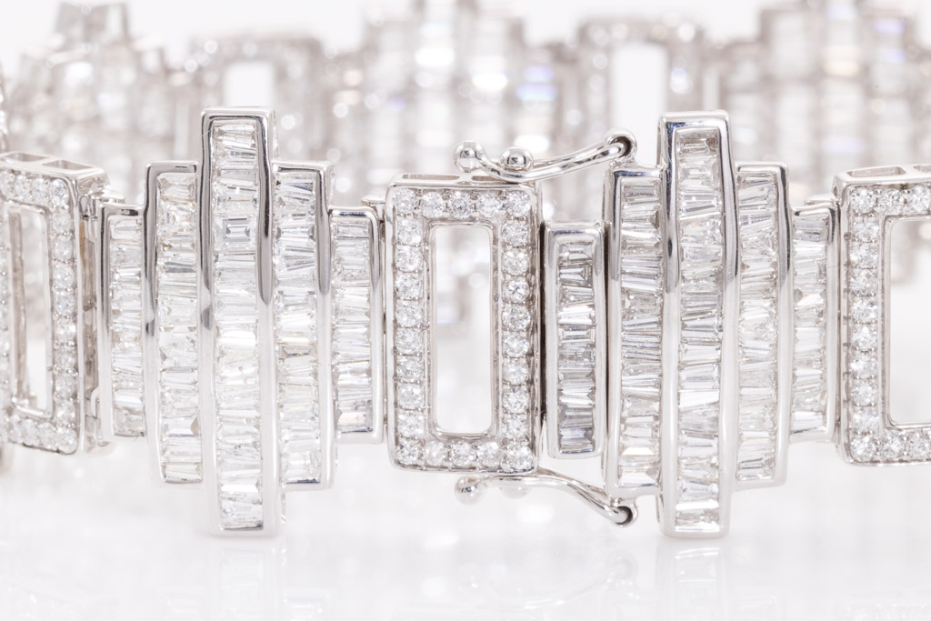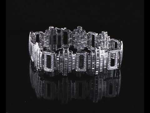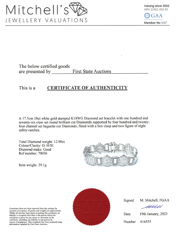 Diamond bracelet with round & baguette cut Diamonds totalling 12.00cts (Estimated grading: G-H SI). 18ct white gold. Length: 17.5cm. Weight: 29.1g. With certificate #416555. (Pre-owned)