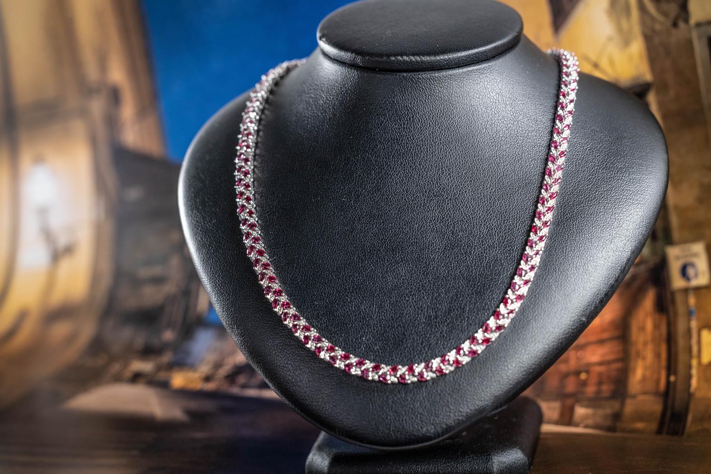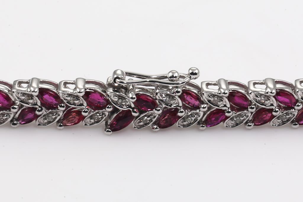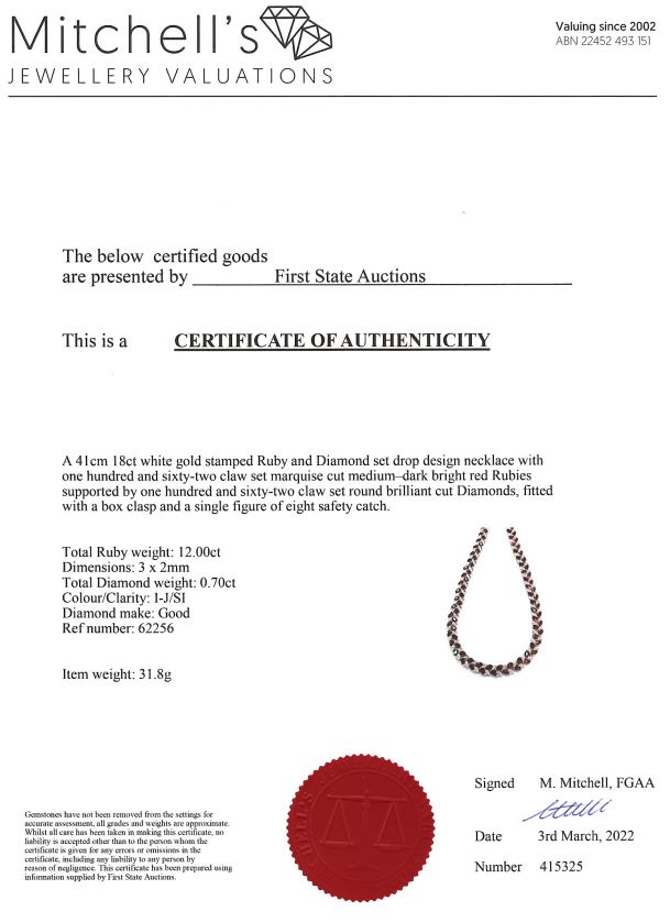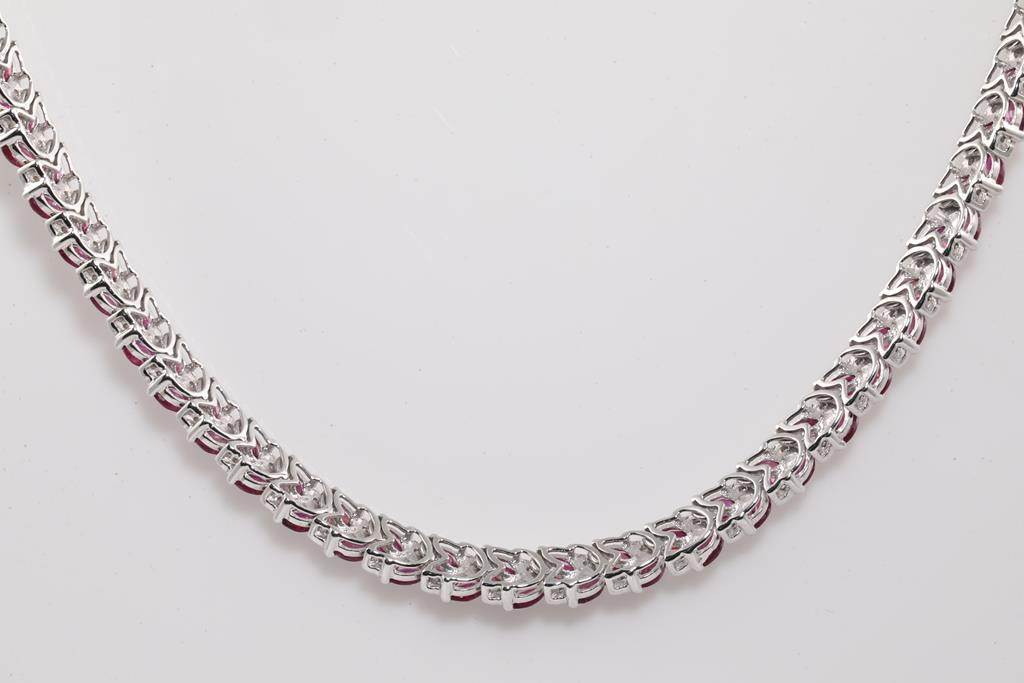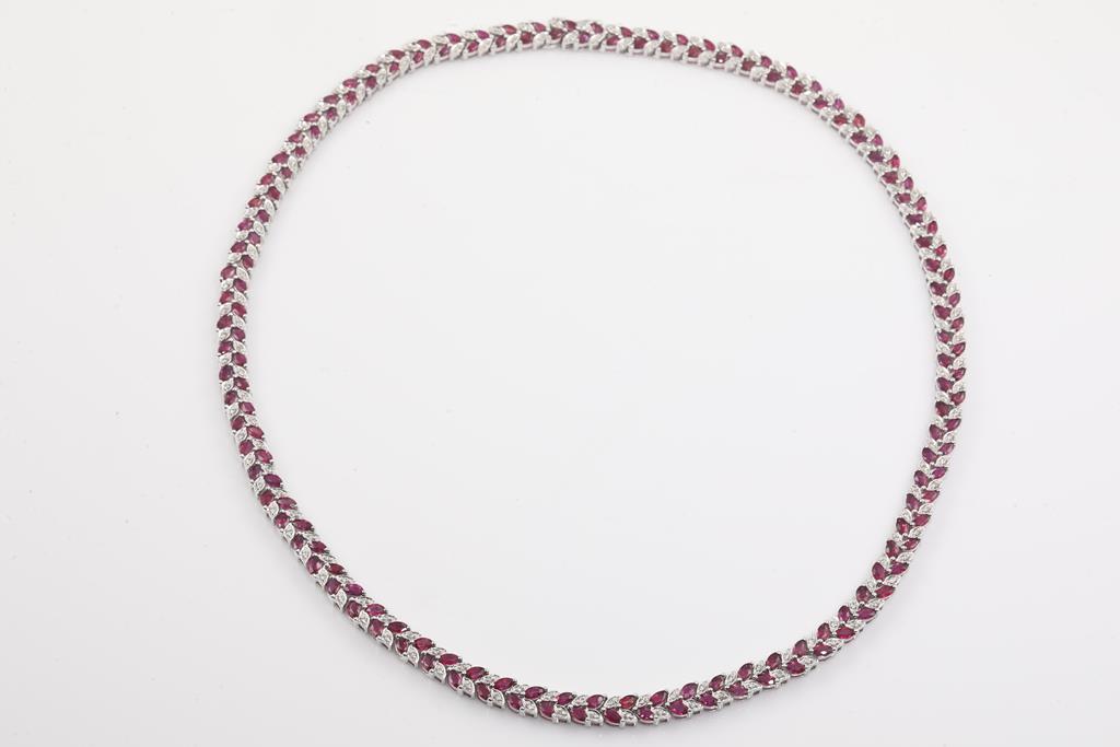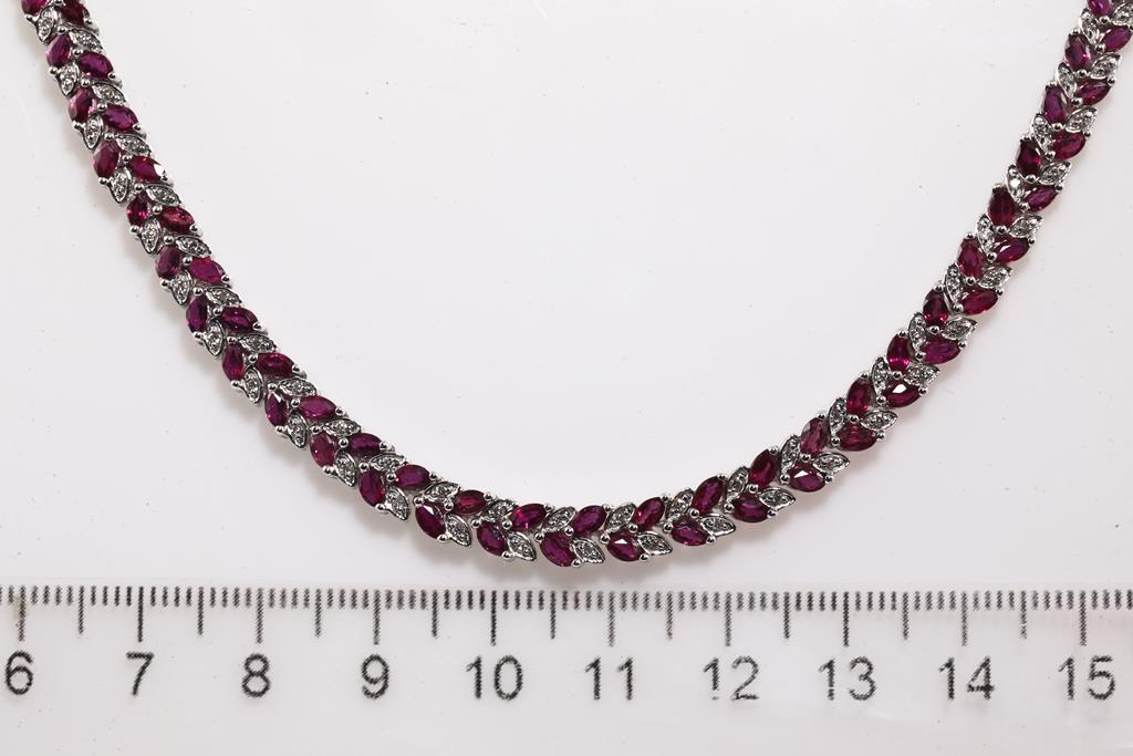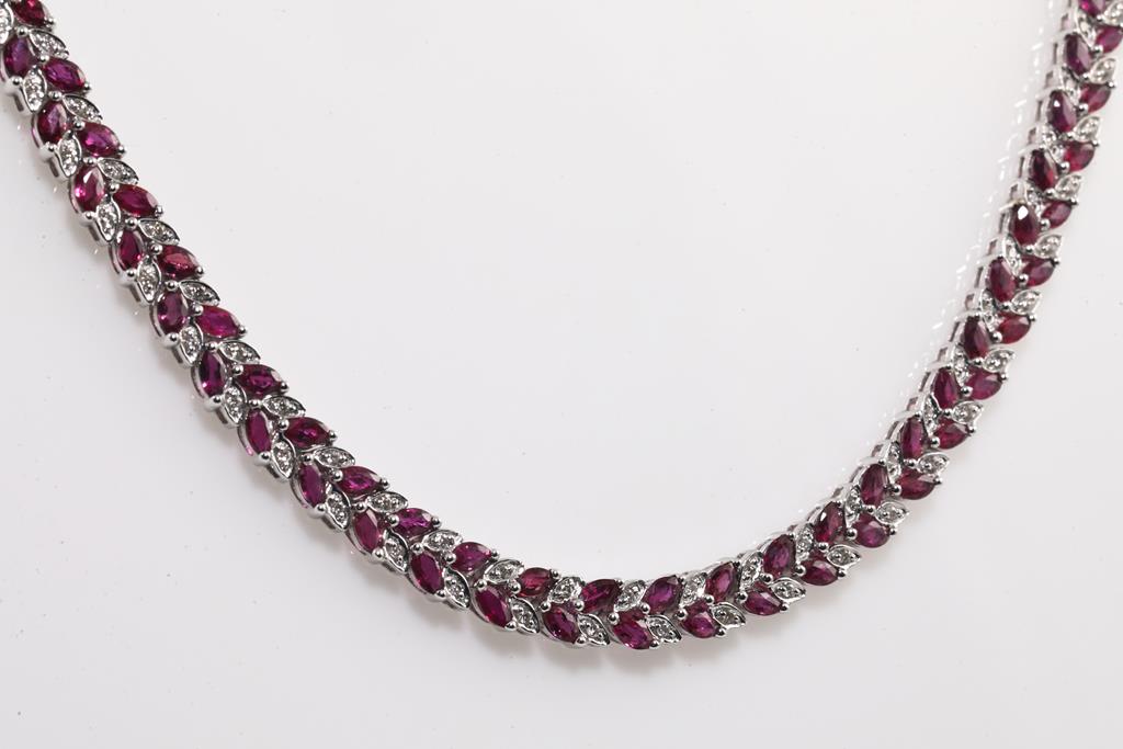 Ruby and Diamond necklace with marquise cut Rubies totalling 12.00cts and round Diamonds totalling 0.70cts (Estimated grading: I-J SI). 18ct white gold. Length: 41cm Weight: 31.8g. With certificate #415325. (Pre-owned)