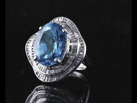 Topaz and Diamond ring with oval shape blue Topaz of 12.02ct and baguette cut Diamonds totalling 1.17cts (Estimated grading: G-H SI). Platinum. Ring size L1/2 - ring resizing is not recommended. Weight: 18.9g. (Pre-owned)