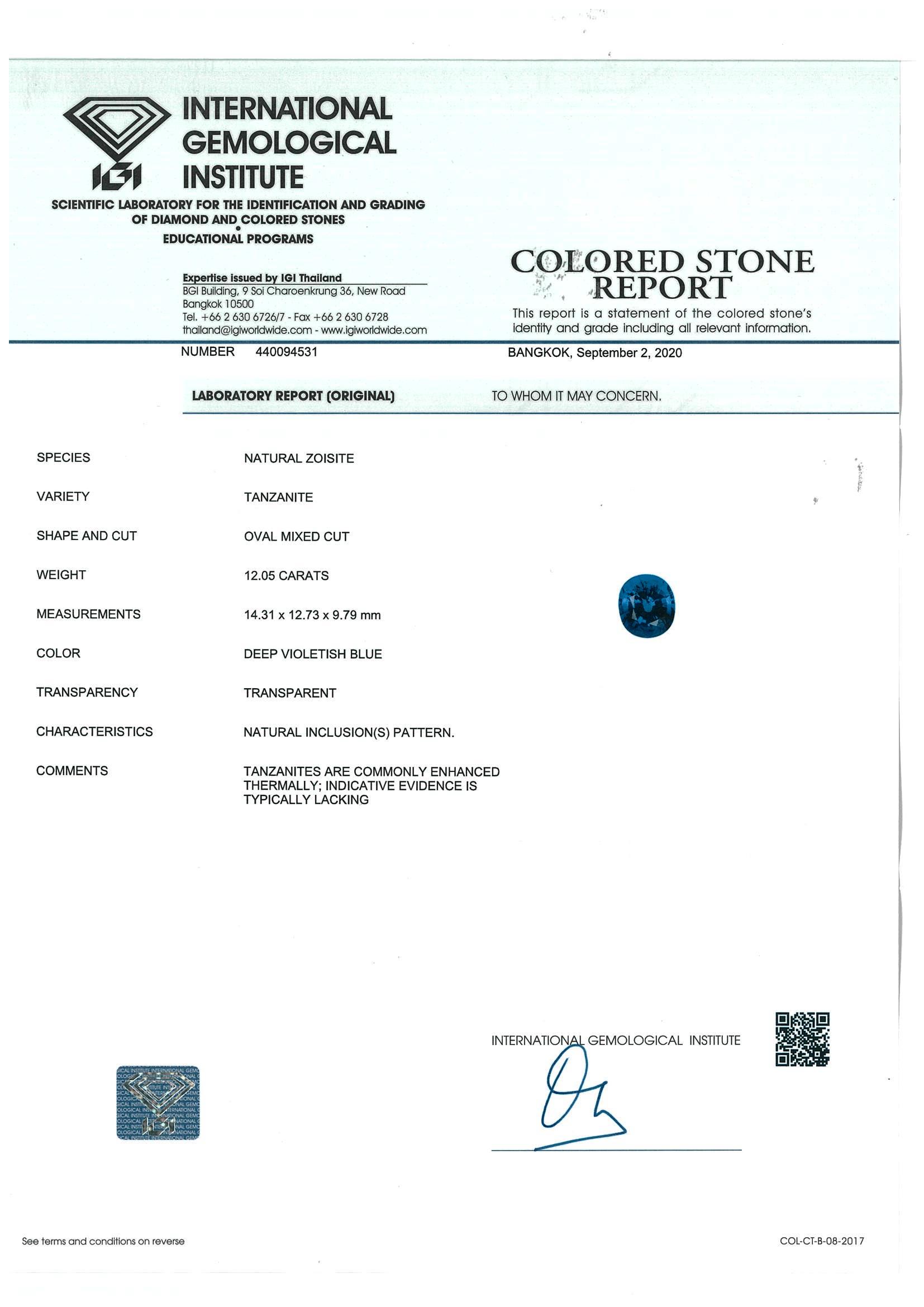 A loose oval shape Tanzanite of 12.05ct (with IGI report #440094531). Size: 14.31 x 12.73 x 9.79mm. (New)