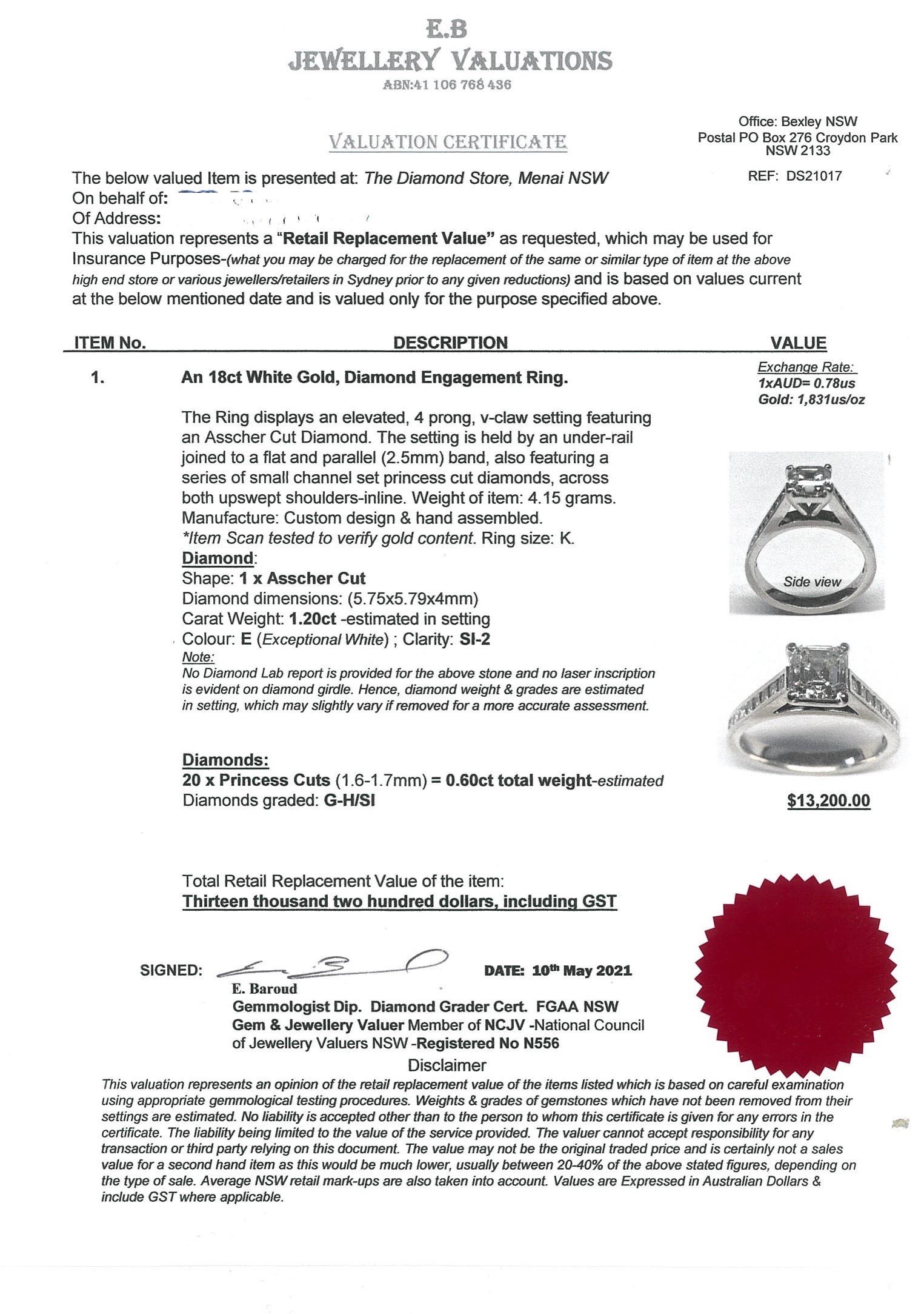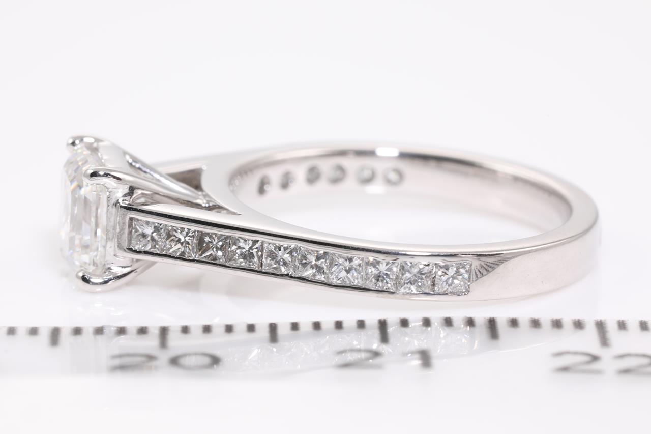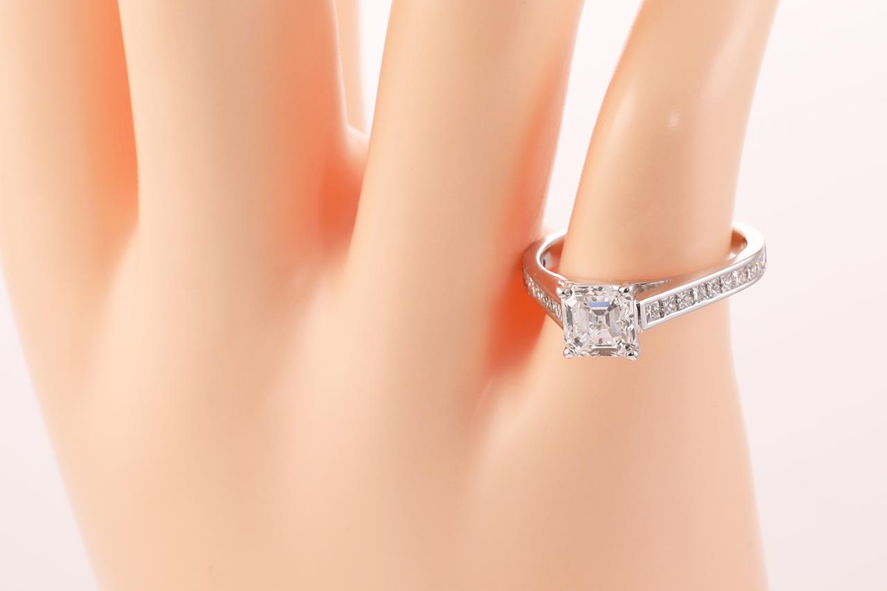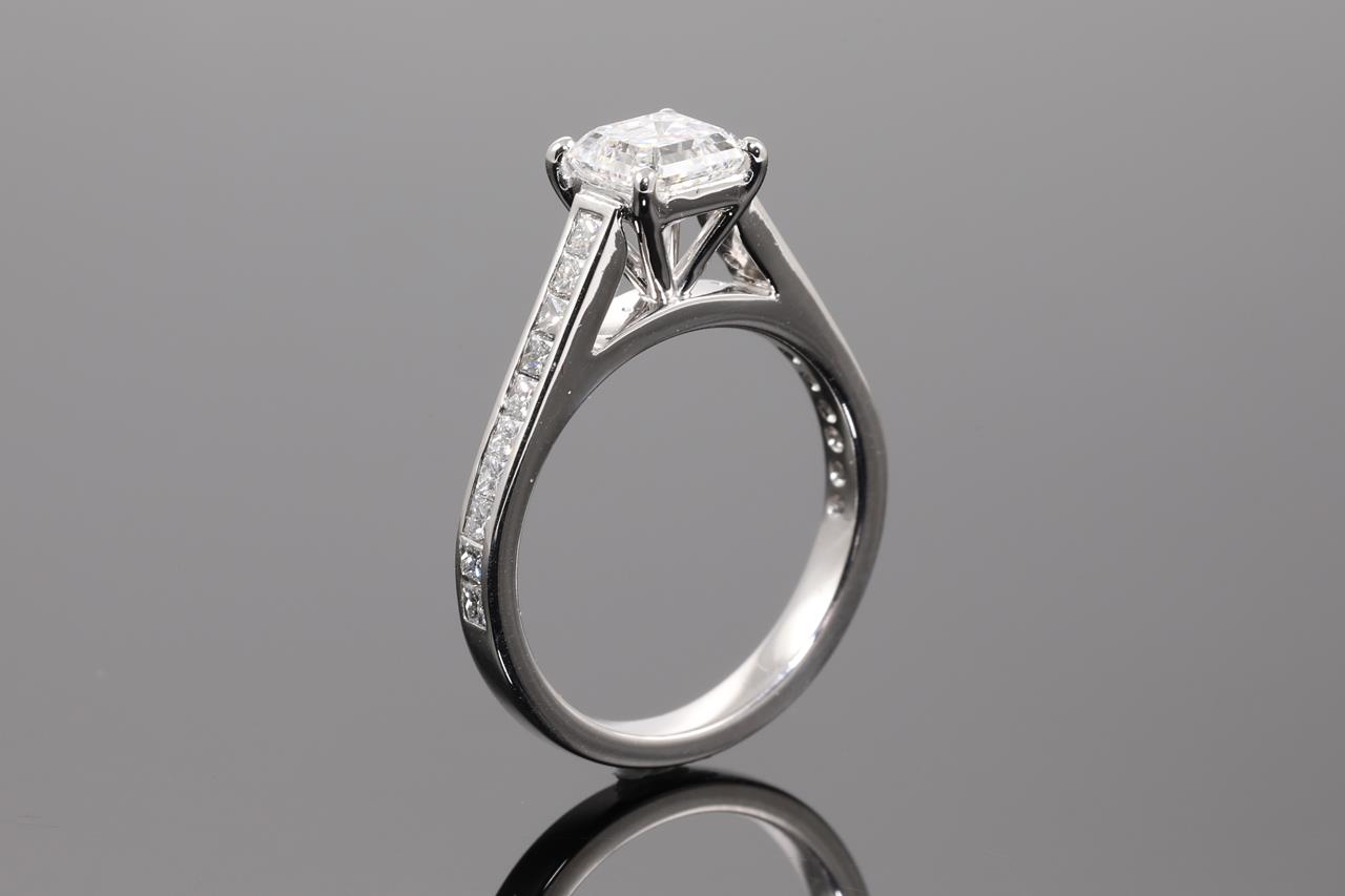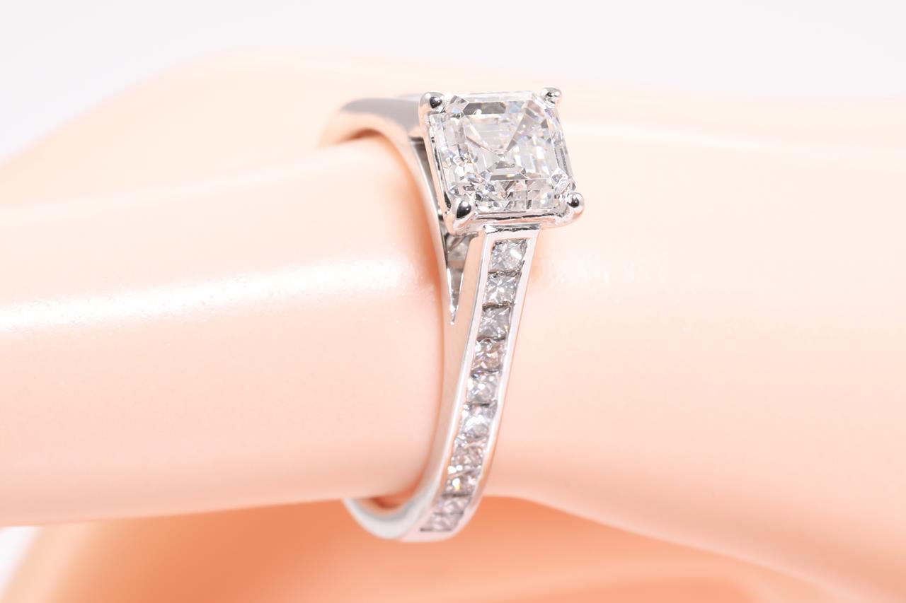 Diamond ring with centre Asscher cut Diamond of approximately 1.20ct (Estimated grading: E SI2) and twenty princess Diamonds totalling approximately 0.60cts (Estimated grading G-H SI). 18ct white gold. Ring size K. Weight 4.01g. With valuation dated 10/05/21. (Pre-owned)