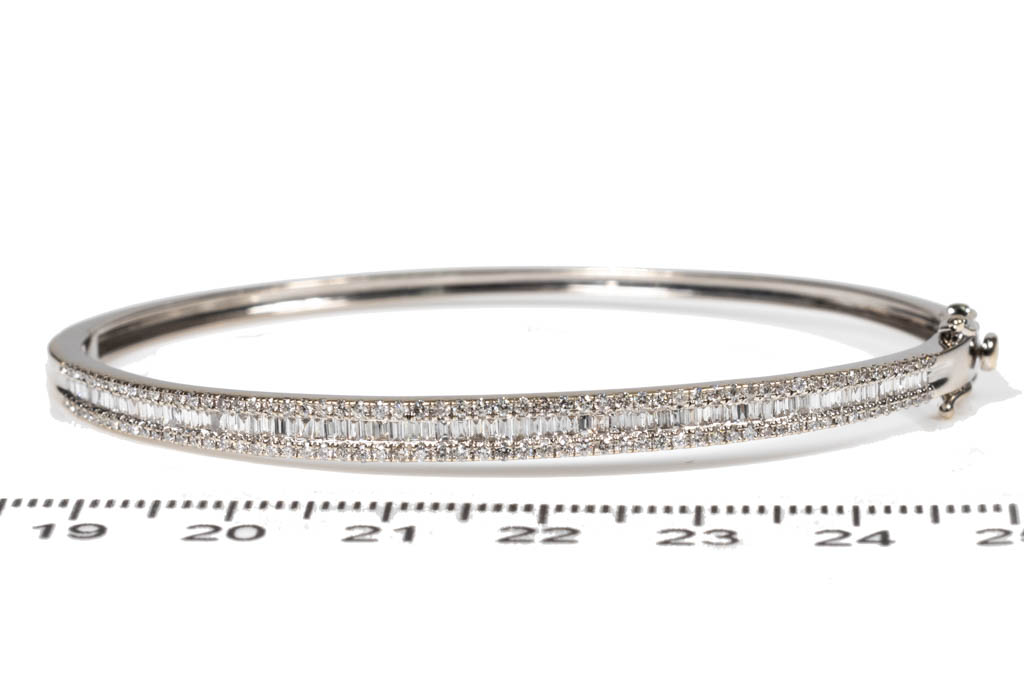 Diamond bangle with with round and baguette cut Diamonds totalling 1.20cts (Estimated grading:H-I SI). Inner circumference: 16.5cm. 18ct white gold. Weight: 8.2g. (Pre-owned)