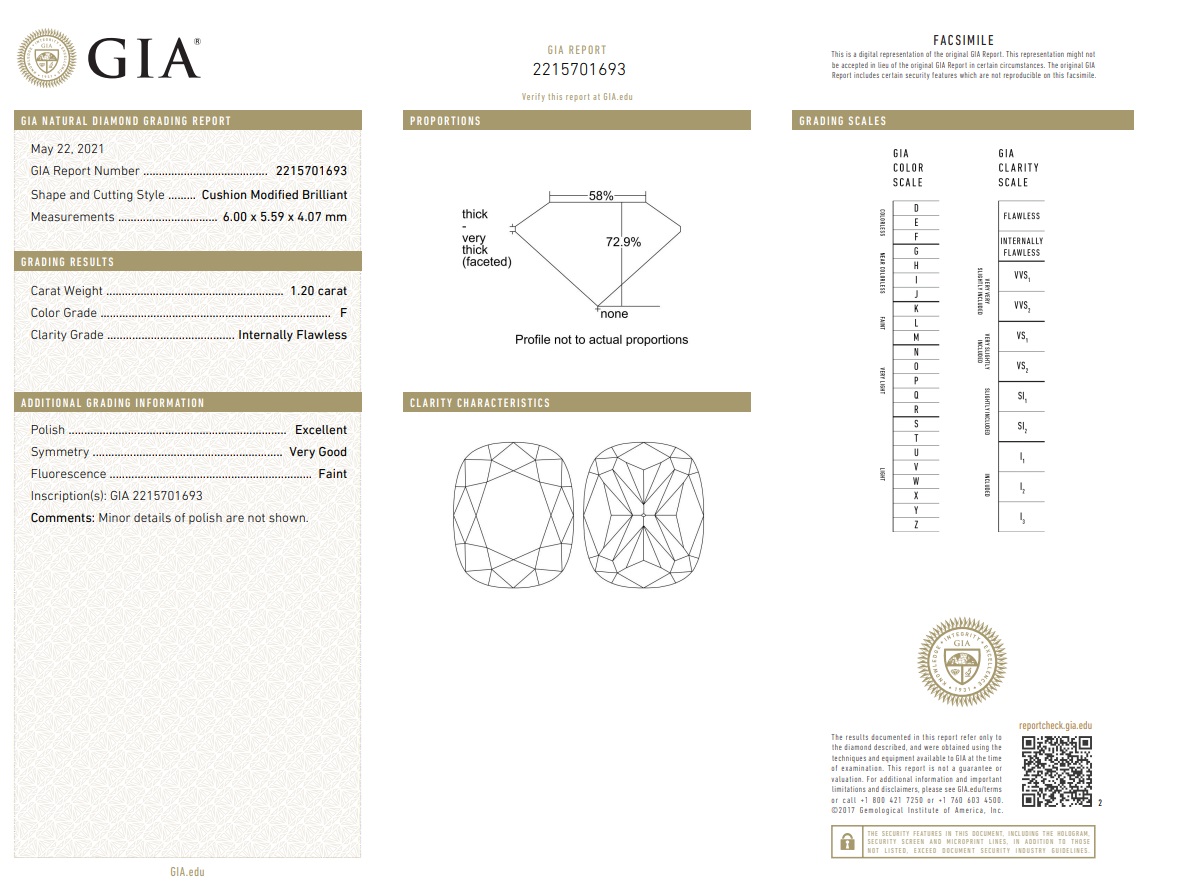 A loose cushion cut Diamond of 1.20ct (With GIA report graded as F Internally Flawless #2215701693). (New)