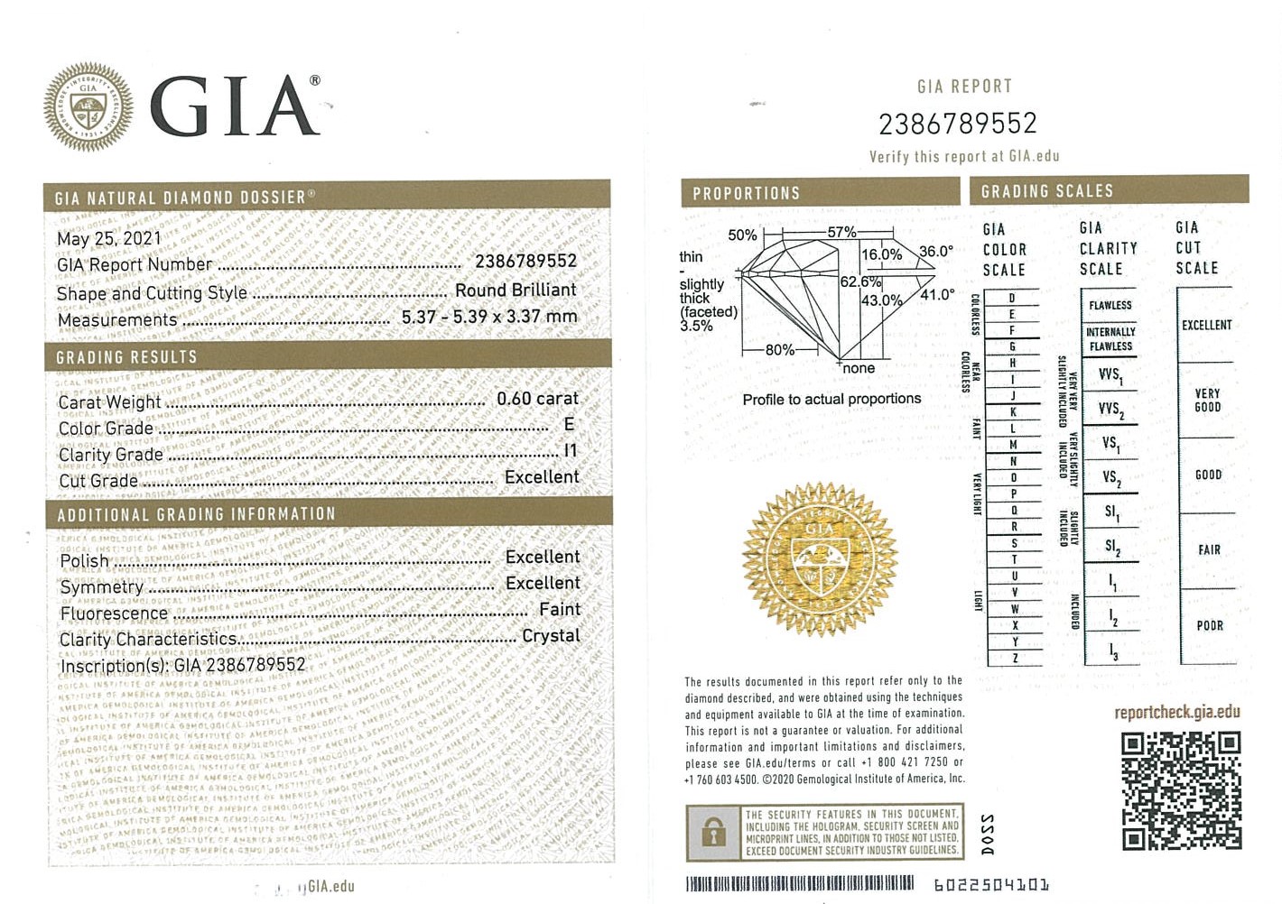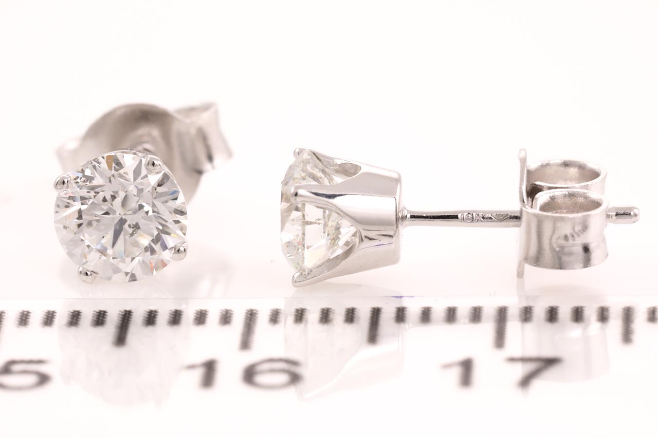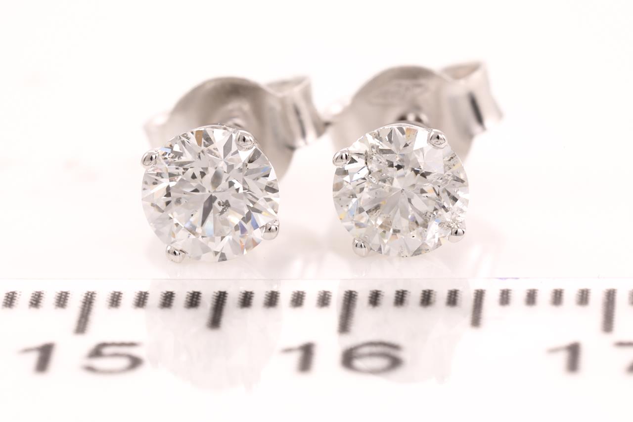 Diamond stud earrings with 2 round brilliant cut Diamonds totalling 1.20cts (both with GIA summary reports graded as E P1 & F P1 #2386789552, 1309974668). 18ct white gold. Weight: 1.6g. (New)