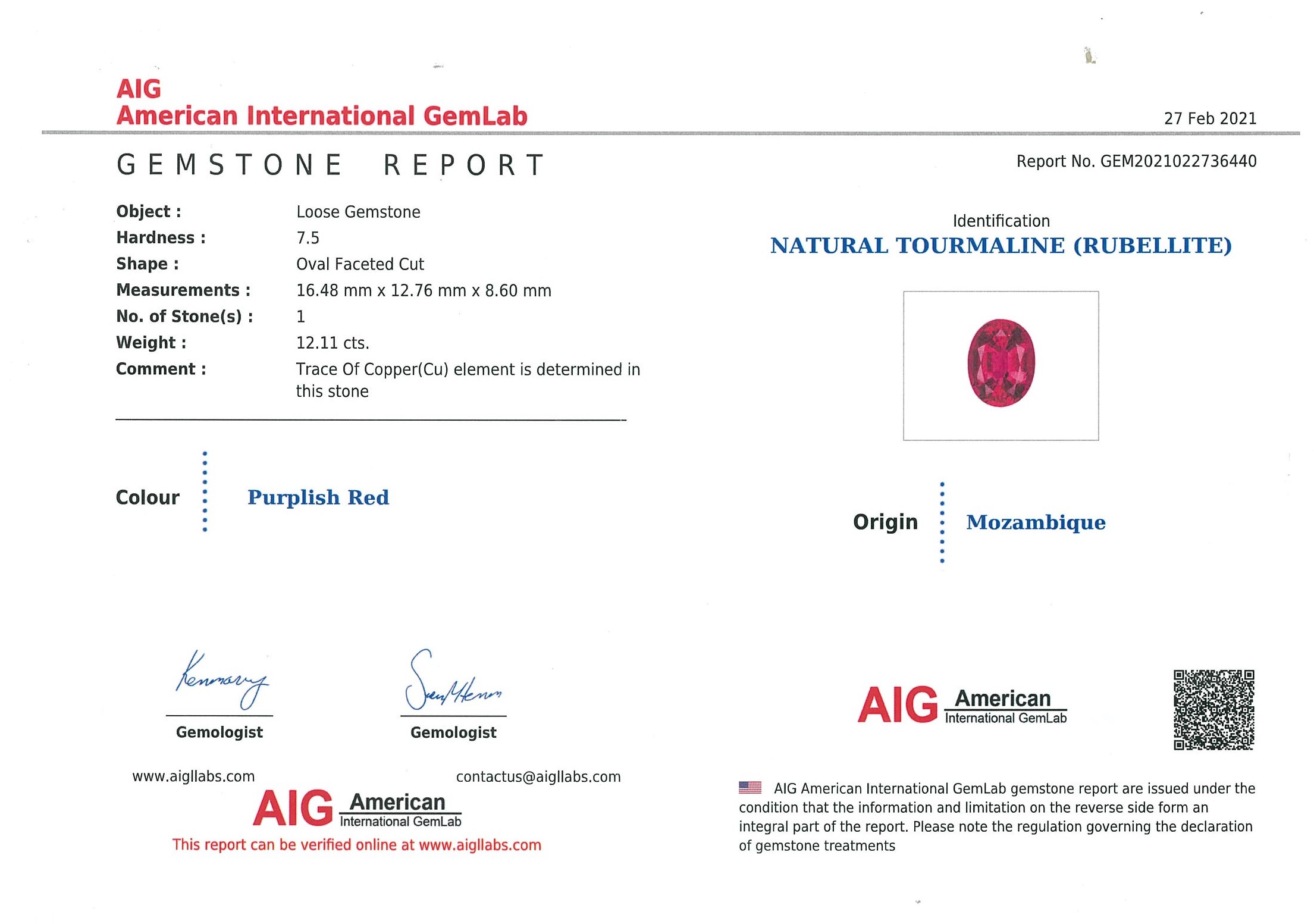 A loose oval shape Rubellite of 12.11ct. With AIG report dated 27/02/2021. Origin: Mozambique. (As new)